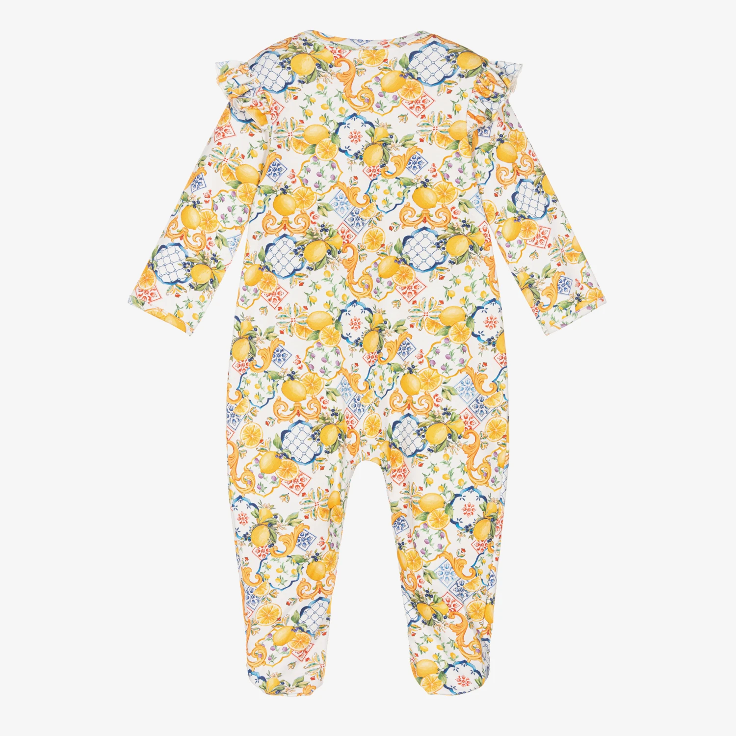 Pretty babygrow for girls by My Little Pie, made in super soft organic Supima cotton jersey. The white background is patterned with a vibrant lemon print. There are pretty ruffle trims over the shoulders and popper fastenings on the front and between the legs.