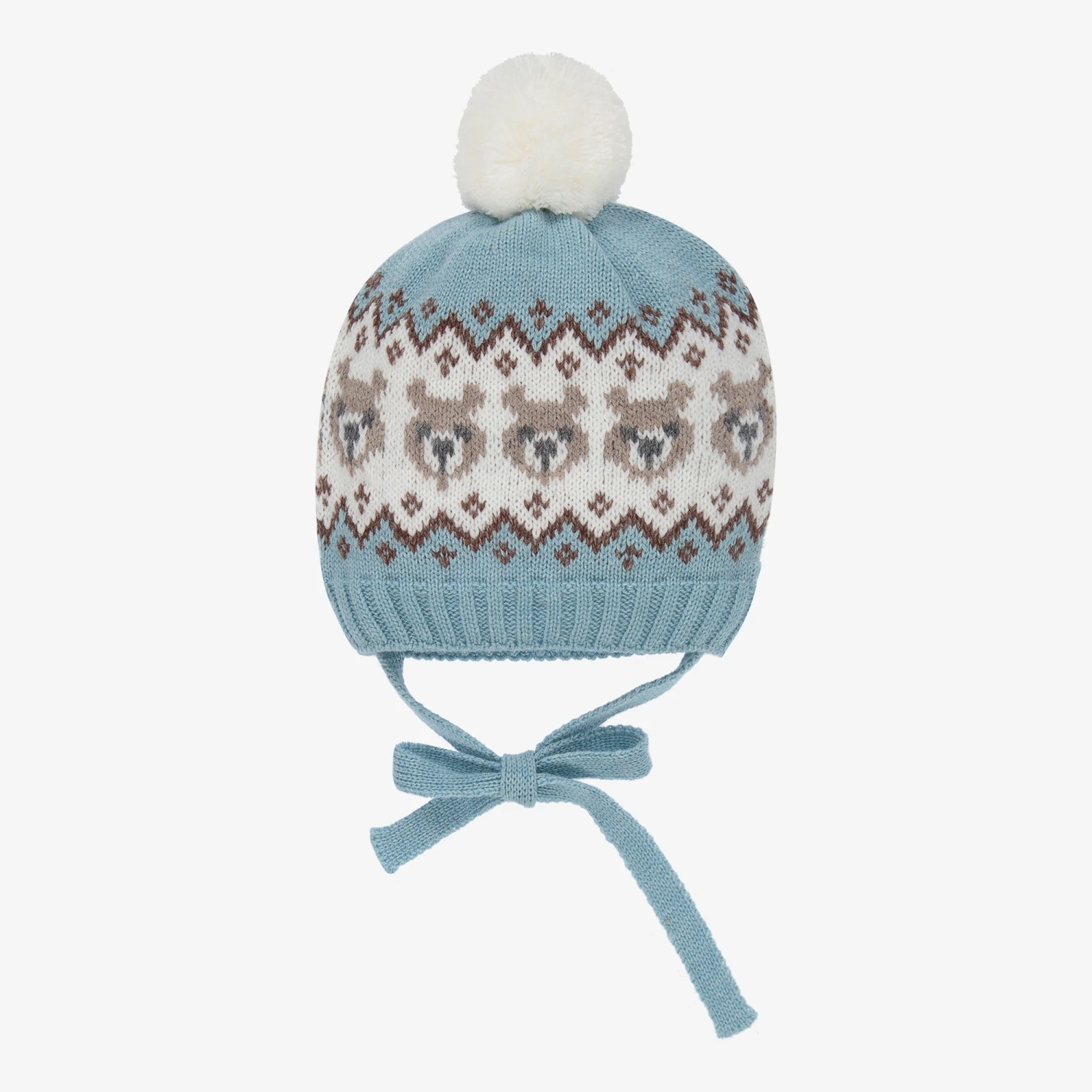 Pale blue hat for baby boys and girls by Paloma de la O, knitted in a soft wool blend. With an ivory pom-pom on top, it has a cute ivory and brown bear pattern all around, and knitted ties to secure it under the chin.
