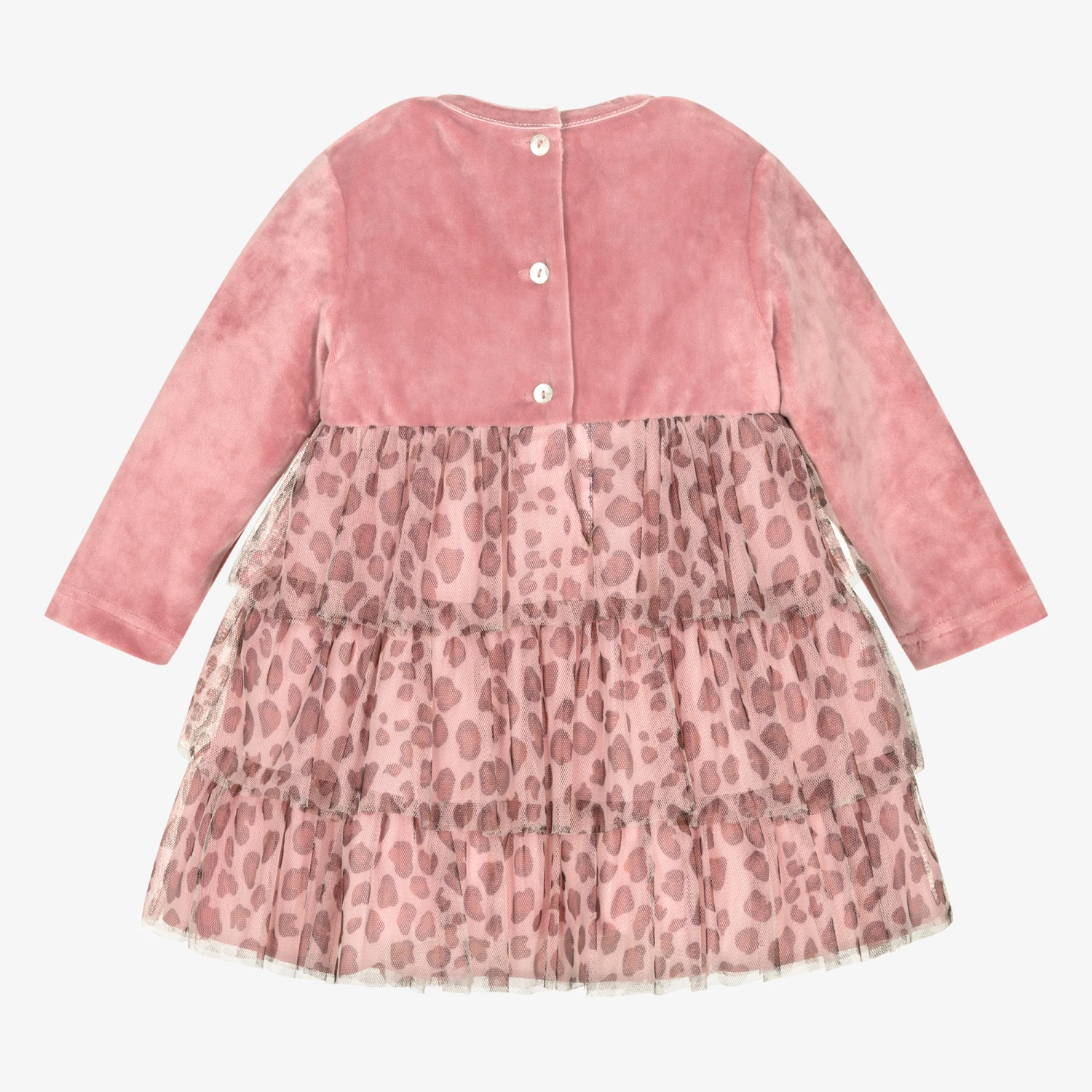 An adorable pink long-sleeved dress for baby girls by Pan Con Chocolate. The bodice is made from super soft velour with a gold logo charm on the front and branded button fastenings on the back. Lined in lightweight cotton, the tiered skirt is made from pretty leopard print tulle to complete the fun and girly look.