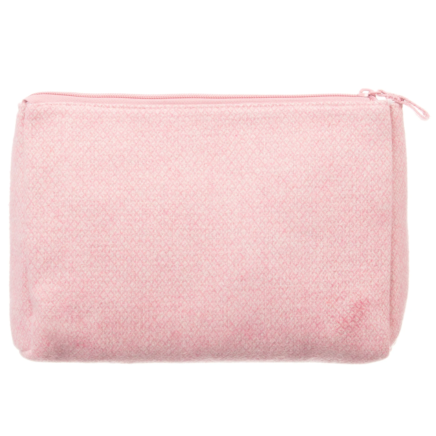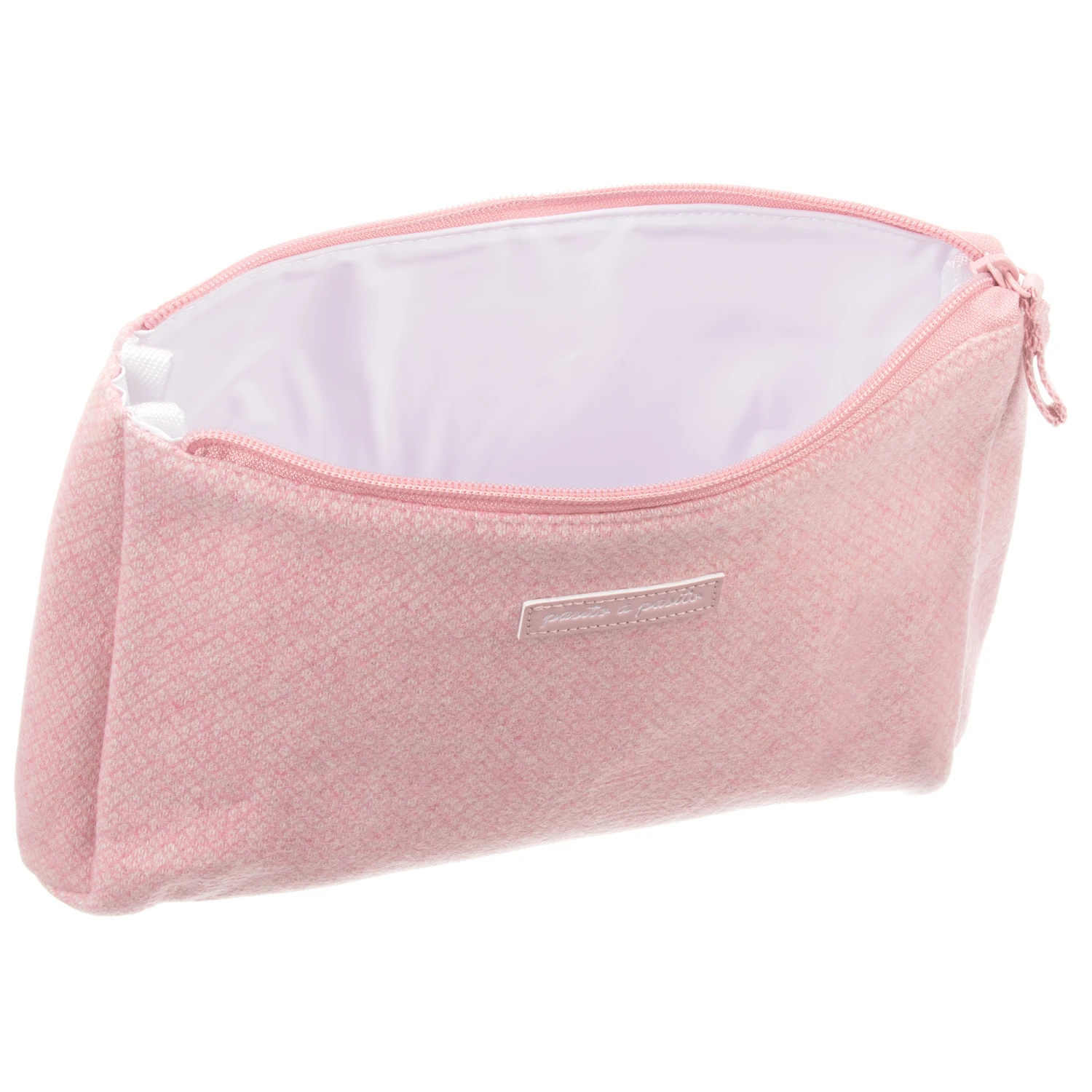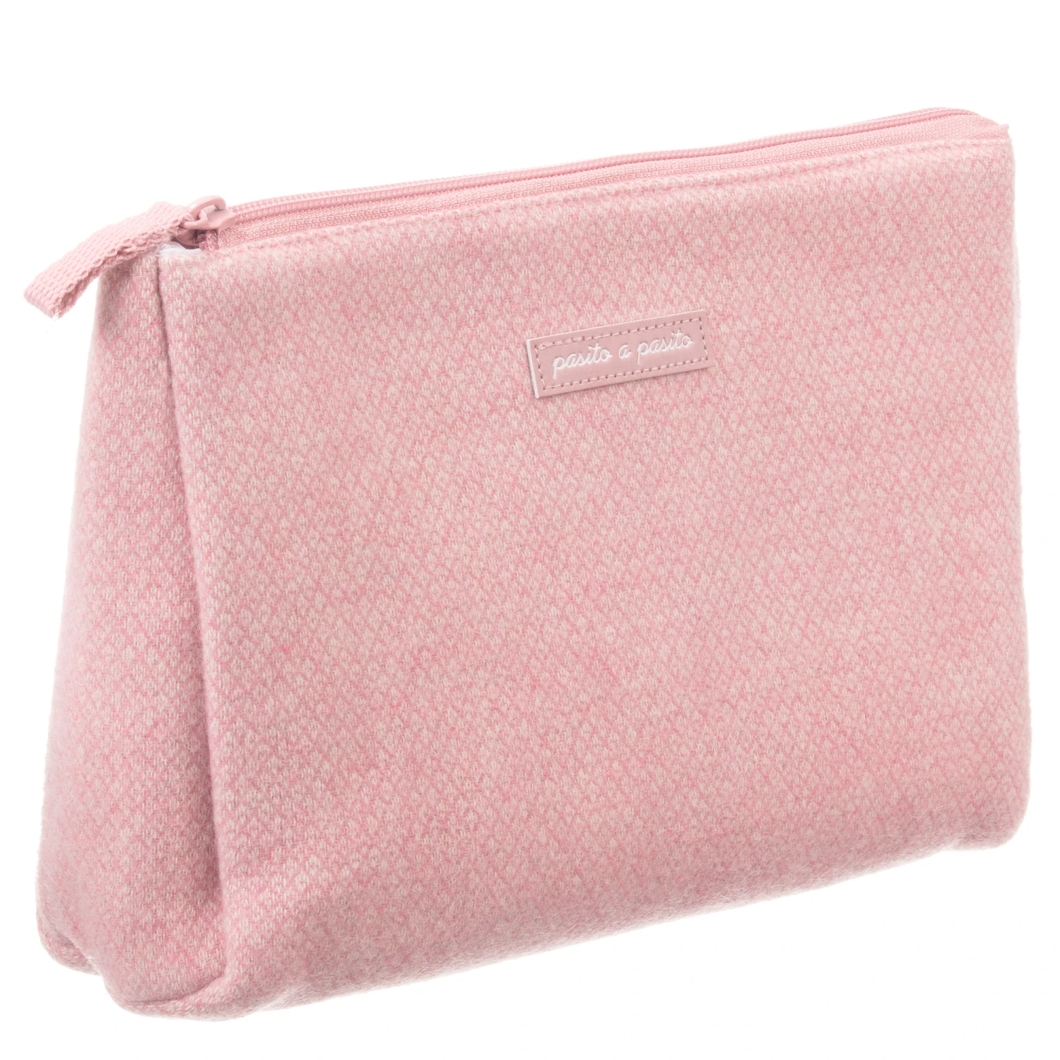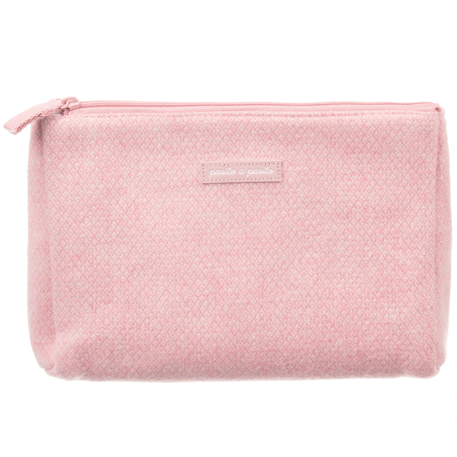 Pink Teflon coated, wool blend wash bag by Pasito a Pasito. Zip fastening, It has one main compartment and a plastic lining. This versatile bag can be used to keep all of baby’s essentials in one place, or it can be used to store older children’s toiletries.