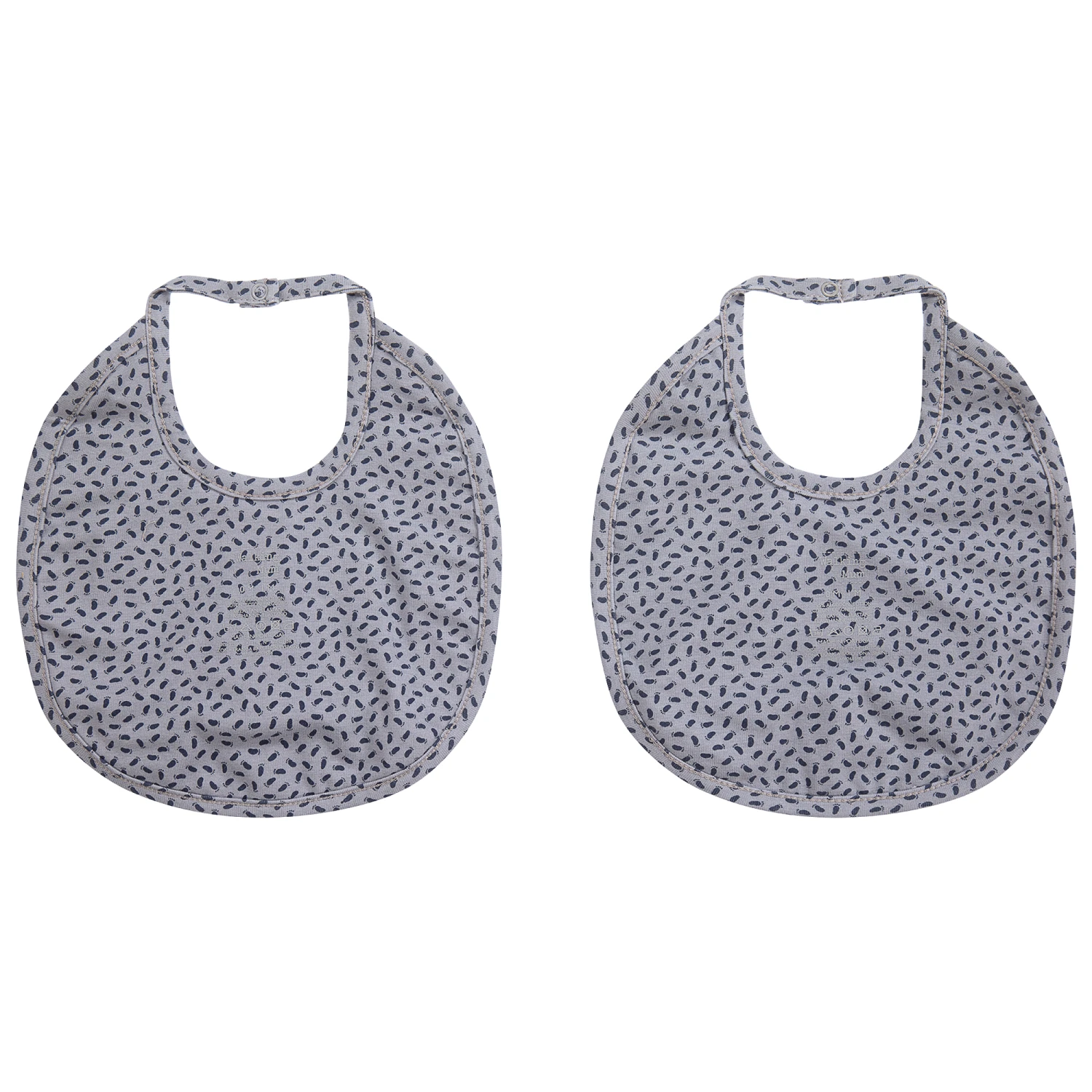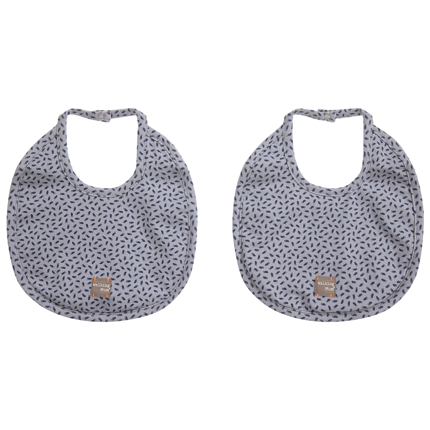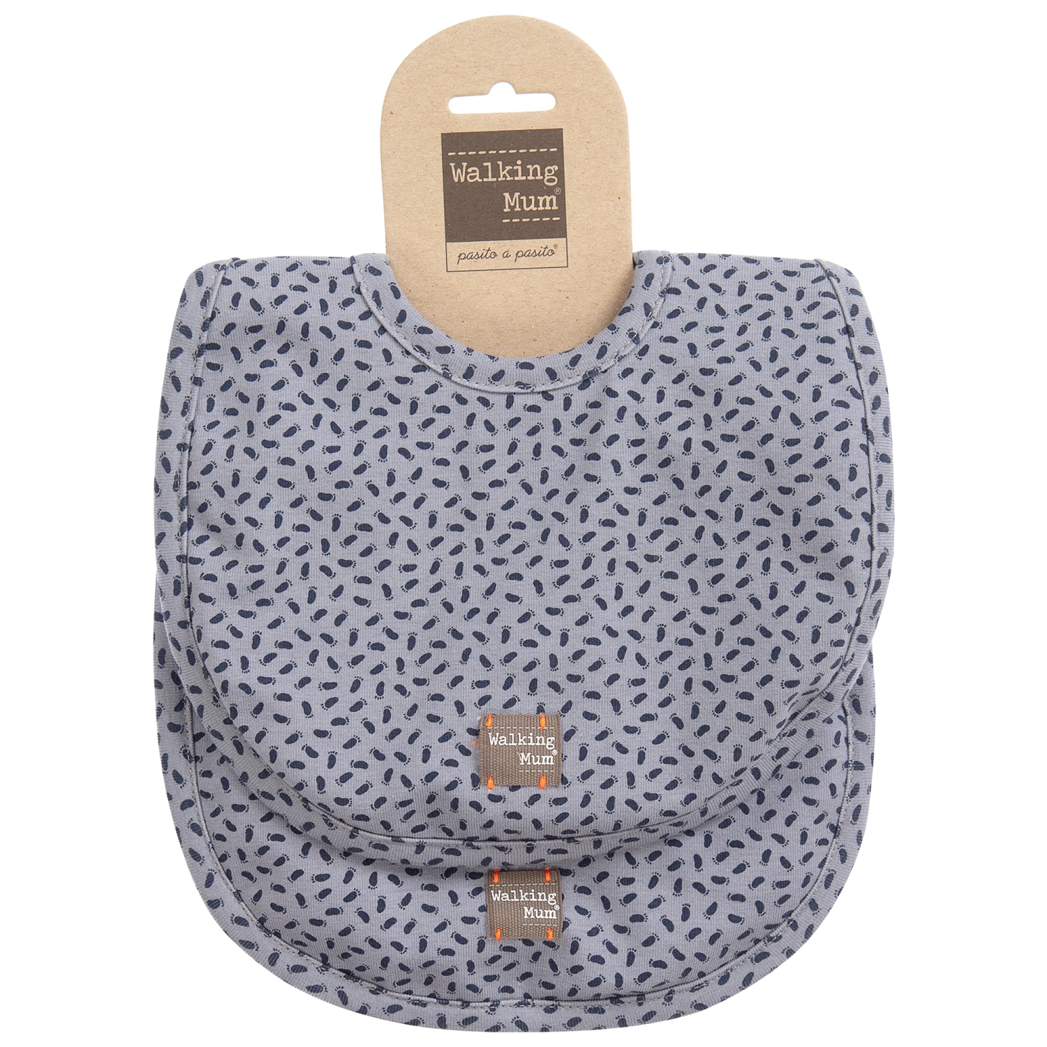 Grey cotton jersey baby bibs by Pasito a Pasito Walking Mum, with a navy blue foot print.