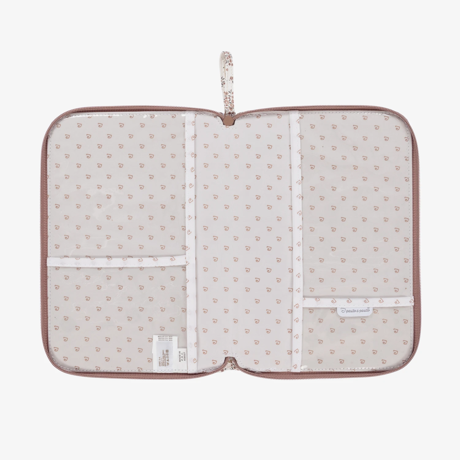 Stylish ivory and brown floral baby document holder by Pasito a Pasito. Made in soft faux leather, it has four internal pockets, ideal for keeping your little one’s documents and medical records. It has a smooth beige lining with a sweet teddy pattern and it fastens with a zip.