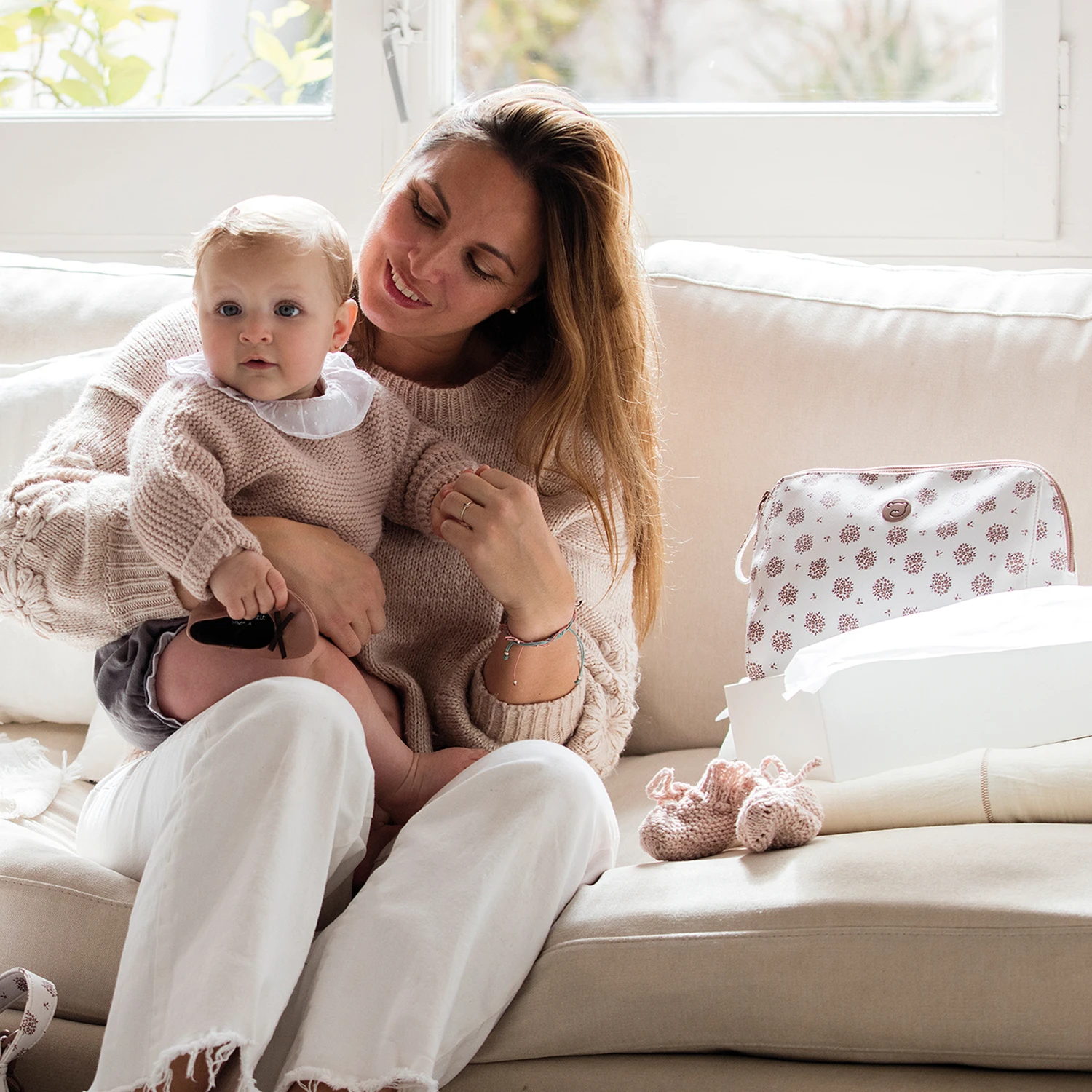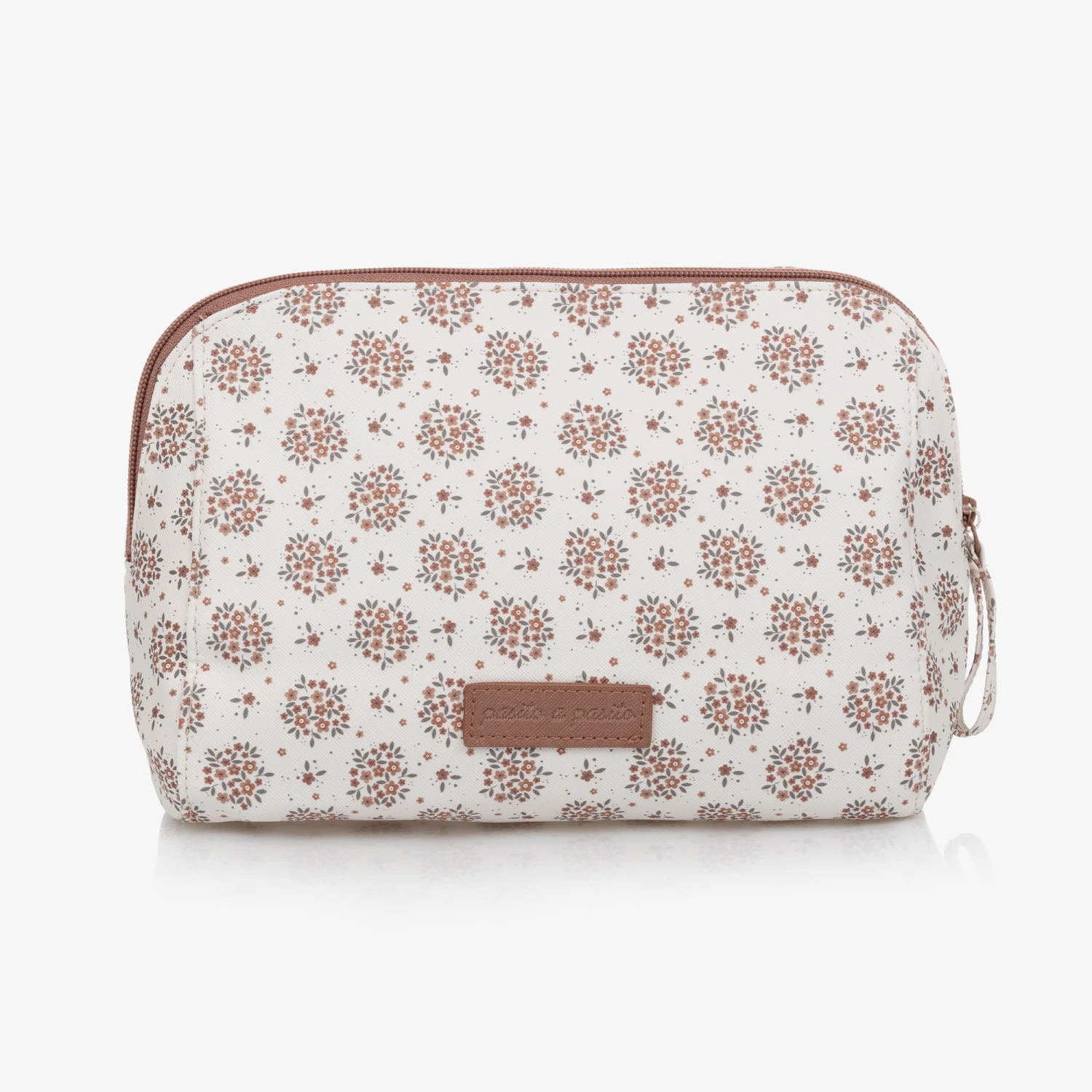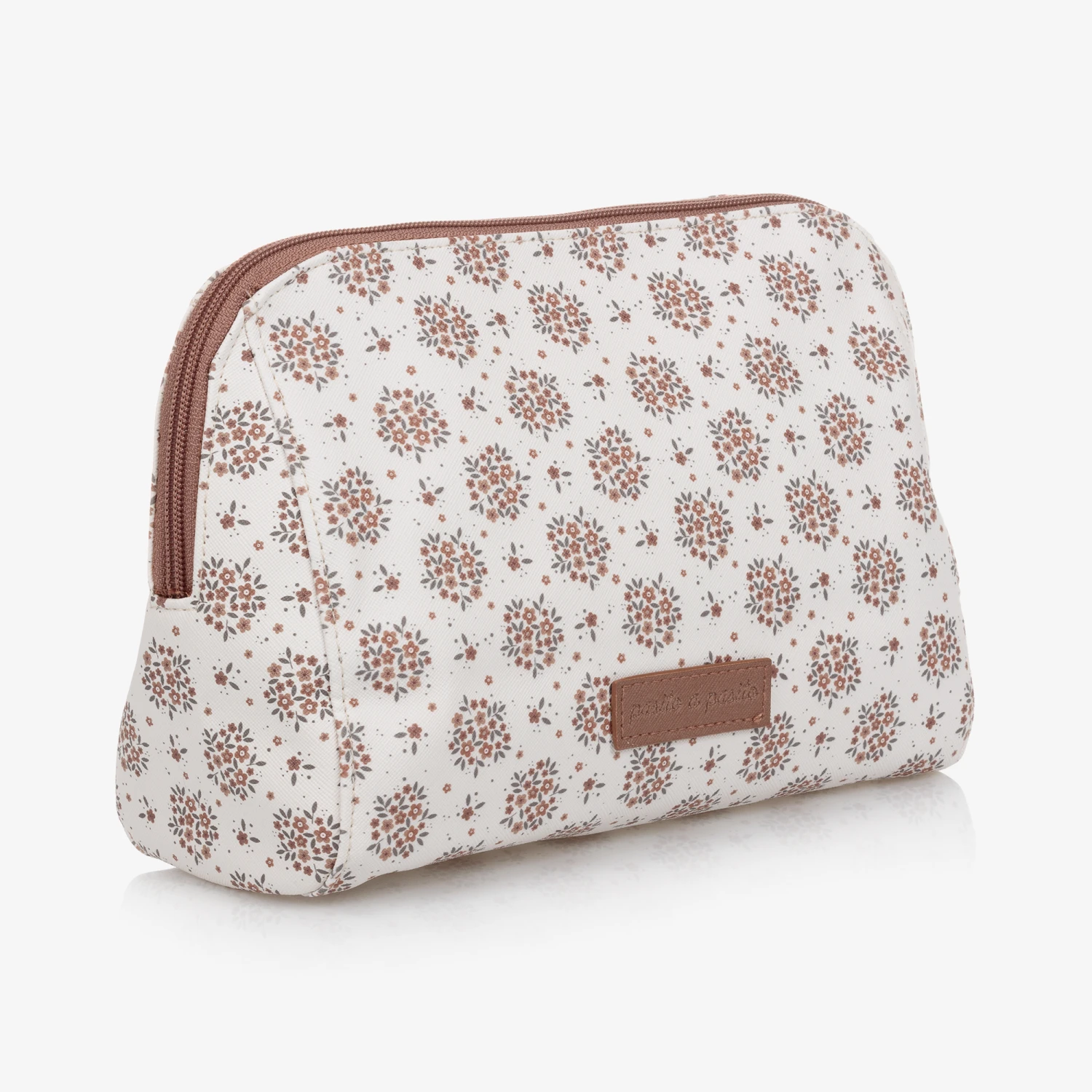 Ivory wash bag for boys and girls by Pasito a Pasito, with a pretty brown floral print. Made in soft faux leather, it has a smooth lining and a zip fastening.