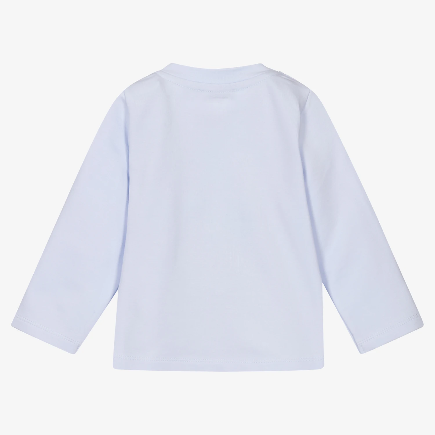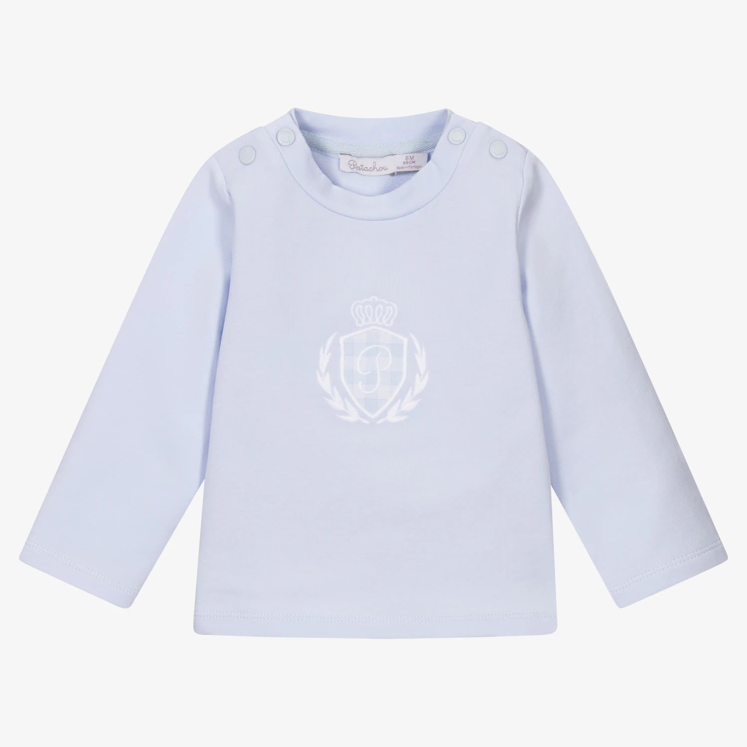 Baby boys pale blue top by Patachou. This soft, mid-weight jersey top has a logo crest on the front and popper fastenings on the shoulders for easy dressing.