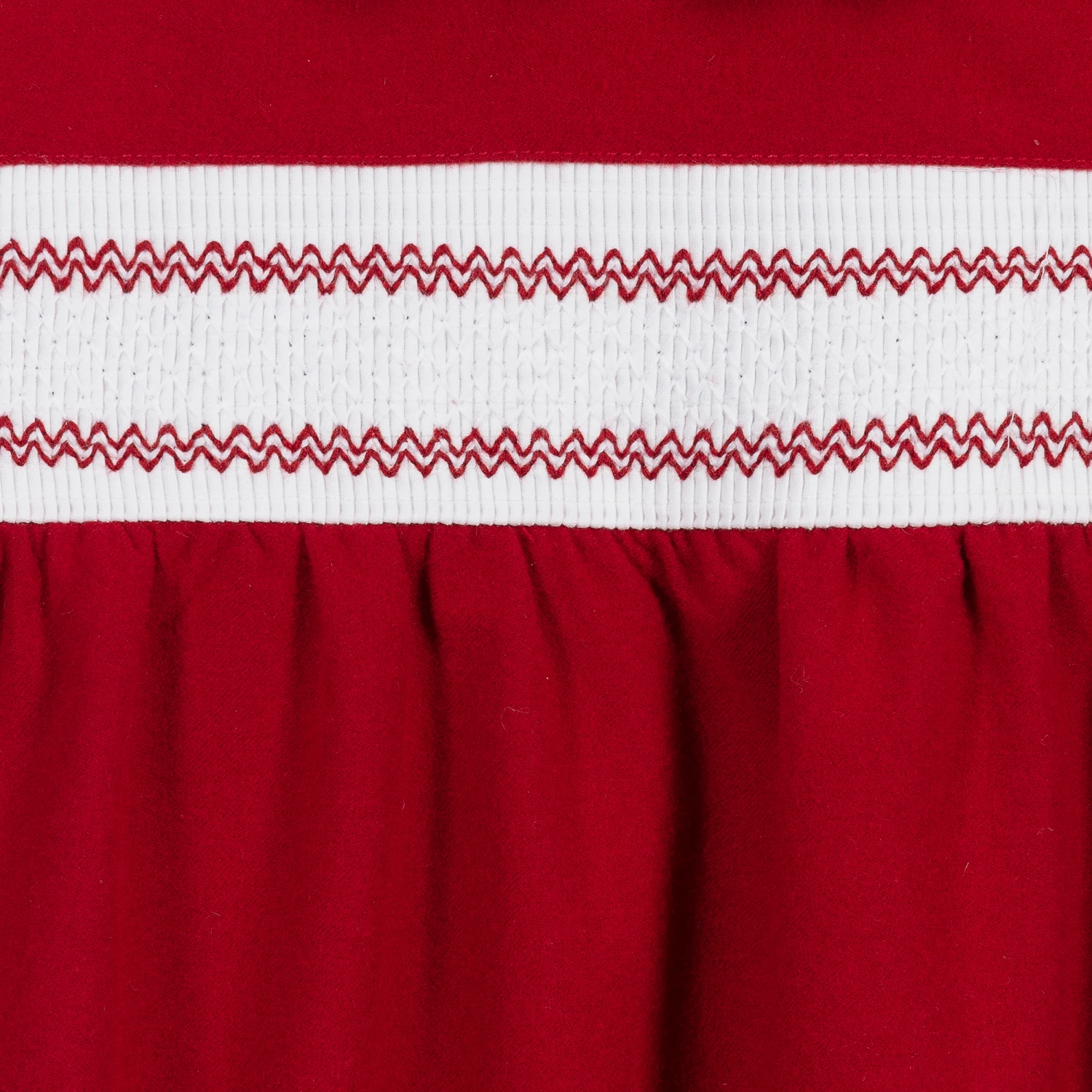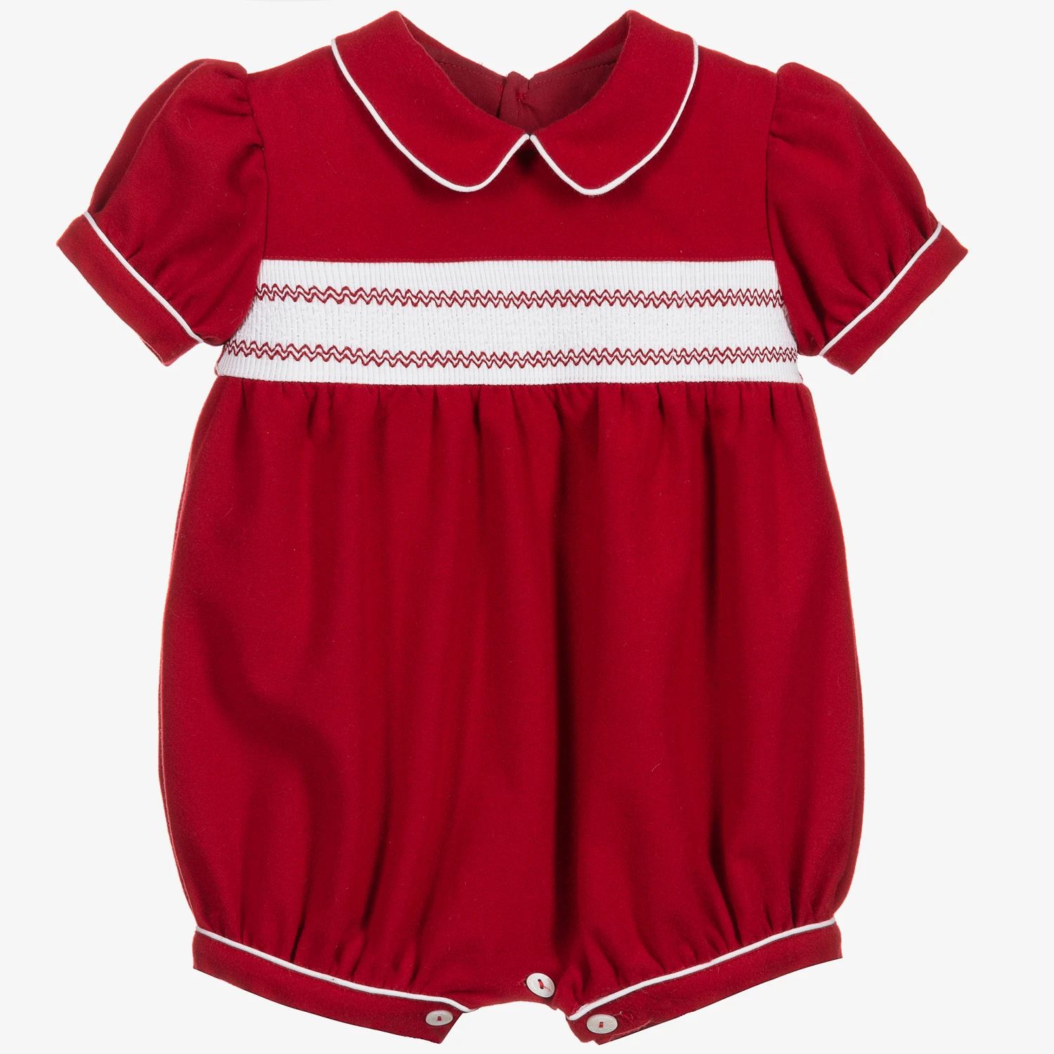 Red shortie for baby boys by Patachou, made in soft velvet and lined with lightweight cotton. It has white piping trims and white smocked detailing on the chest with red embroidery. It fastens with buttons on the back and between the legs.
