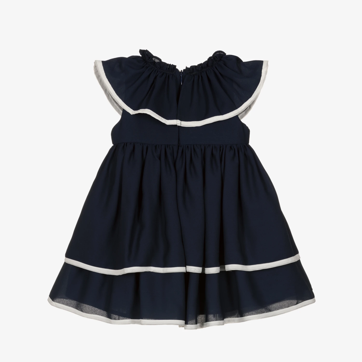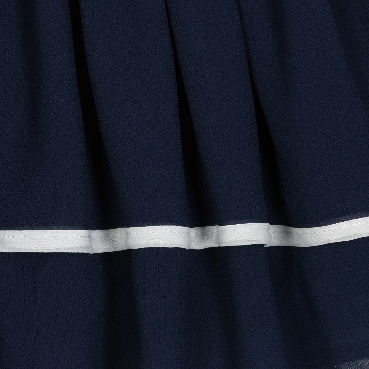 Navy blue dress for girls by Portuguese brand Patachou, made in layers of chiffon. Evoking traditional elegance, it has a ruffled collar with a white bow appliqué and piping trims. Lined in soft and lightweight voile with tulle trim for added volume, there is a concealed zip fastening on the back.