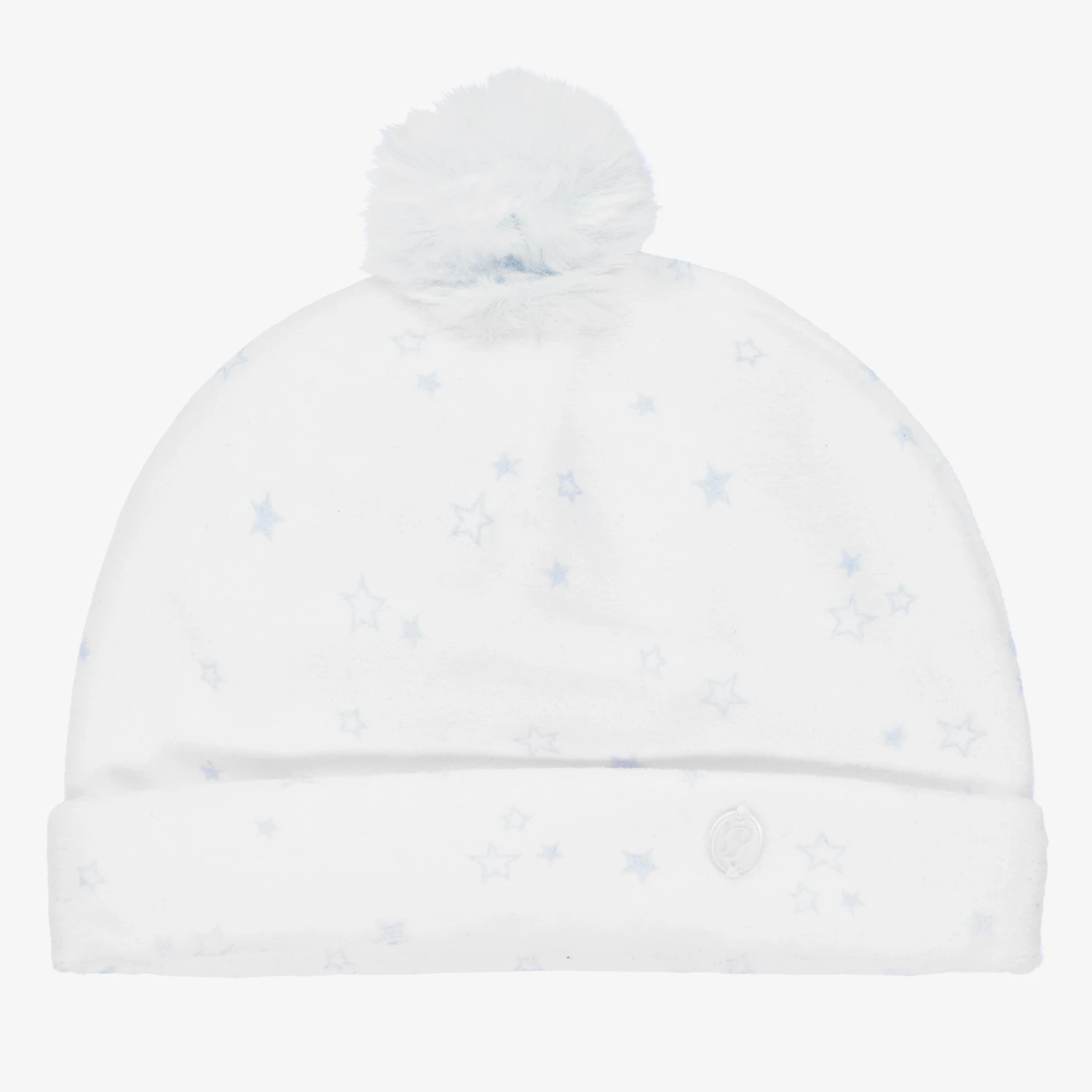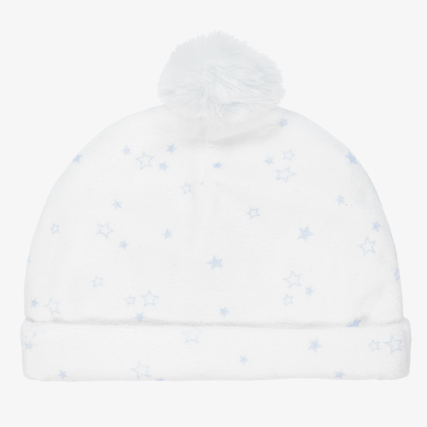 In white and pale blue, this sweet hat for baby boys and girls is by Patachou. Made in soft velour, it has a dainty star pattern and a fluffy faux fur pom-pom.