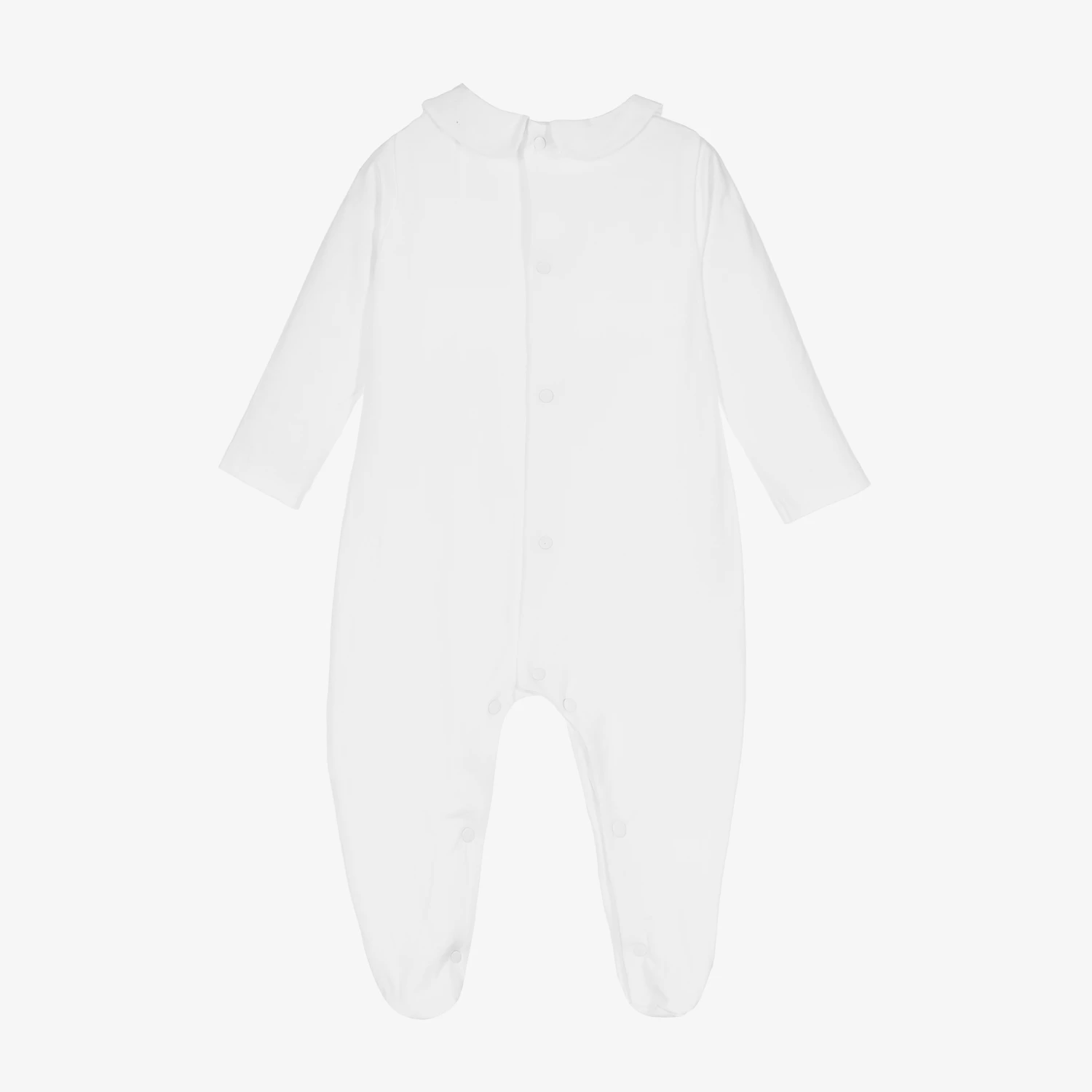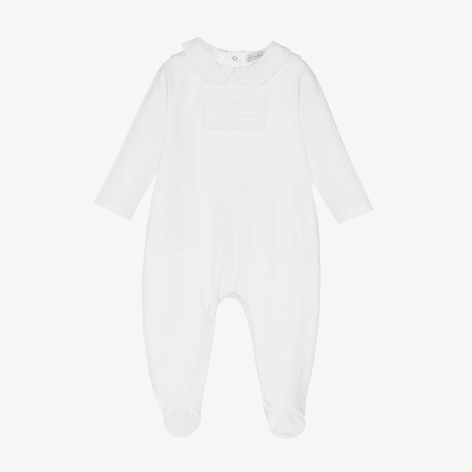 A lovely white babygrow for baby boys and girls from Portuguese brand, Patachou. Made in soft and comfortable cotton jersey, it has a poplin Peter Pan collar and a pintuck bib detail with a pearly logo charm. It fastens easily with poppers on the back and between the legs.