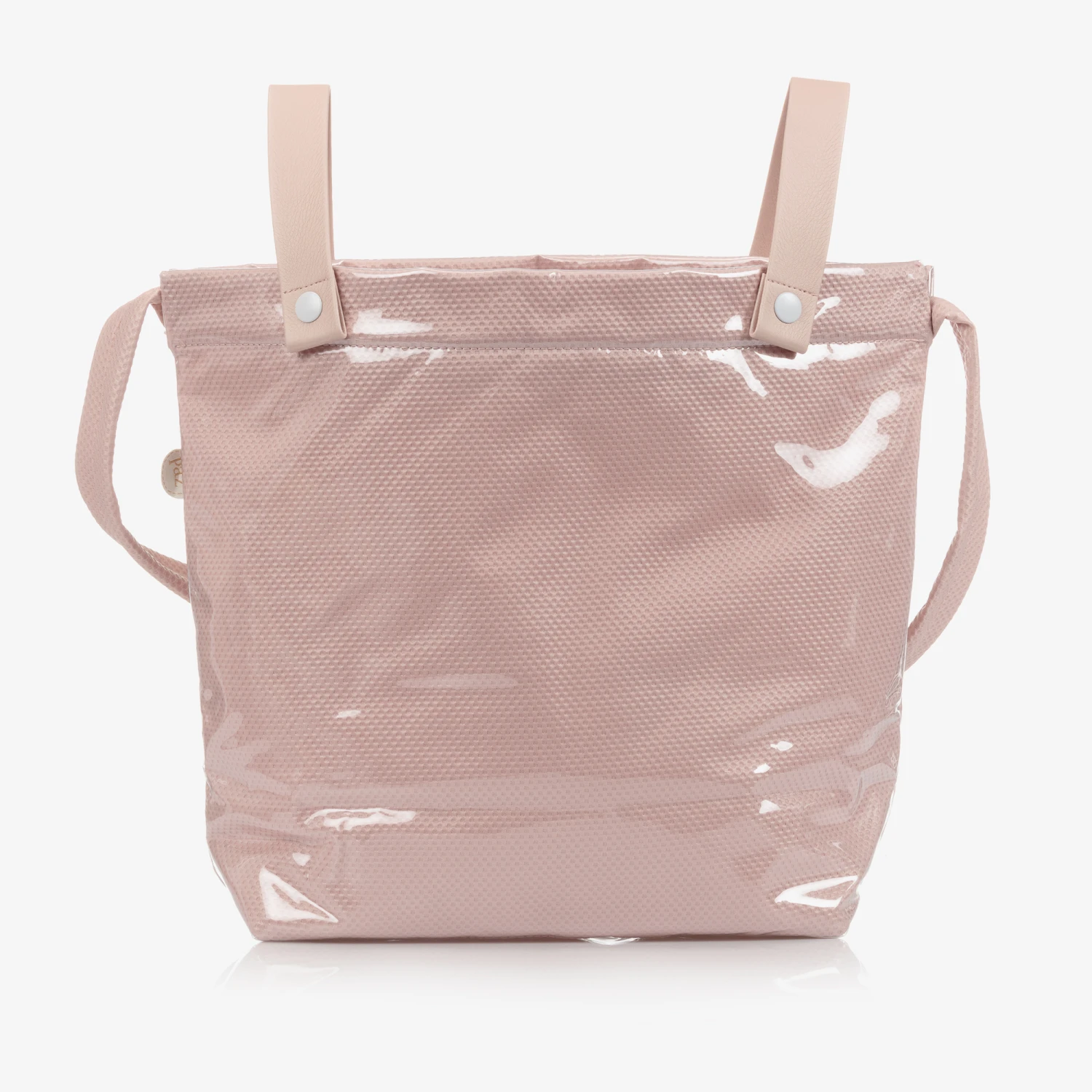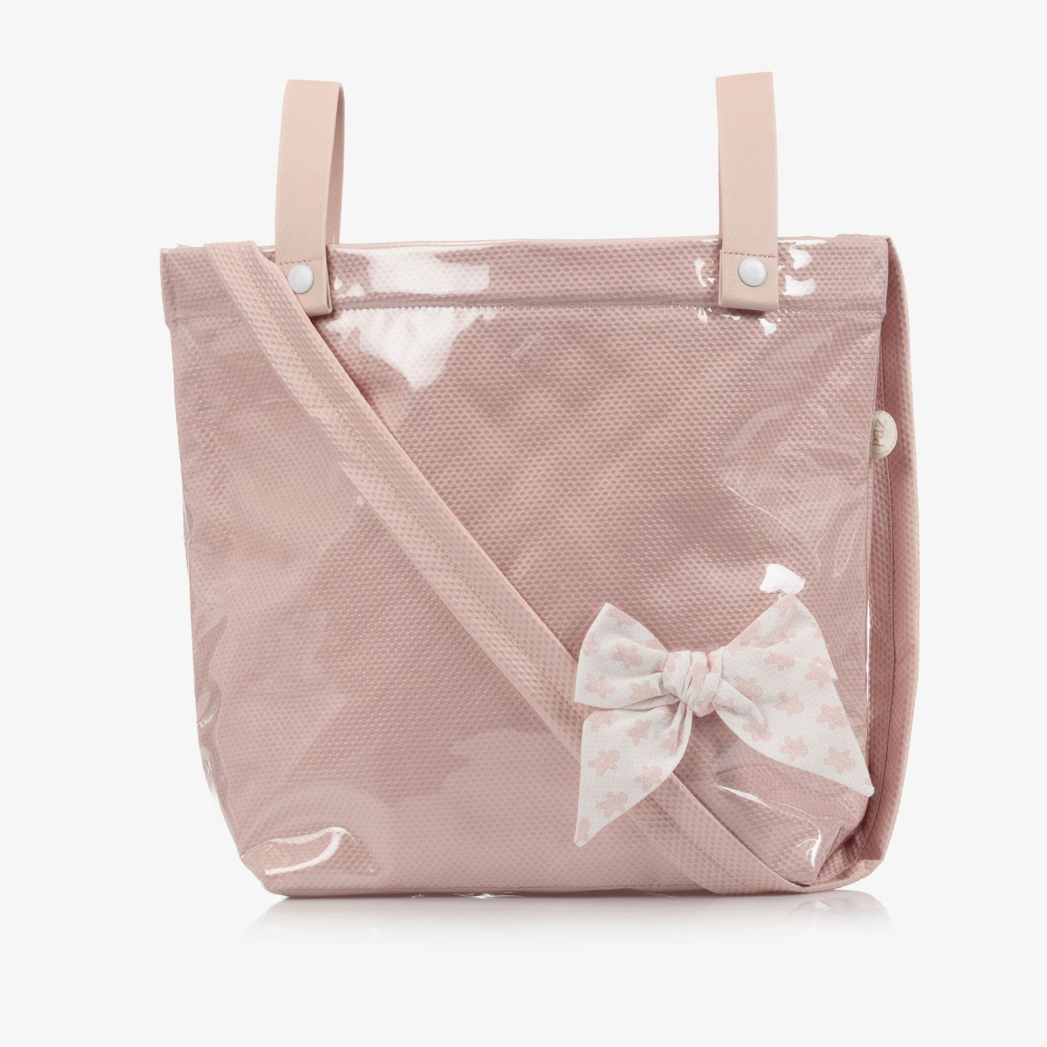 Pale pink changing bag, by Paz Rodriguez. Lined with silky, quilted polyester, it has a sweet bow on the front with a pink gingerbread man print. It has one main compartment with two internal elasticated pouch pockets. It comes with a detachable long padded strap and two shorter straps, allowing it to be attached to a buggy or a pram.