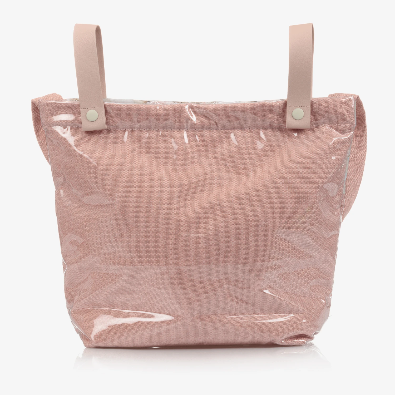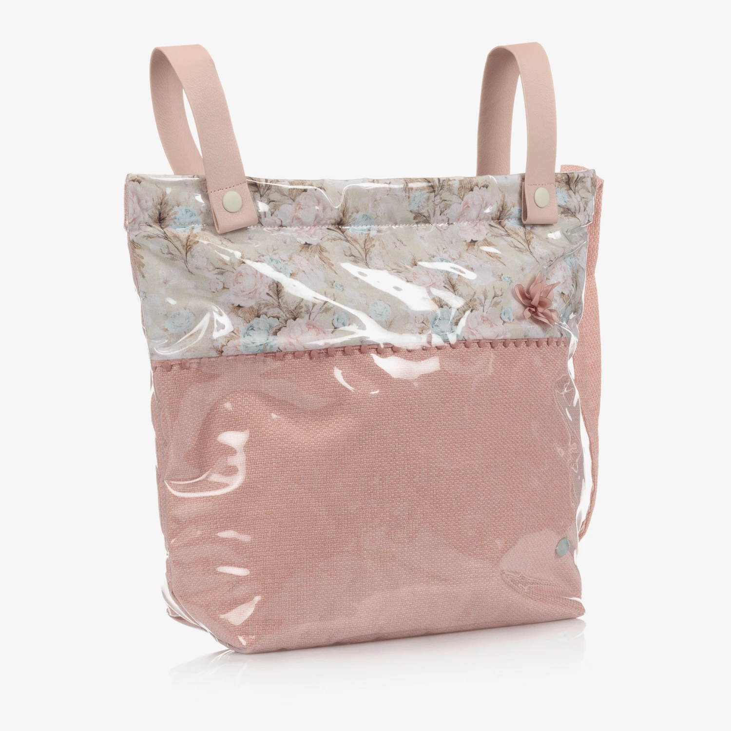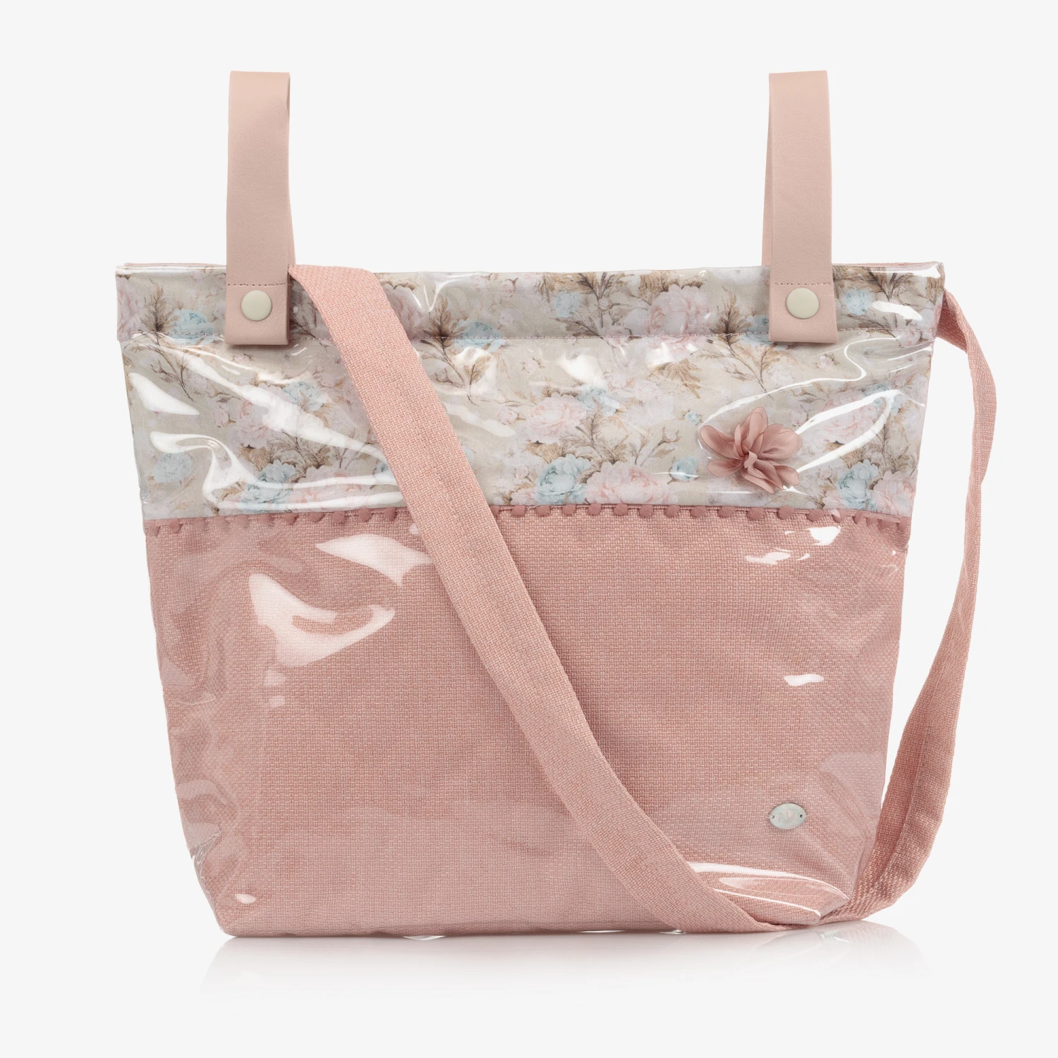 Pale pink changing bag, by Paz Rodriguez. Lined with silky, quilted polyester, it has a sweet floral print at the top, and a pretty pink silky flower appliqué. It has one main compartment with two internal elasticated pouch pockets. It comes with a detachable long padded strap and two shorter straps, allowing it to be attached to a buggy or a pram.