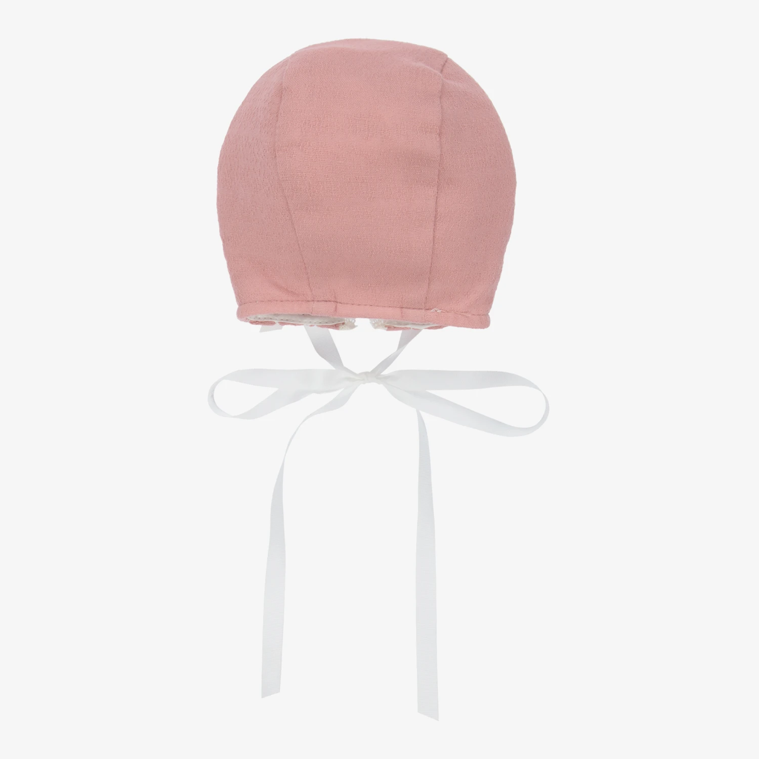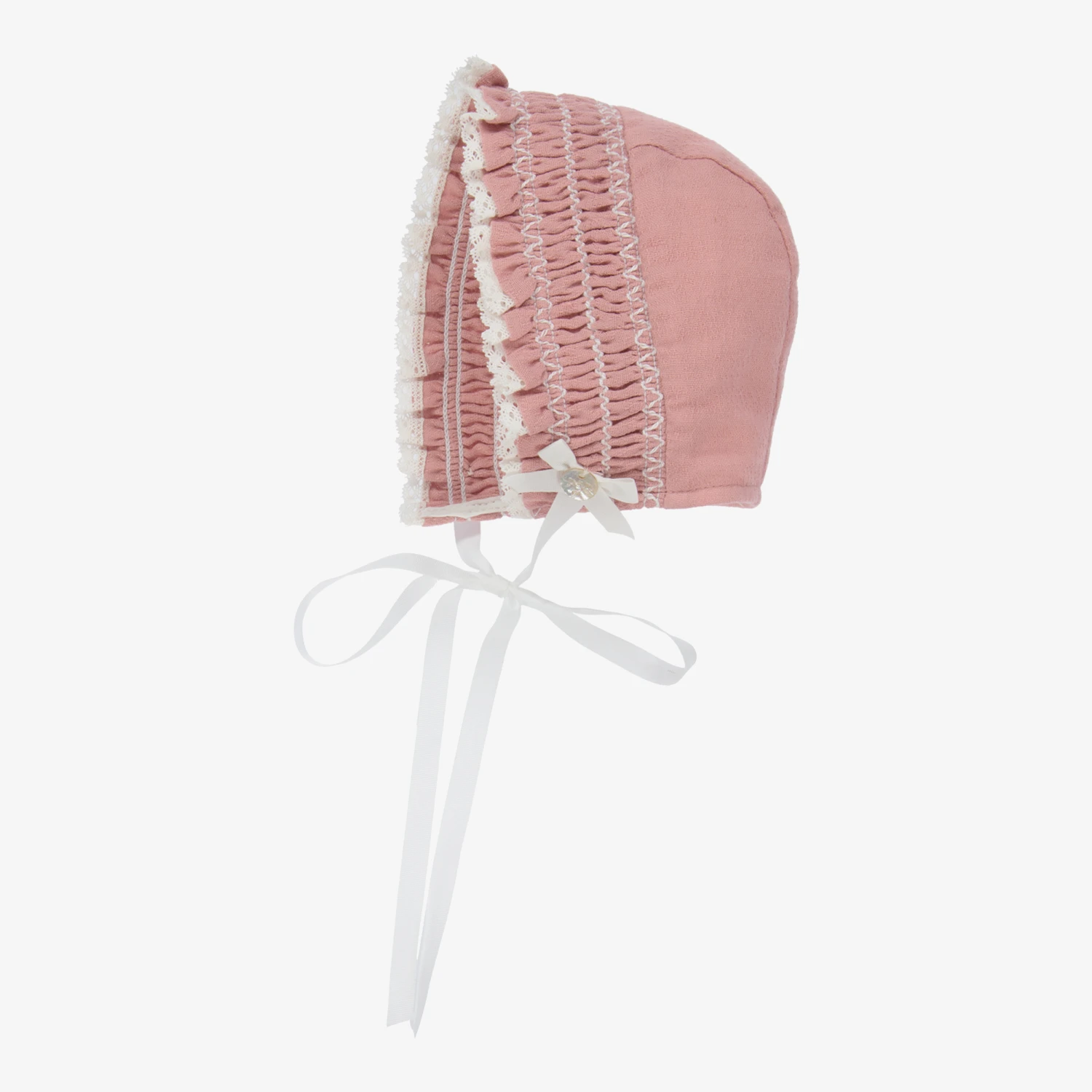 Dusky pink smocked bonnet for baby girls by Paz Rodriguez. Made in soft cotton, it has ivory lace trim and smocking details, with ties that fasten under the chin.