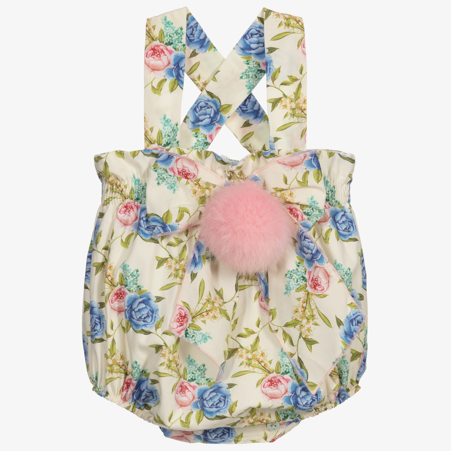 Baby girls gorgeous ivory floral shortie by Phi Clothing. Made in beautifully soft cotton and fully lined, it has elasticated leg holes and a ruched, stretchy top with ruffle trim. The shoulder straps have buttons at the front and are stitched on the back. The back is embellished with a bow and pink fur pom-pom.