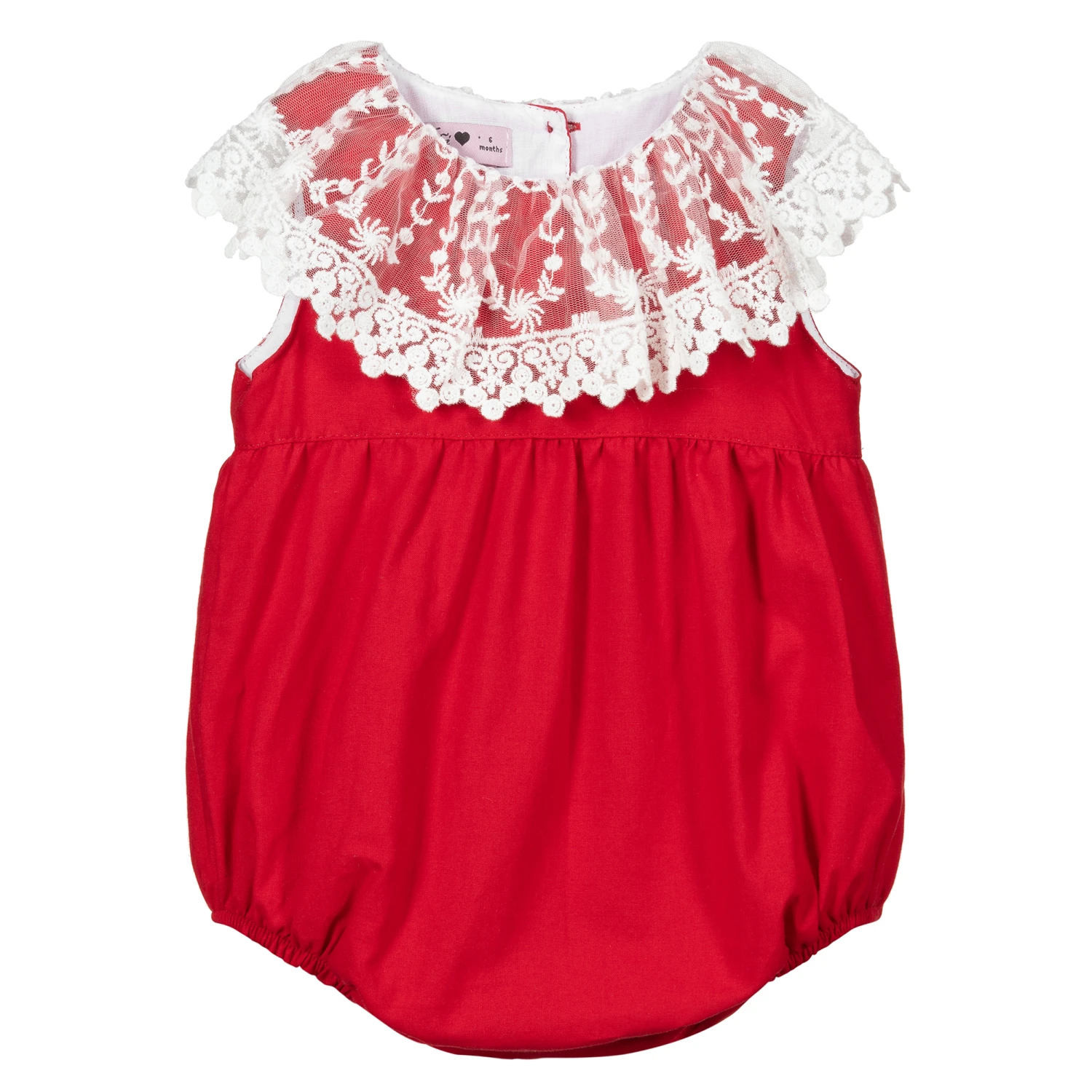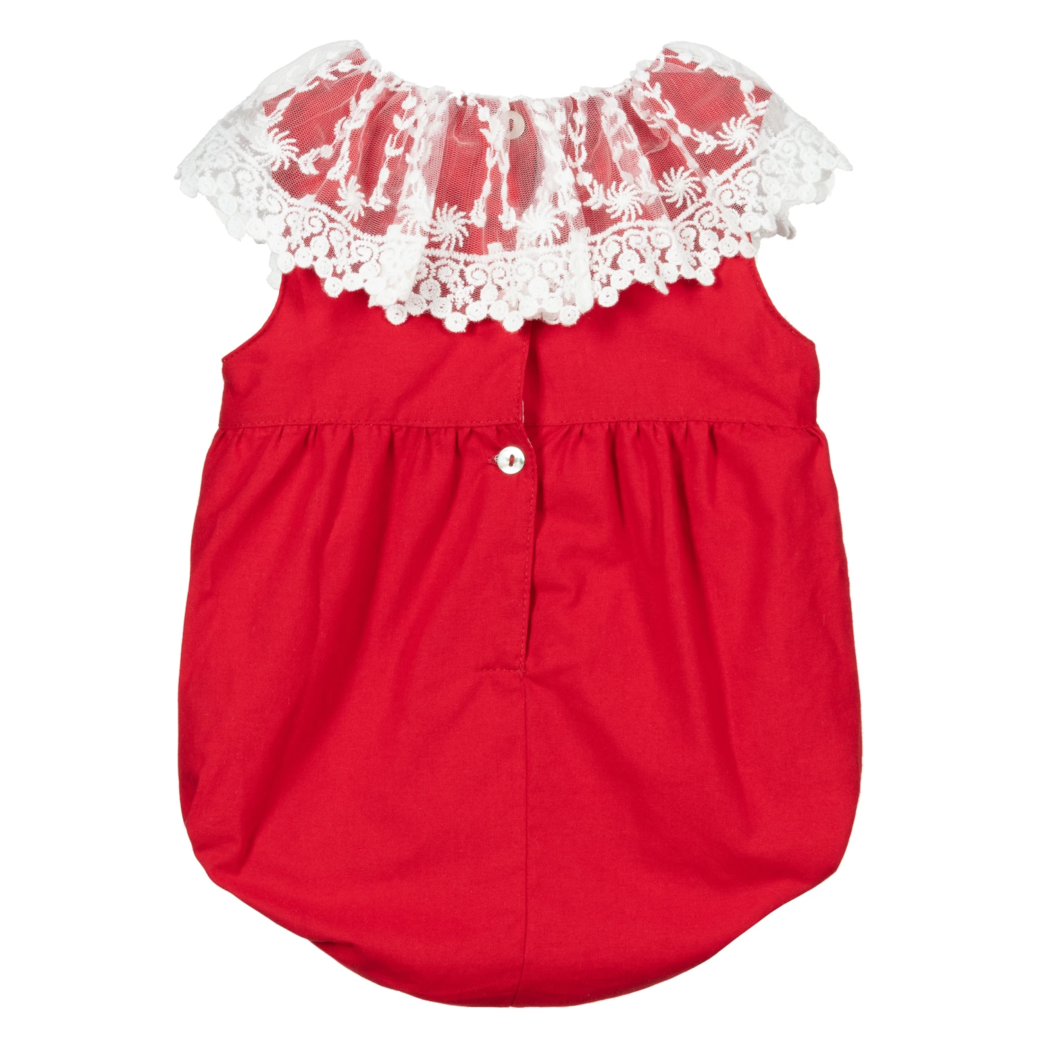 Red shortie for baby girls by Phi Clothing, with a beautiful white lace collar. It is made and lined in soft polycotton. with mother of pearl buttons to fasten on the back and between the legs.