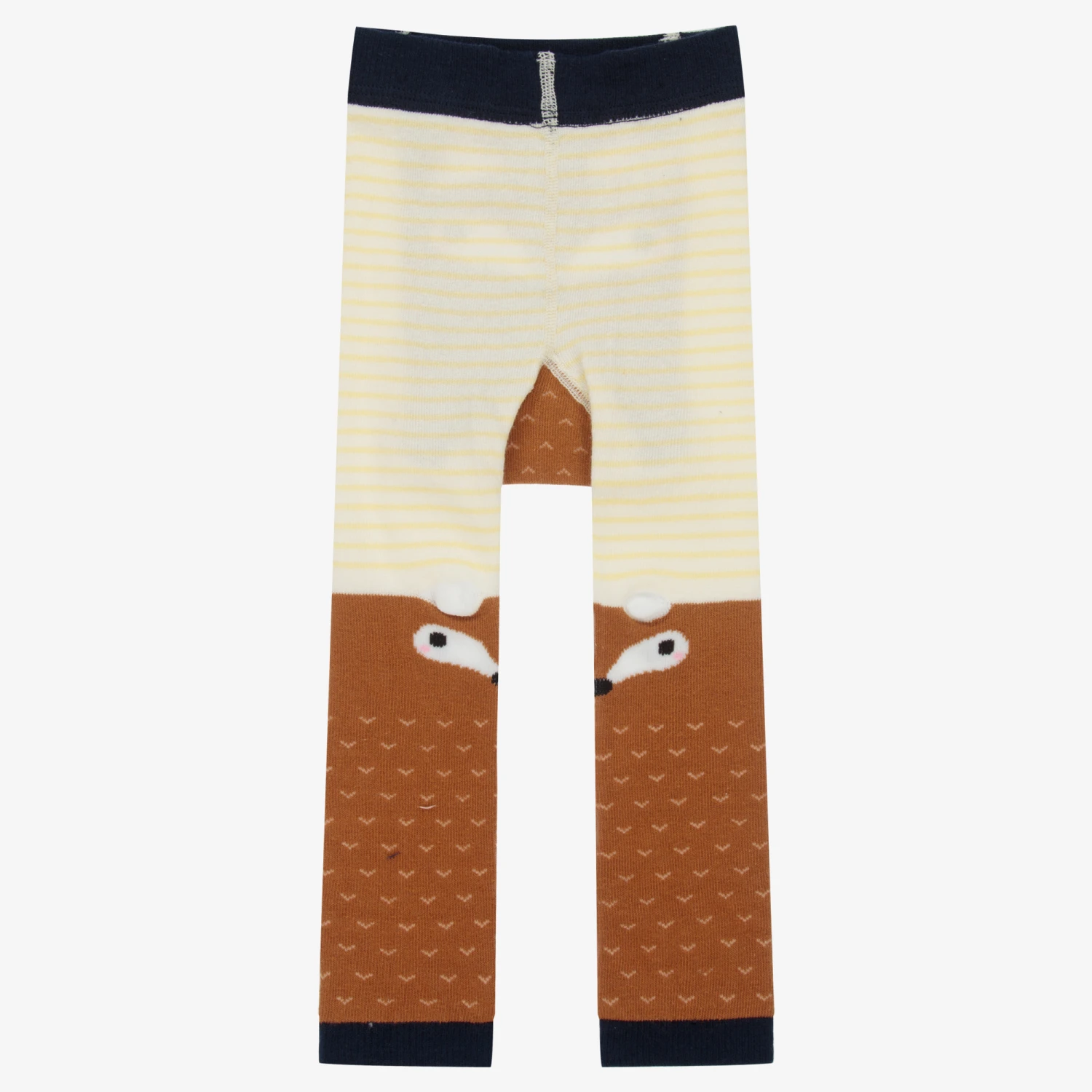 Ivory and brown striped leggings by Powell Craft, for little girls and boys, made in a soft cotton knit. Suitable for boys and girls, they have a cute fox face motif in brown with navy blue trims. They are soft and stretchy, and can also be worn as footless tights.