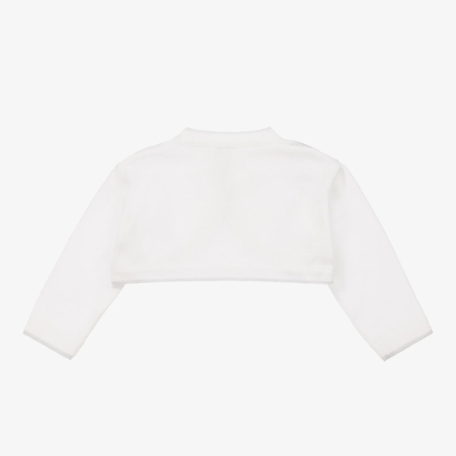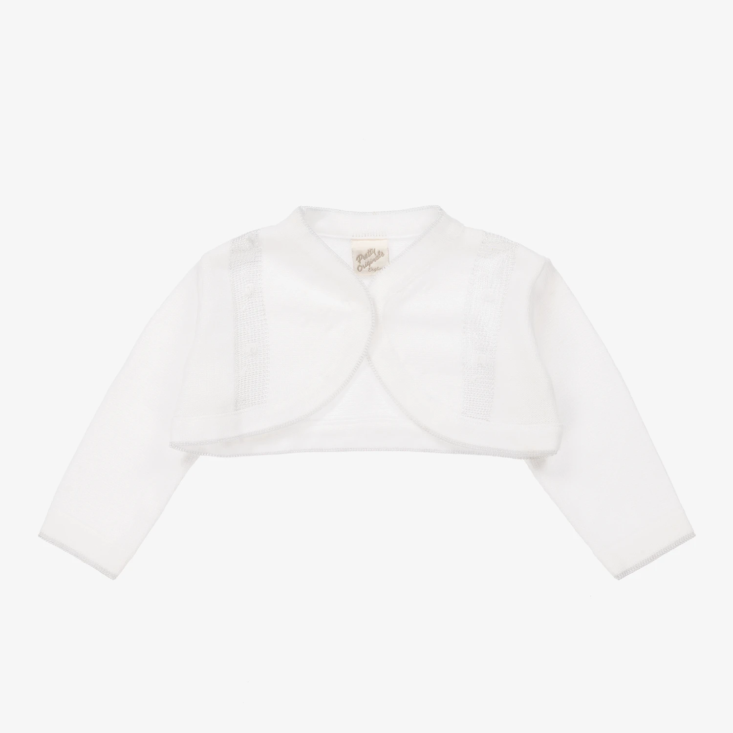 White bolero cardigan for baby girls by Caramelo Kids, knitted in lightweight cotton. It has pretty knitted silvery panels and trims, delicate embroidered flower detail and a single button fastening on the front.