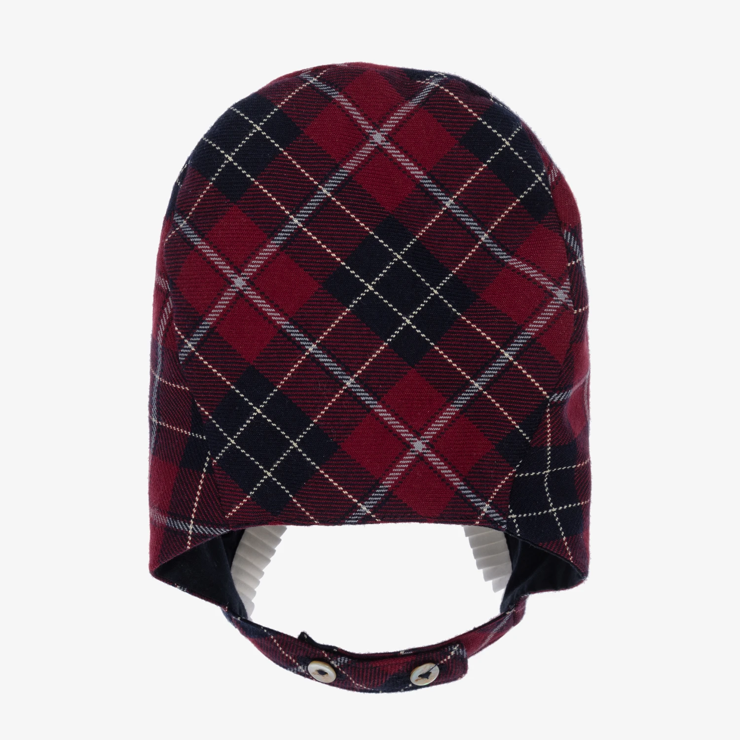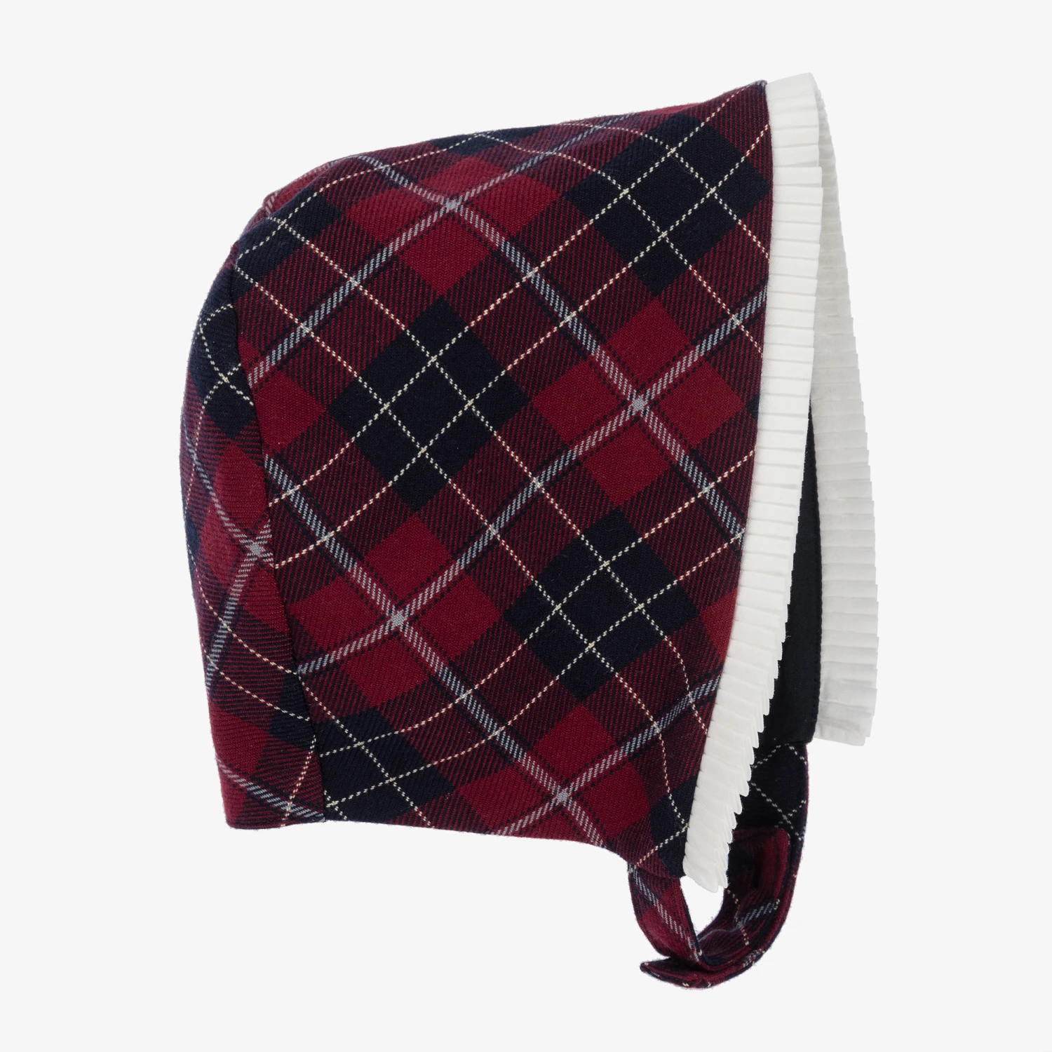 Red and navy blue tartan bonnet for younger girls by Pureté Du… Bébé. Made with a lightweight viscose blend, this smart hat has a white, gathered frill trim, and a pearlescent logo charm on one side. Lined with soft cotton voile, it fastens with buttons on a strap under the chin.