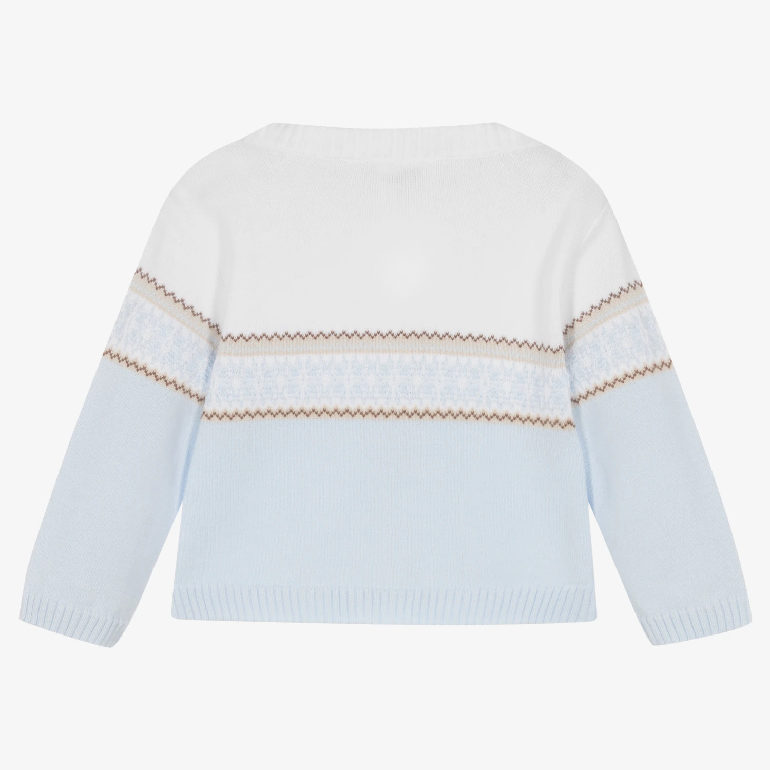 A timeless blue and white cardigan by Sarah Louise, for little boys, knitted in soft cotton. This piece has a subtle textured garter stich across the body, trimmed with a brown zigzag pattern for a vintage-inspired look. Ideal for layering, this piece fastens with pearlescent buttons on the front.