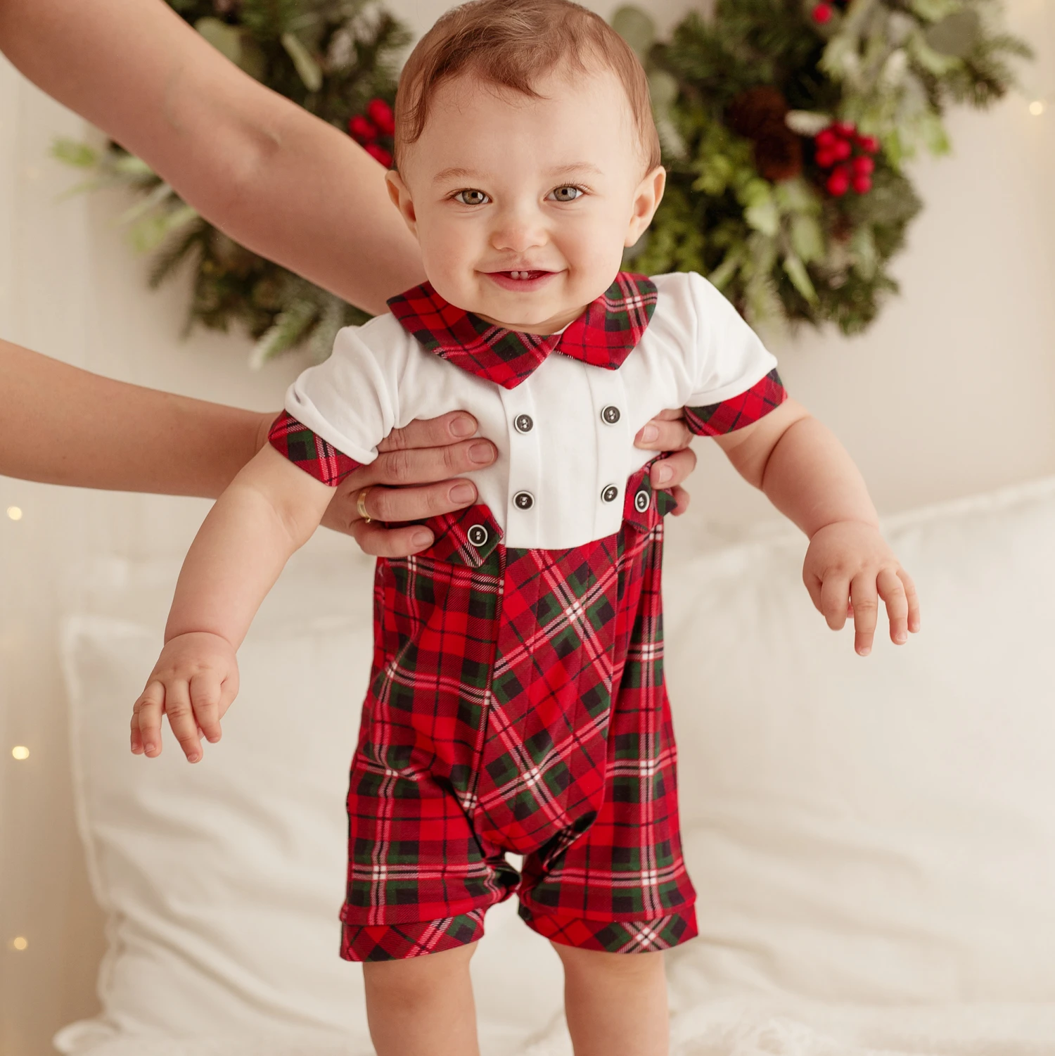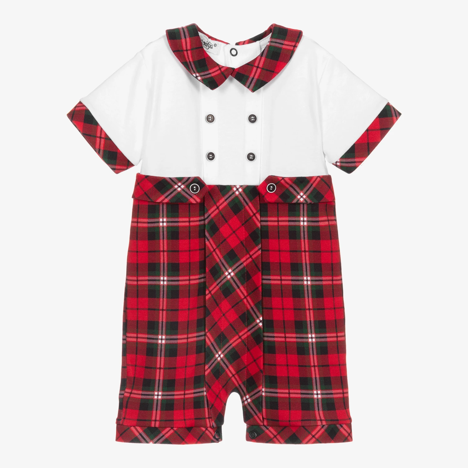 Traditional white and red shortie for baby boys, by Sofija. Made from soft cotton jersey, it has red and green tartan shorts with a matching collar and cuffs, and smart pleated button trims.