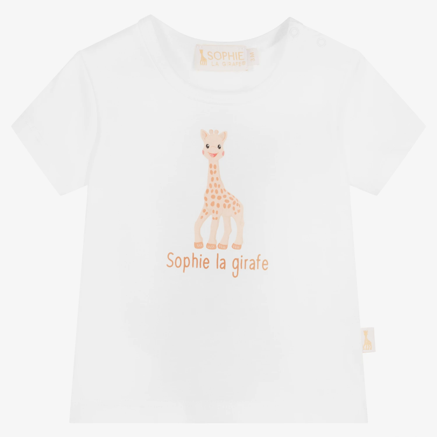 Ivory T-shirt for baby boys and girls by Sophie la Girafe, made in soft cotton jersey. The front has a beige logo print and there are popper fastenings on one shoulder.