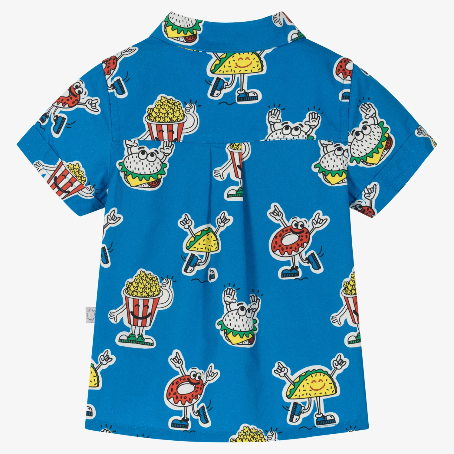 Bright blue shirt for baby boys by Stella McCartney Kids, with a colourful ‘fast-food’ character print. Made in lightweight cotton poplin, this cool short-sleeved style has a chest pocket and branded popper fastenings for easy dressing. The Stella McCartney fit can be quite small so choose a size up if you want room to grow.