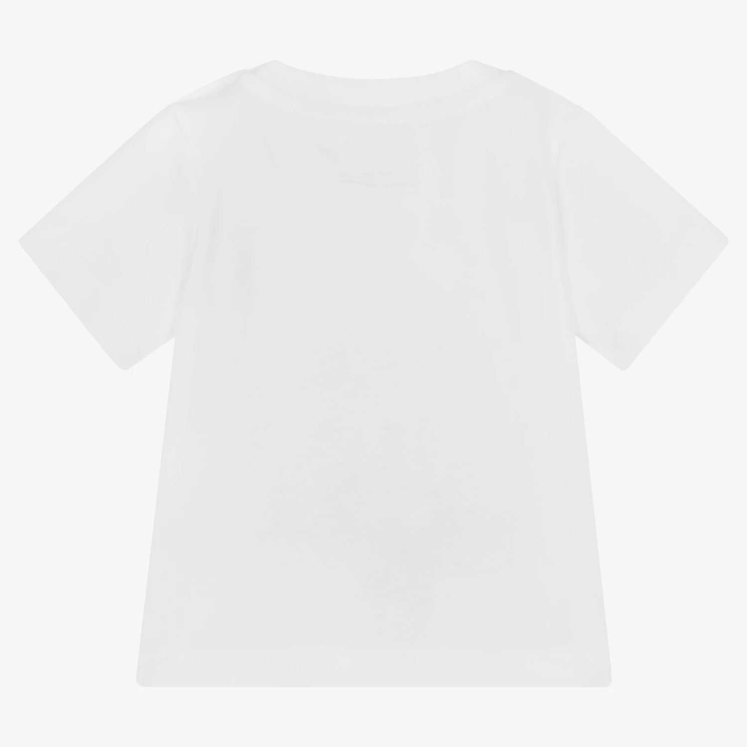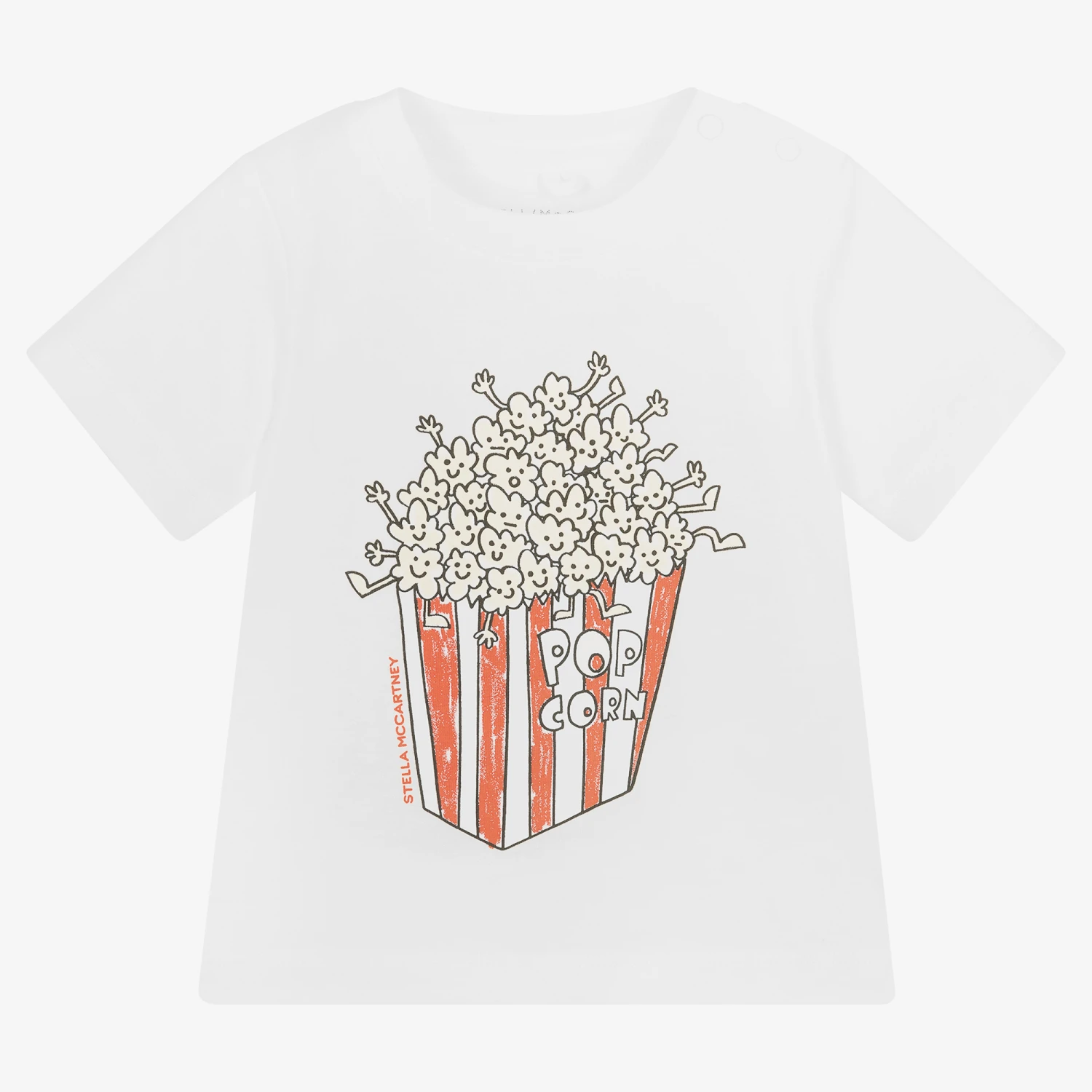 Fun white T-shirt for baby boys by Stella McCartney Kids, made in soft organic cotton jersey. Fastening with useful poppers on one shoulder, it has a vibrant red striped popcorn graphic print on the front with the brand’s recognisable logo.