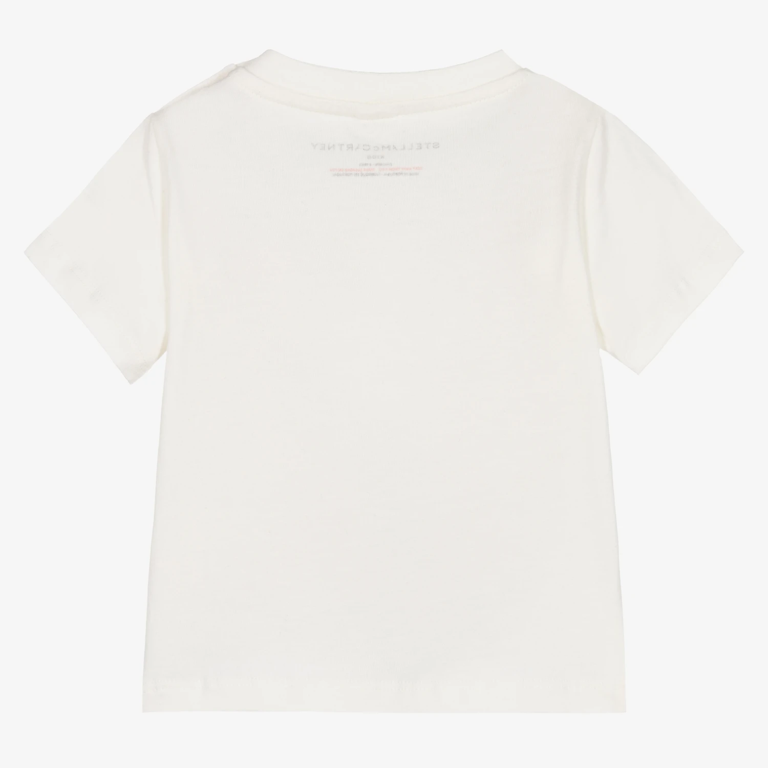 Girls ivory T-shirt by Stella McCartney Kids, made in soft organic cotton jersey. There is a floral daisy chain print on the front in a circular design with delicate embroidered details. The designer’s initials are printed in green on the inside.
