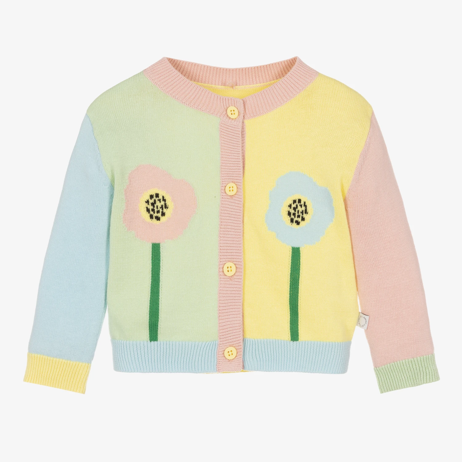 In delightful pastel hues, this colour block cardigan for baby girls is from Stella McCartney Kids. Knitted in super soft organic cotton, it fastens easily with buttons on the front. It is decorated with abstract flowers on the front for a fun and creative style. The Stella McCartney fit can be quite small so choose a size up if you want room to grow.