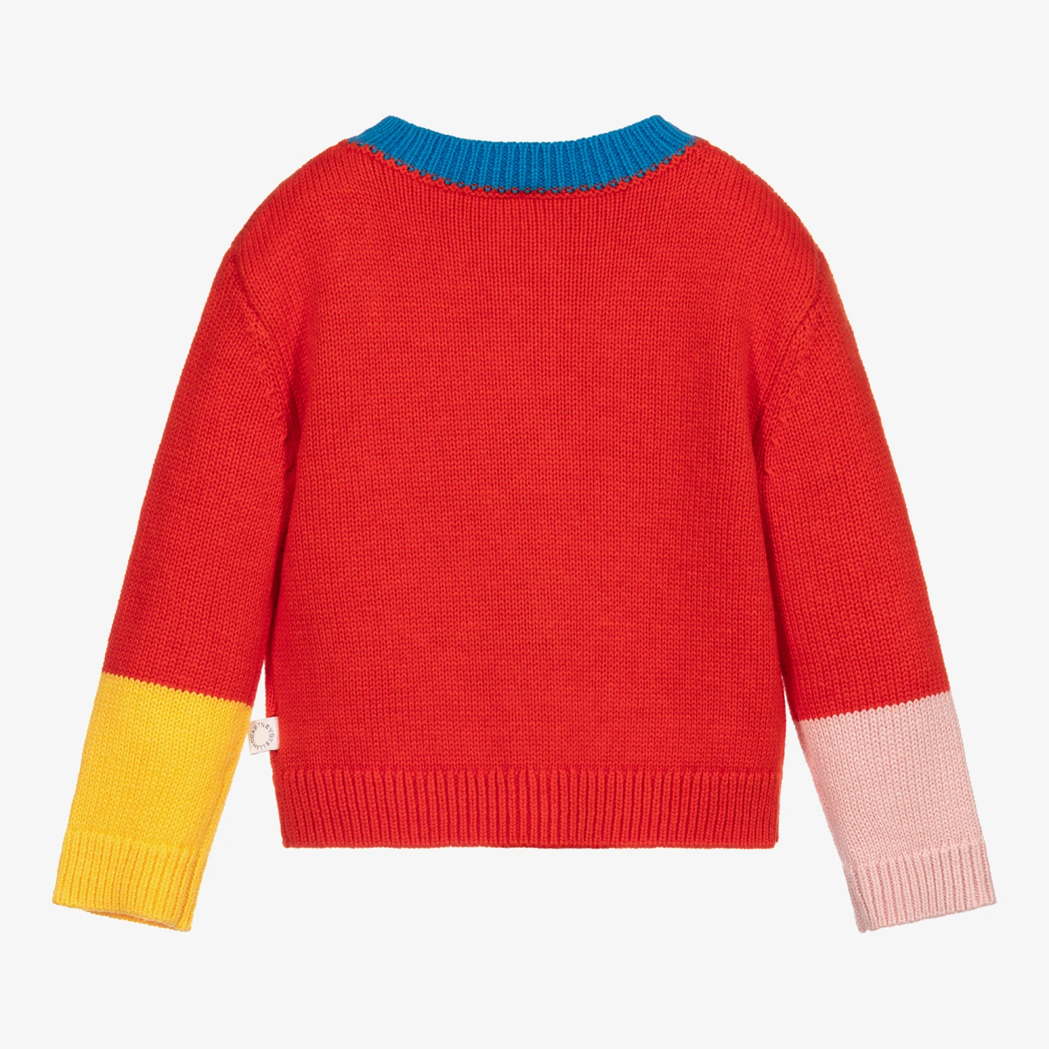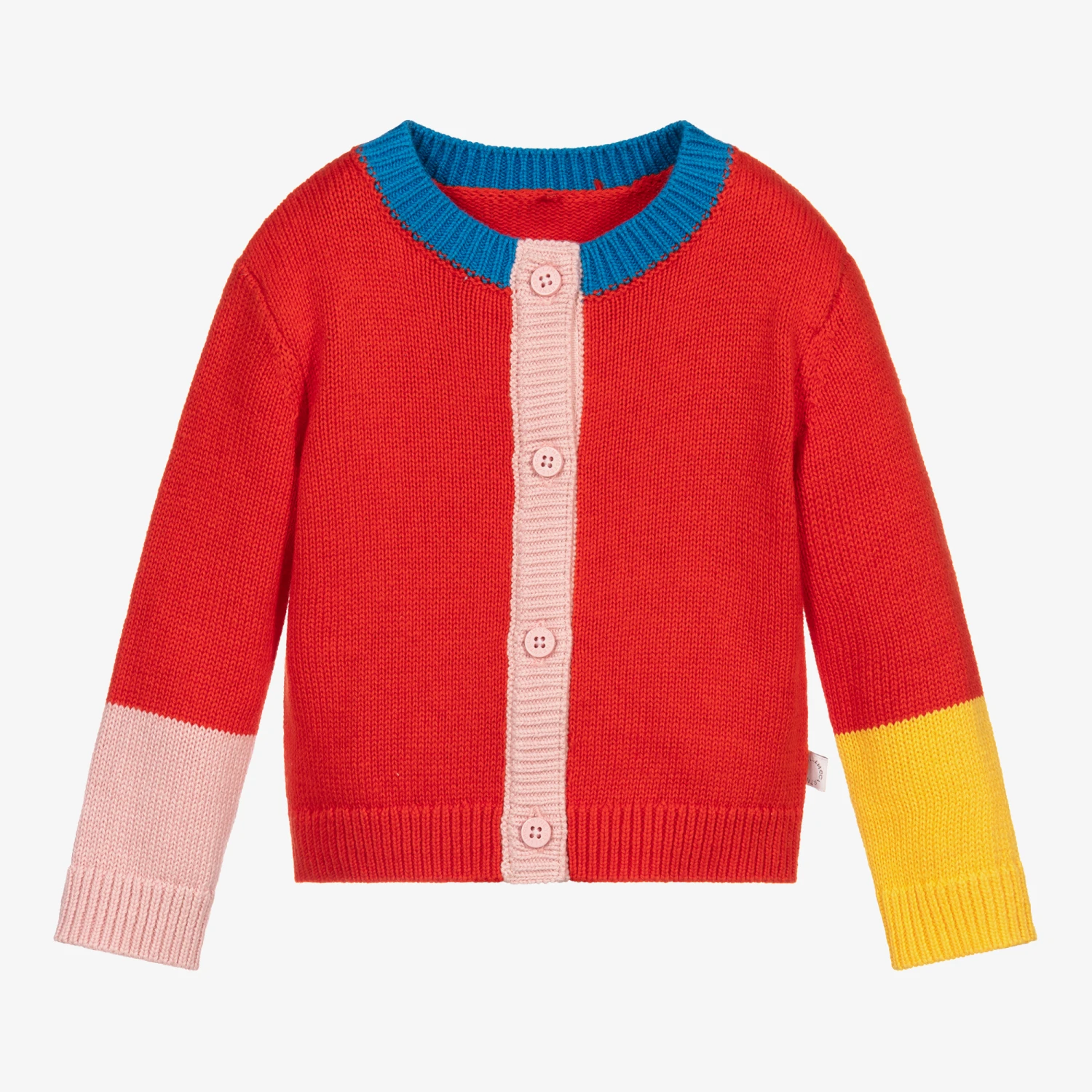 Red colour block cardigan for younger girls by Stella McCartney Kids. Made with a soft, organic cotton knit, it has pink and yellow sleeve cuffs, a blue neckline, and pink stripe on the button fastening. It has a logo tag on one side.