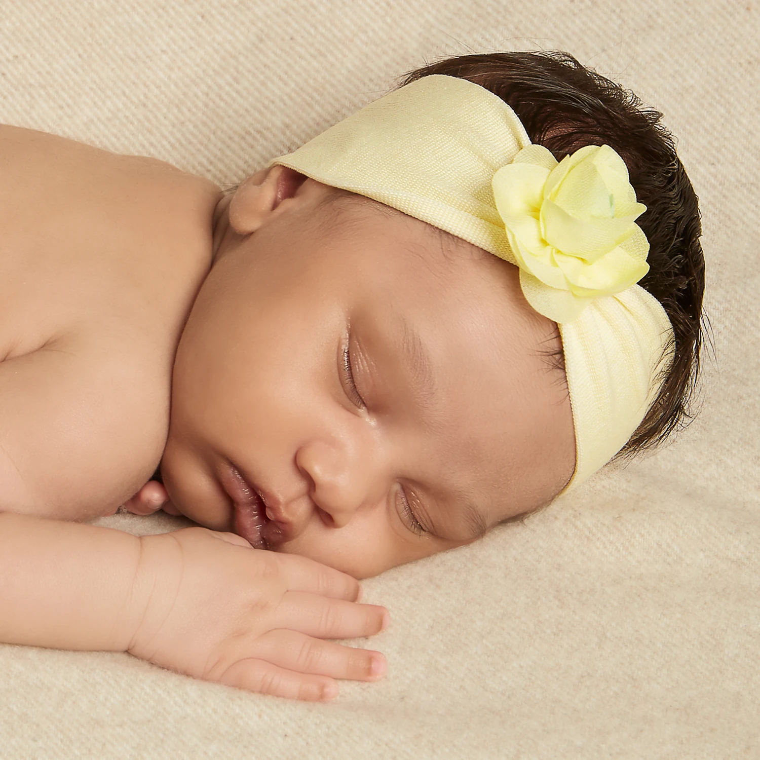 Story Loris girls yellow stretchy cotton jersey headband, with a pretty yellow and green floral appliqué on the front.