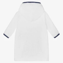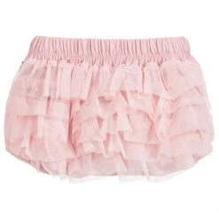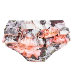 White bikini bottoms for baby girls by British brand Sunuva, patterned with pink, blue and green florals. Soft and stretchy with UPF 50+, they have pretty pink striped ruffles all the way around. Fully lined and elasticated on the legs, they slip on with ease and can be worn comfortably over a swim nappy.