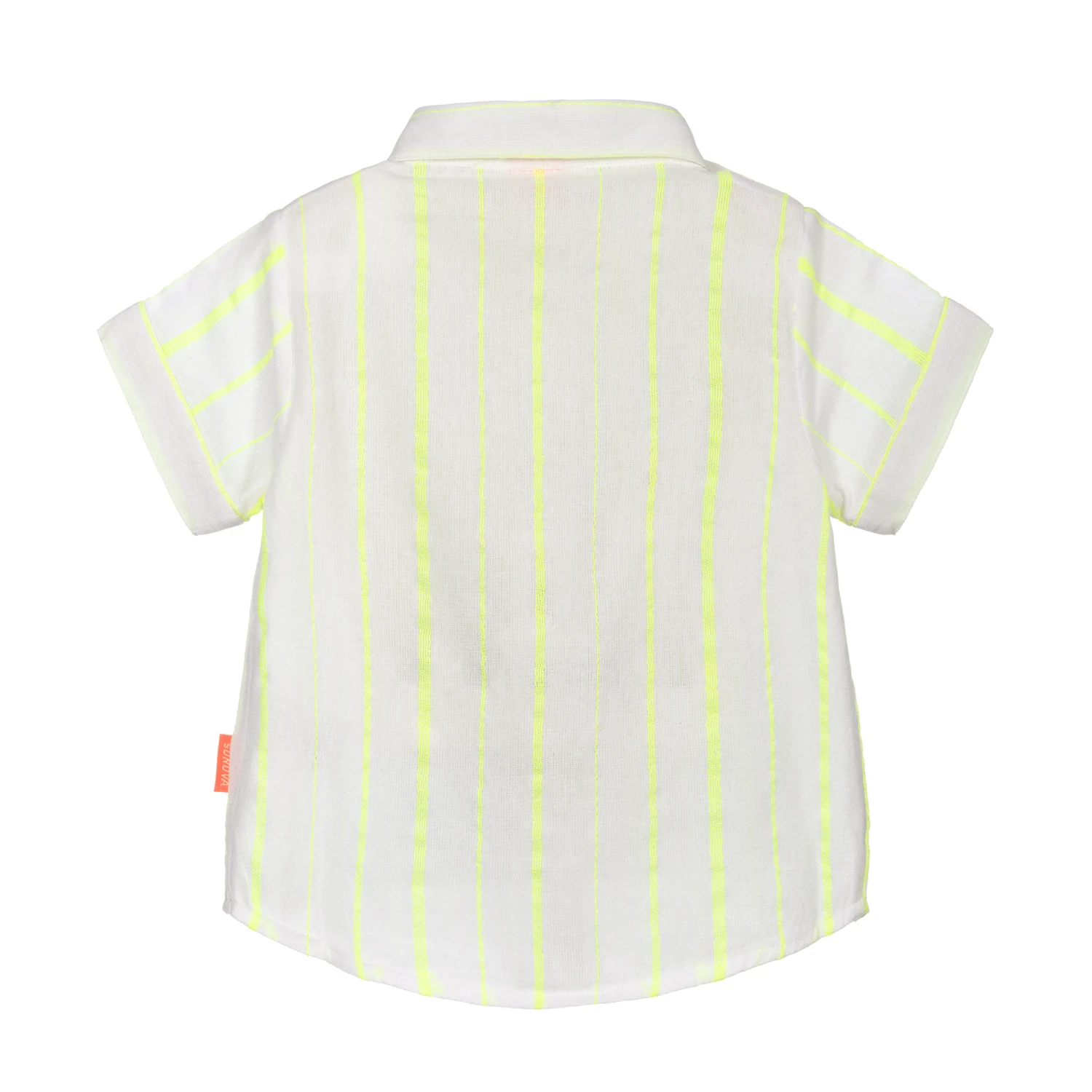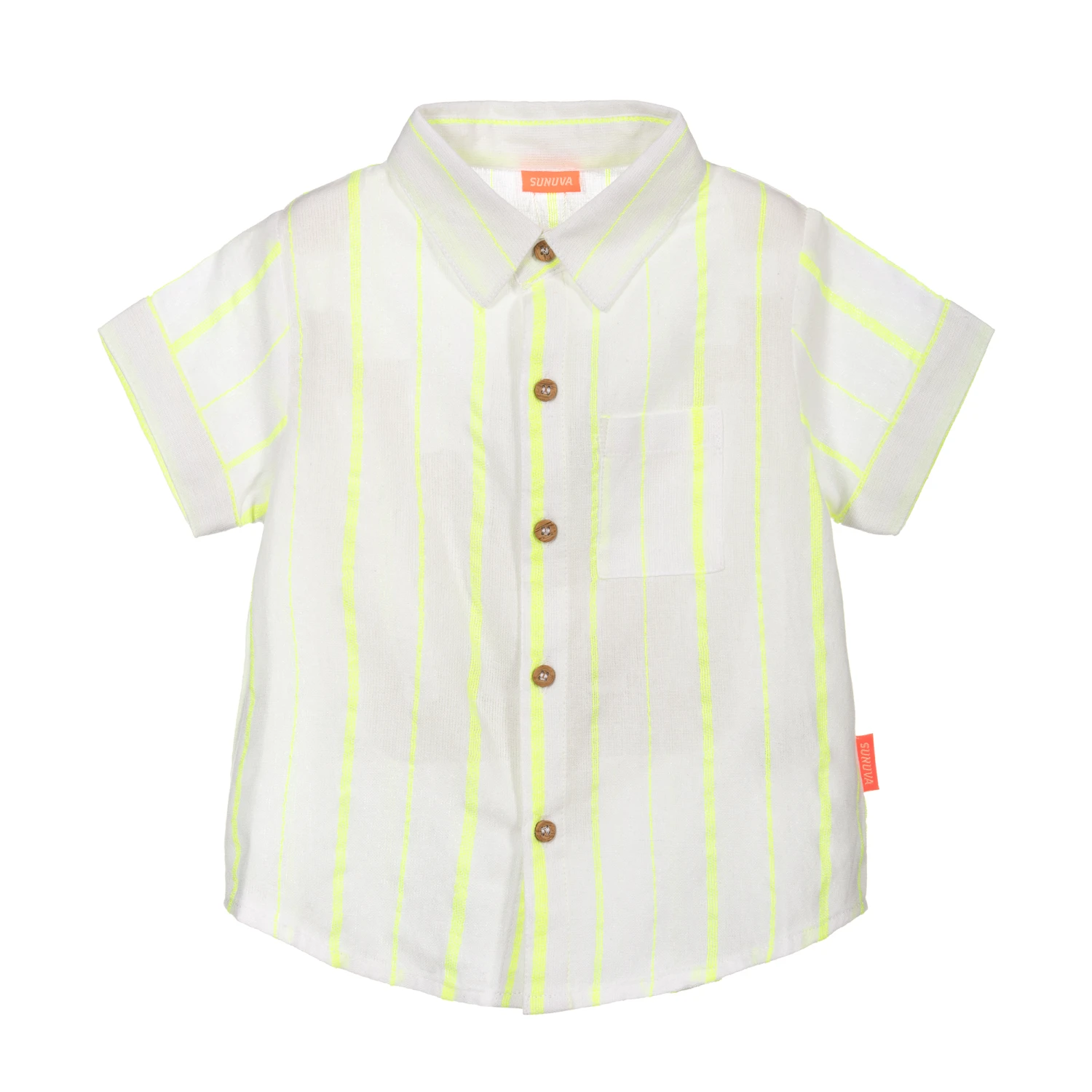 Baby boys white shirt with neon yellow stripes by Sunuva, made in a soft and lightweight cotton blend. It has turned-up sleeve cuffs, a patch pocket and beige buttons to fasten.