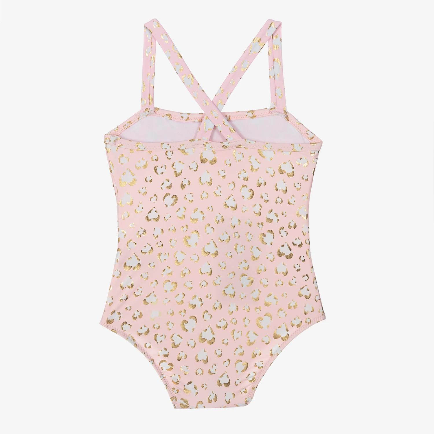 Lovely pale pink swimsuit for baby girls by Sunuva. Made in silky lined lycra, it has a sweet leopard print design all-over with gold foil trims, ruffle details and a cross-over strap on the back.