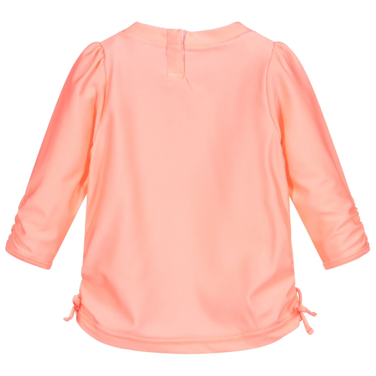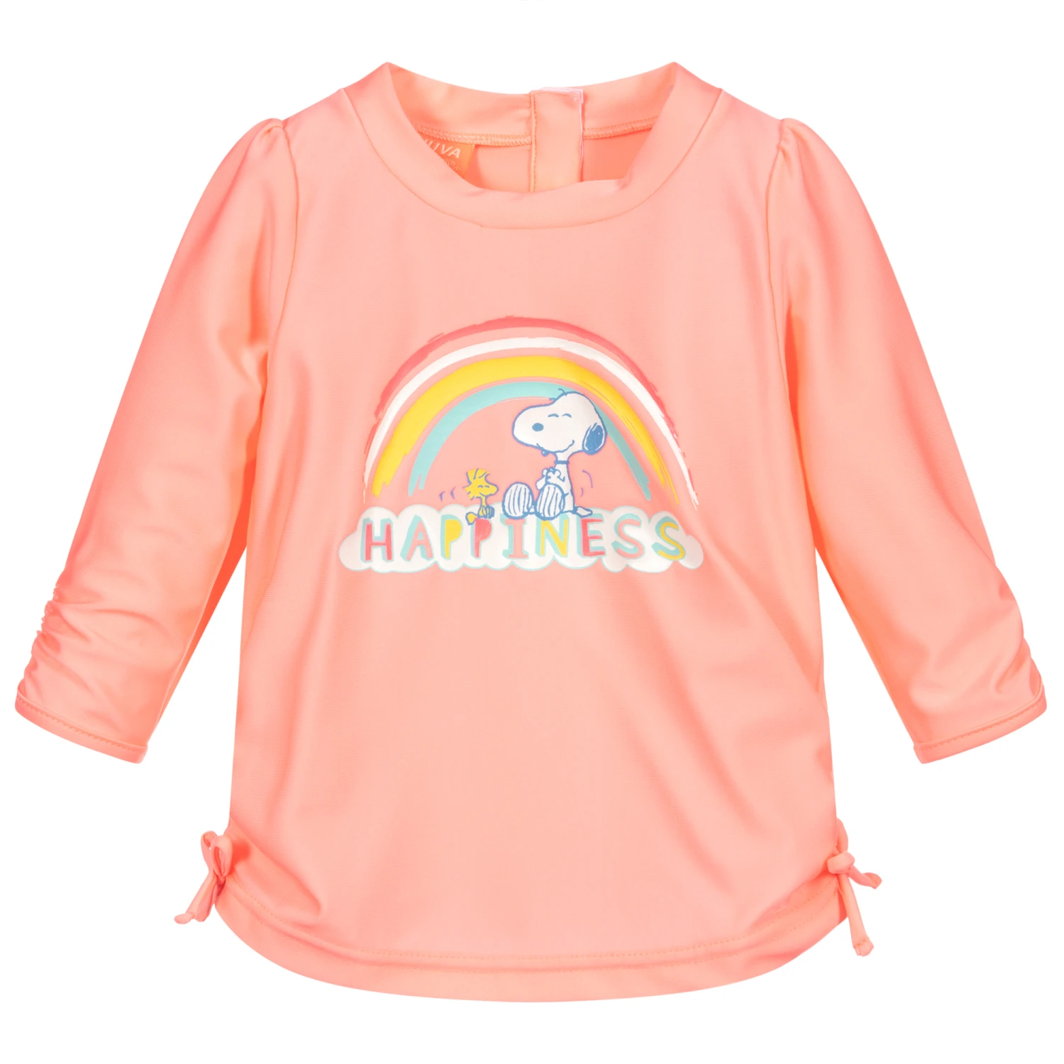 Neon pink Sunuva top for baby girls, made in silky soft fabric with UPF50+ protection, validated by The British Skin Foundation. It has a colourful neon Snoopy and Woodstock print with the word, ‘Happiness’. The top has pretty ruching on the sides and cuffs, and fastens with poppers on the back.