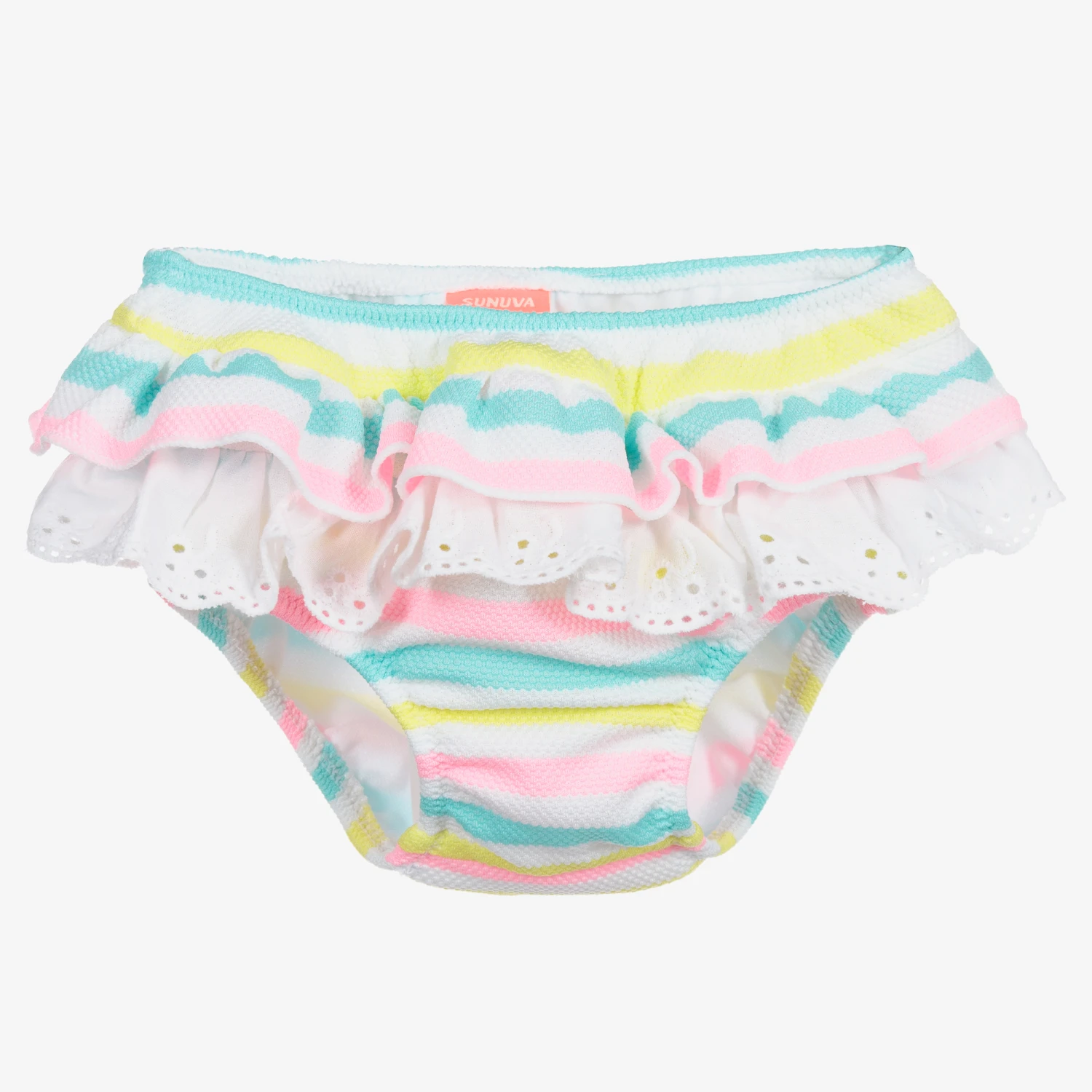 White swim pants for baby girls by Sunuva, with a pink, green and yellow striped pattern. Soft and stretchy with UPF50+ sun protection, validated by The British Skin Foundation, they have pretty striped and broderie anglaise ruffles all the way around. They are fully lined, with room to be worn over a swim nappy.