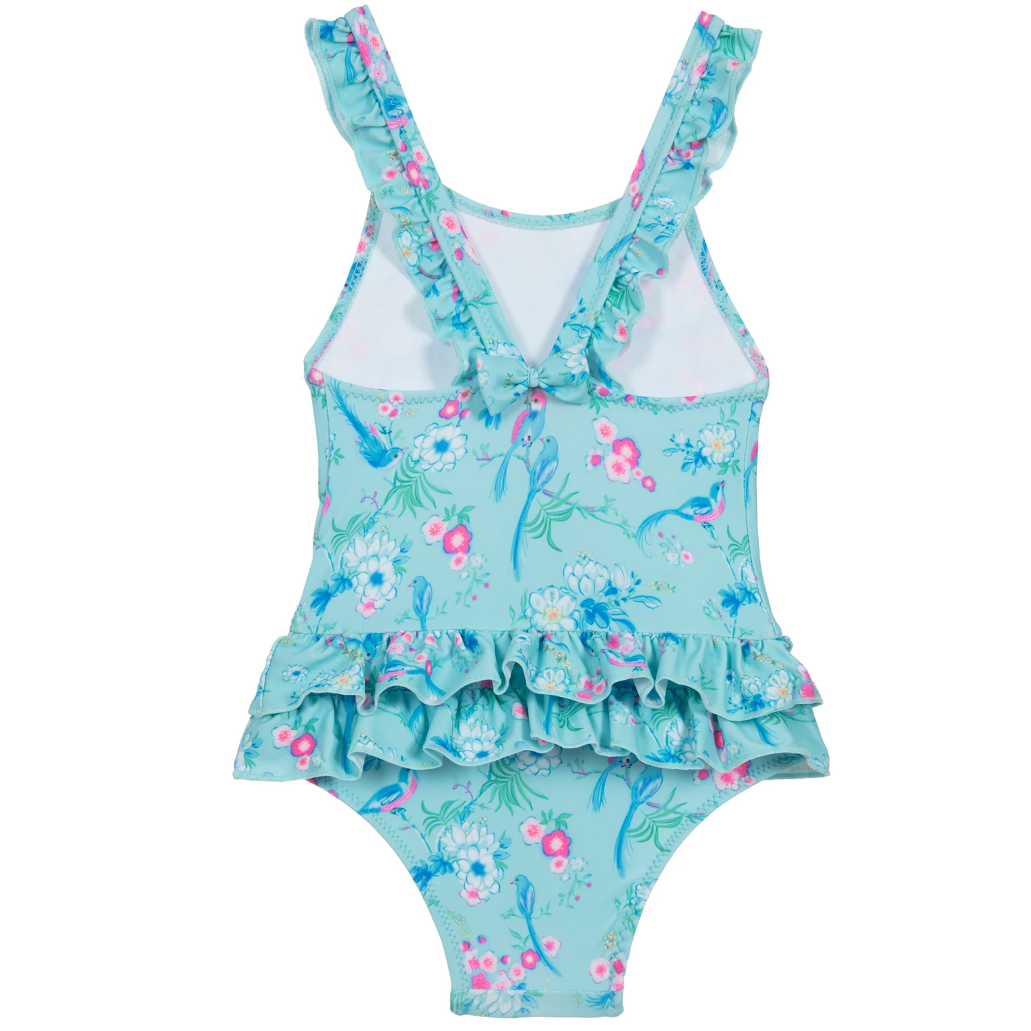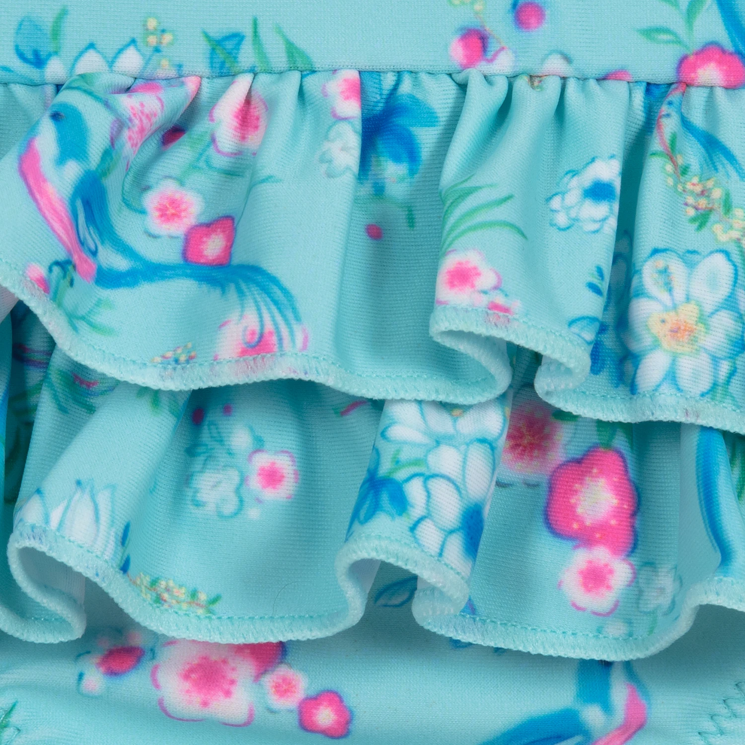 Baby girls turquoise floral swimsuit by Sunuva with UPF50+ sun protection. It is fully lined and has ruffles on the crossover straps and around the hips.