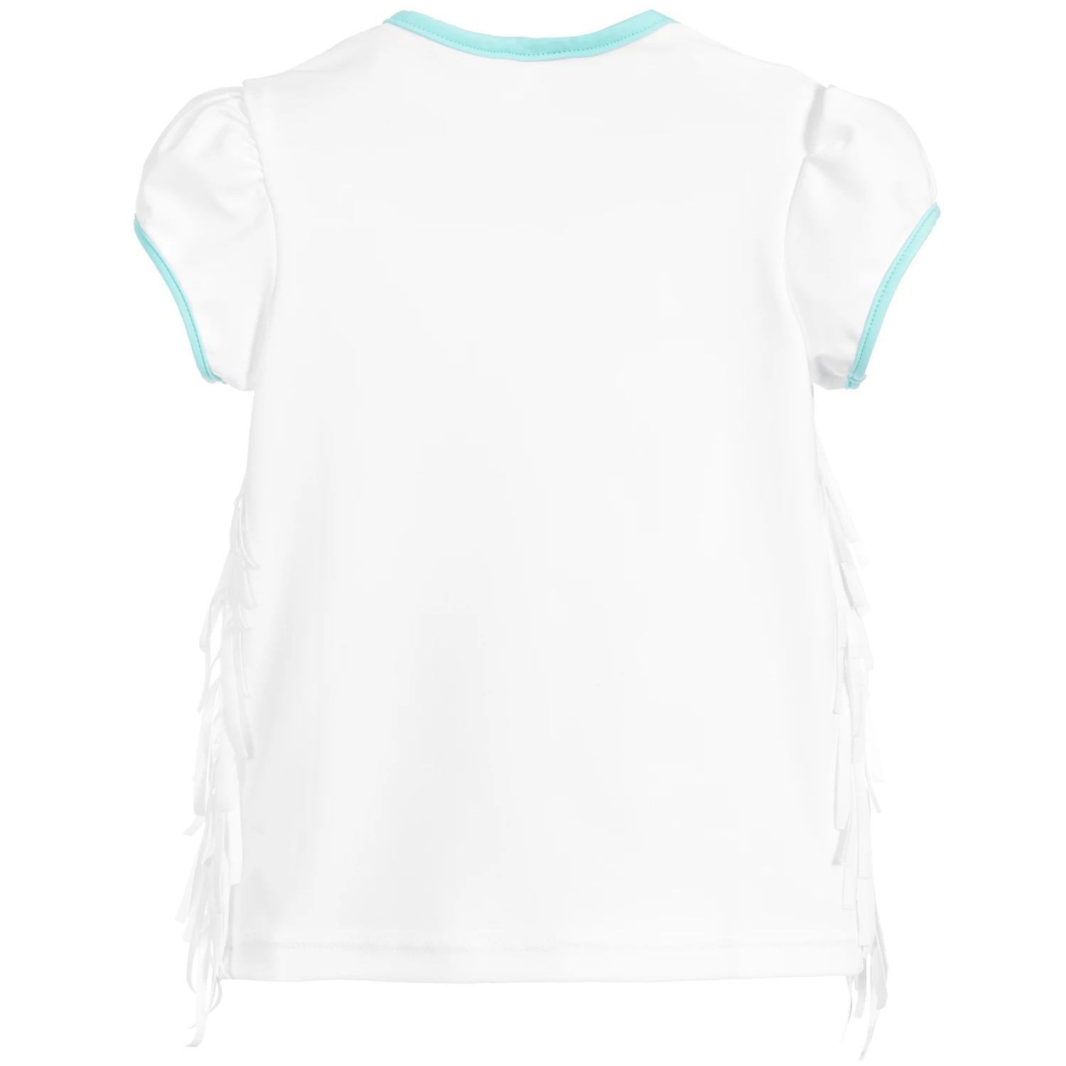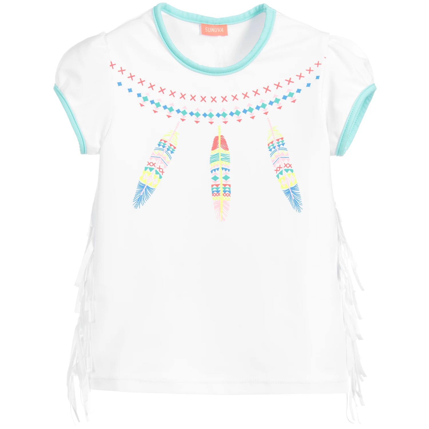 Just right for sunny days, this baby girls T-shirt by Sunuva has a UPF50+ rating. It has a colourful feather pattern print with turquoise trim and pretty fringing along the sides.