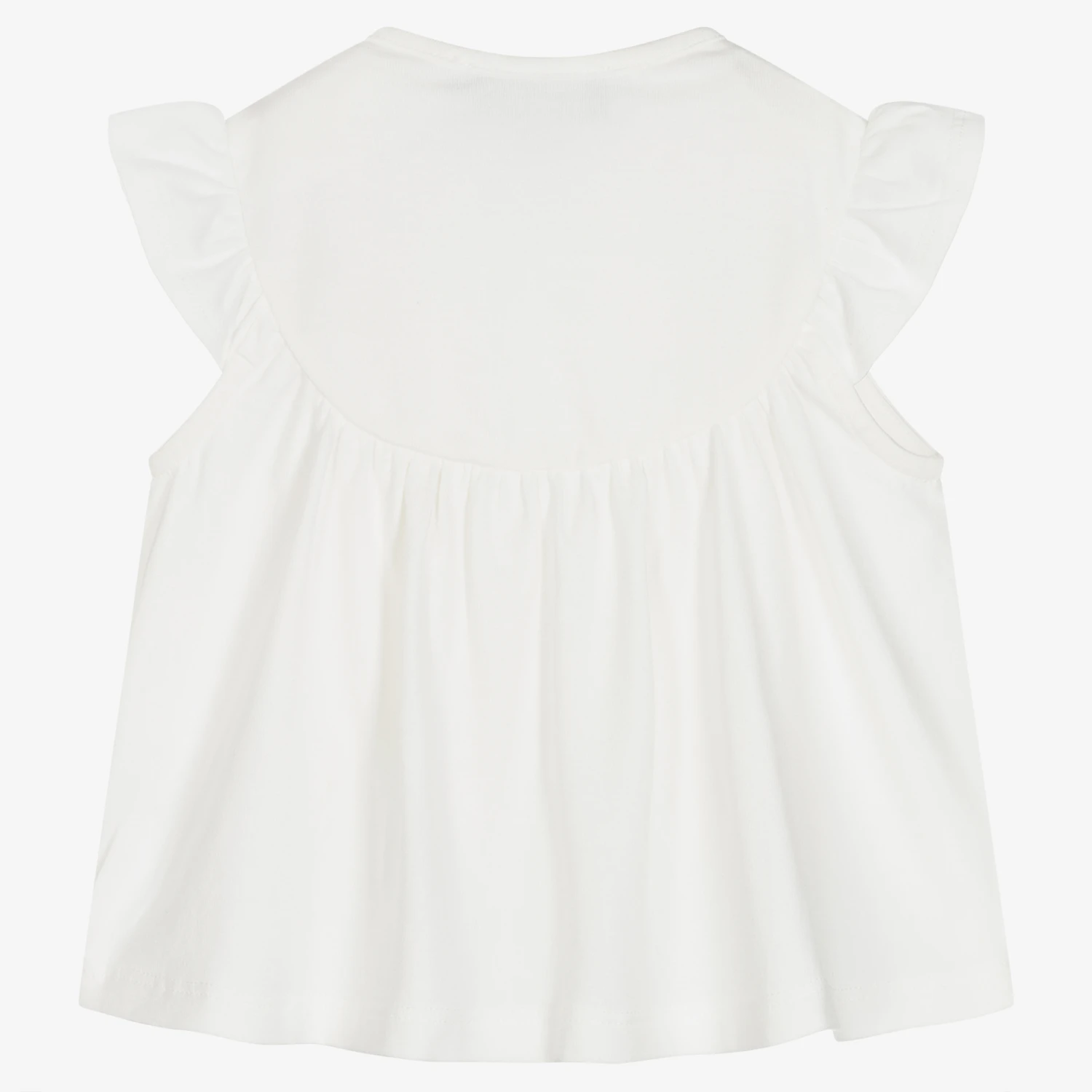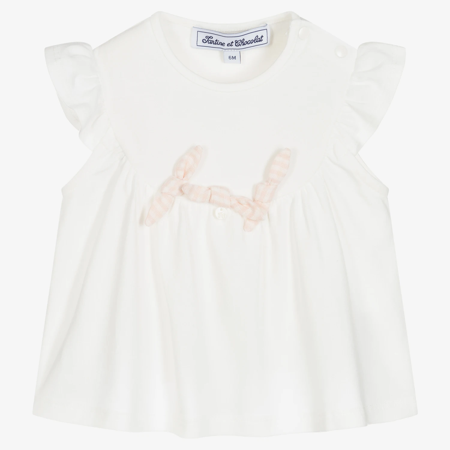 Baby girls ivory blouse from Tartine et Chocolat, made in soft cotton and modal-blend jersey. It has pink and ivory checked bows on the waist and ruffles over the shoulders. There are poppers on one shoulder for easy dressing.