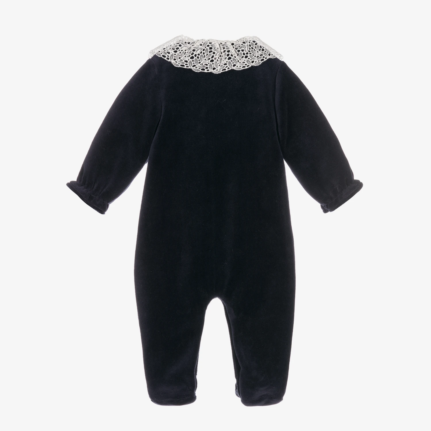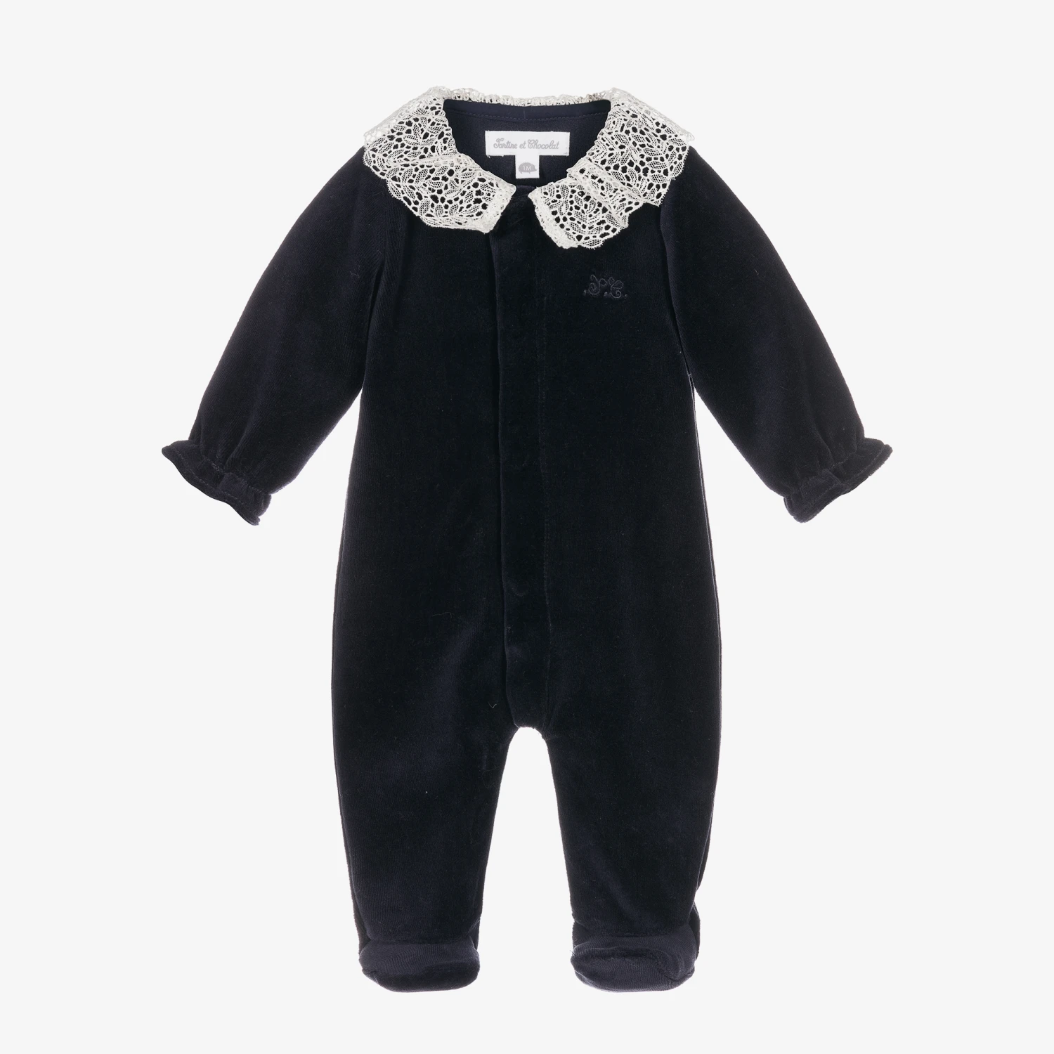 Navy blue babygrow for girls by French brand, Tartine et Chocolat. Made in beautifully soft velour, it has a pretty ivory lace collar and logo embroidery on the chest.