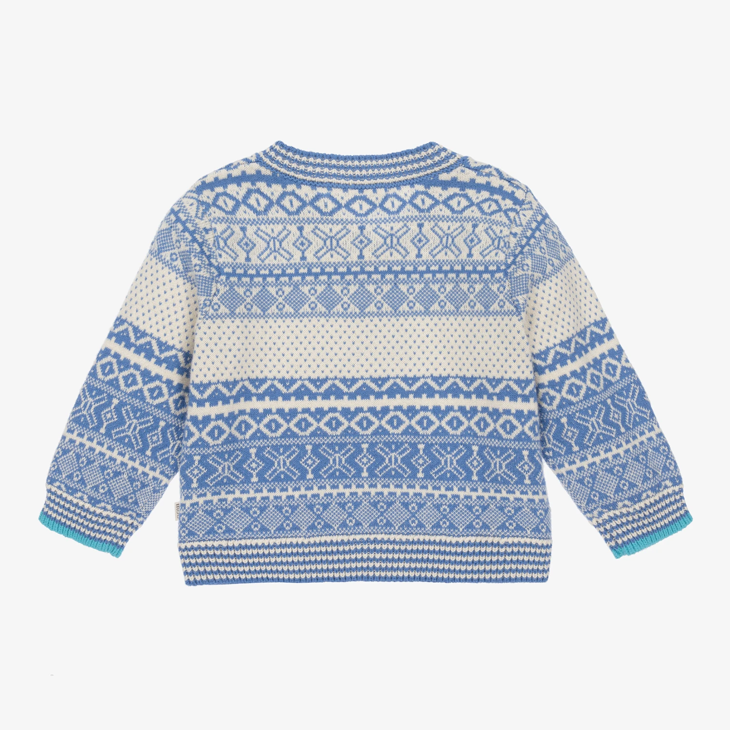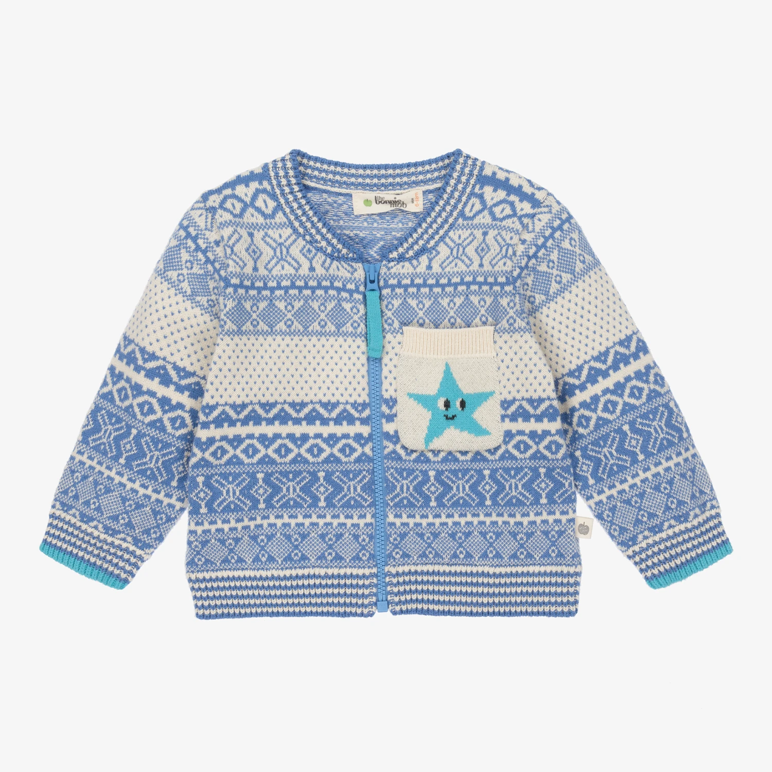 Blue and ivory cardigan for baby boys and girls by The Bonnie Mob, with a lovely Fair Isle pattern. Knitted in a soft organic cotton and cashmere blend, it fastens with a zip down the front. There is a sweet patch pocket on the chest, with a smiling star motif.