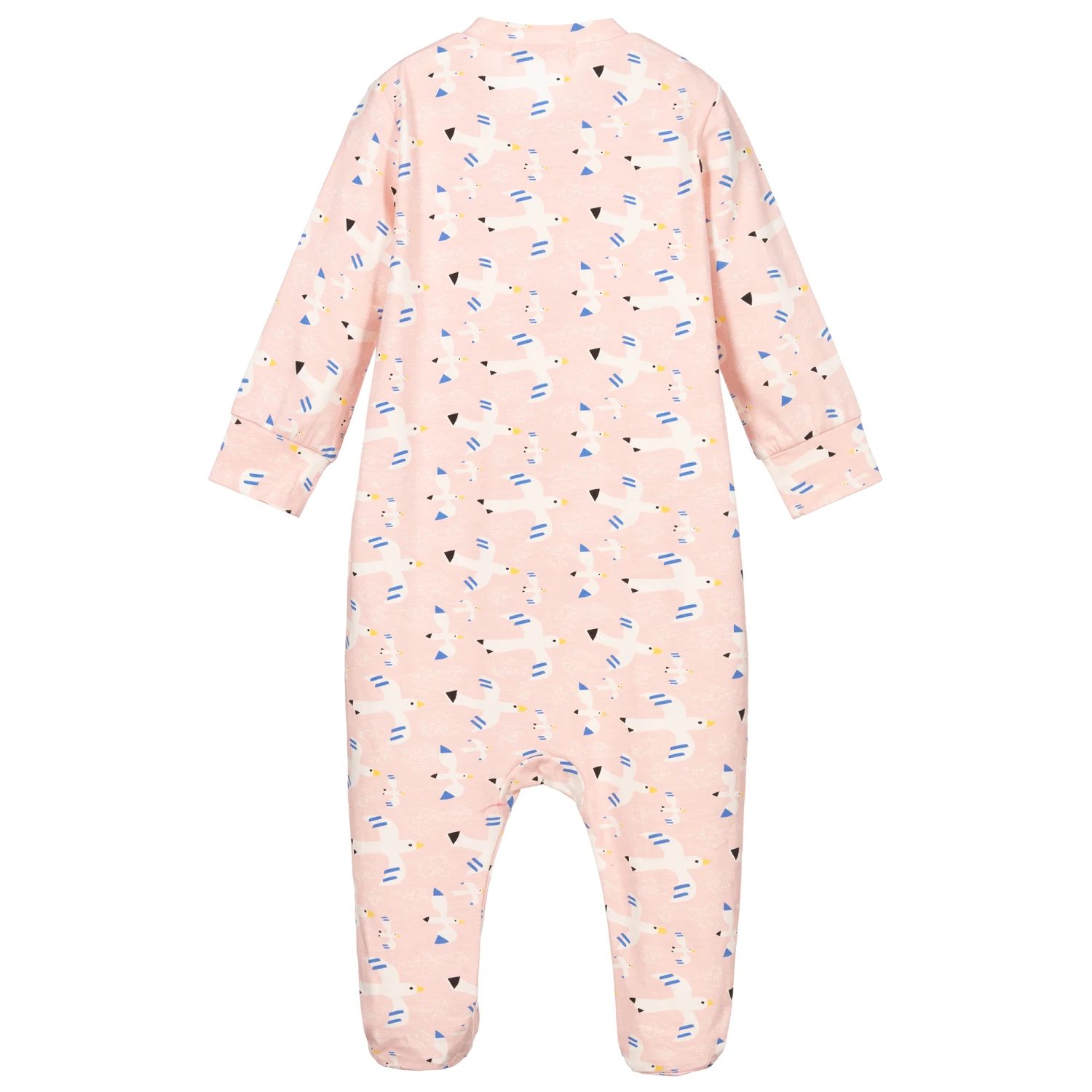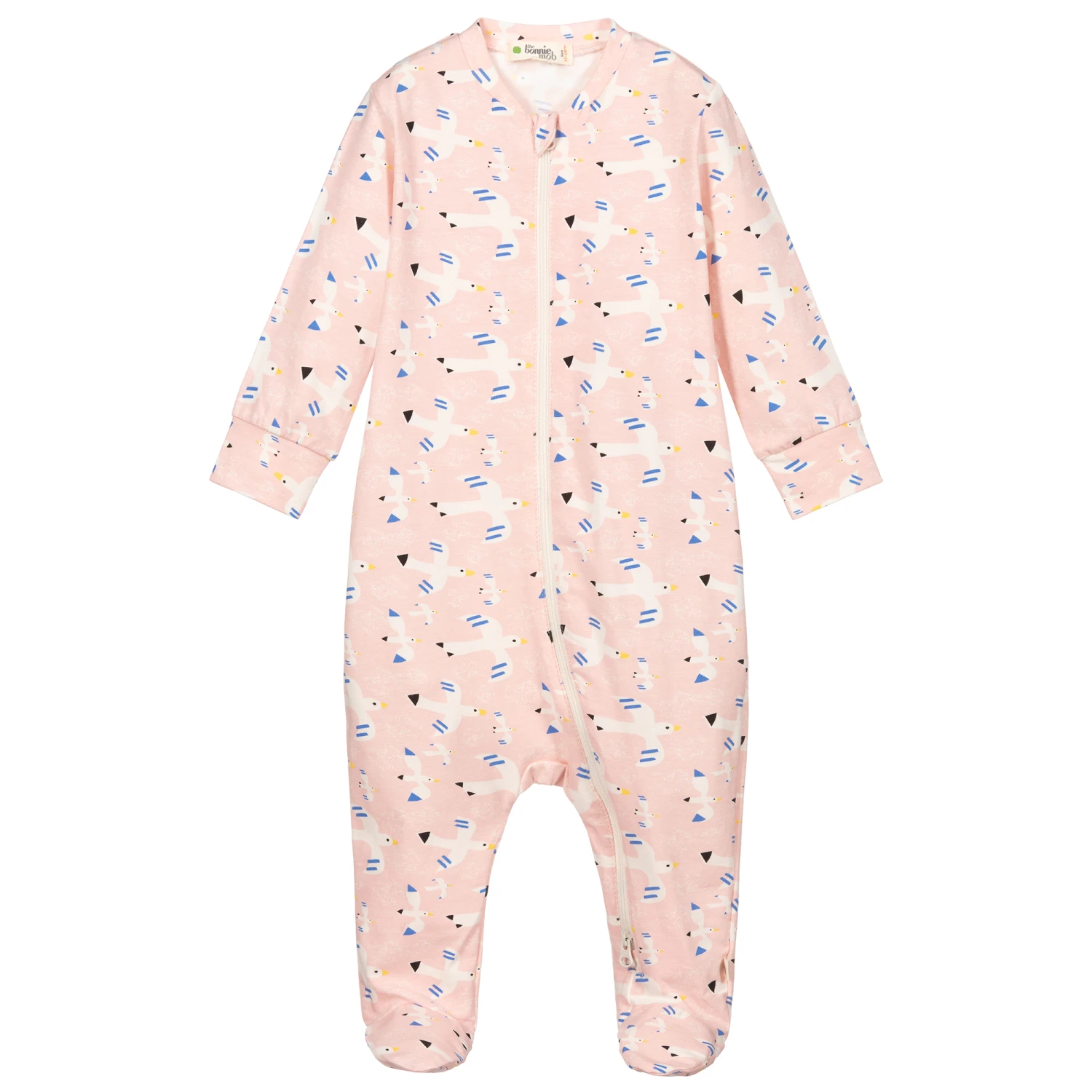 Pink babygrow for girls by The Bonnie Mob, with a fun ivory and blue seagull print. It is made in comfortable organic cotton jersey and has a front zip fastening for easy dressing.