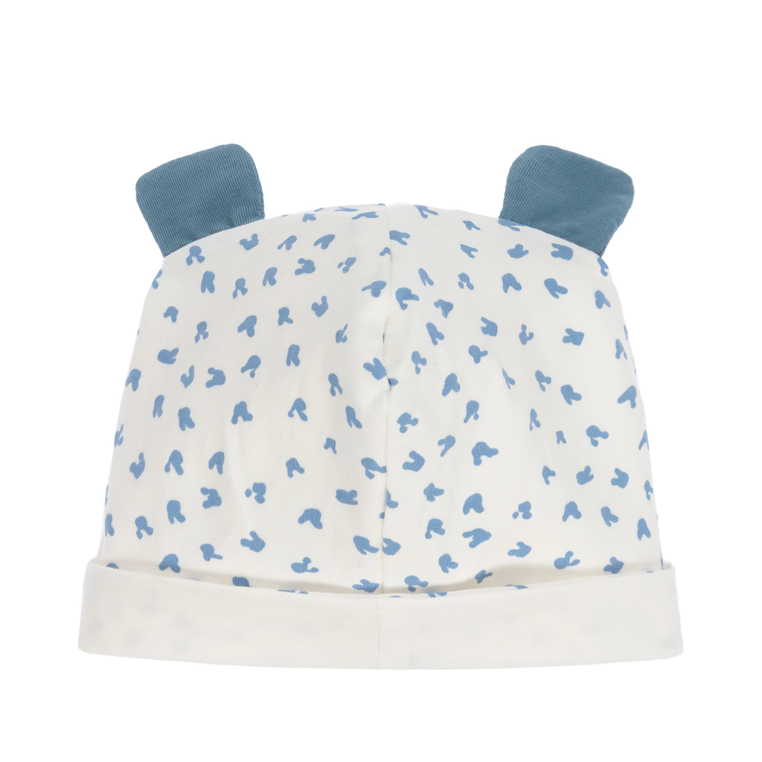 Cute white hat for baby boys and girls by The Bonnie Mob, with blue ears and an abstract blue pattern. Soft and comfortable, it is made in a double layer of organic cotton jersey with a turned-up brim.