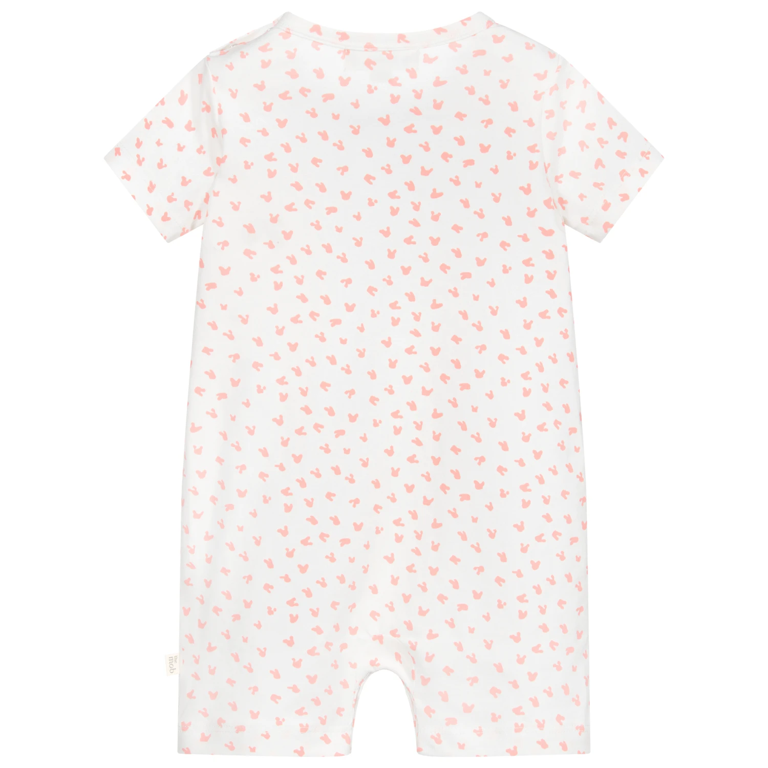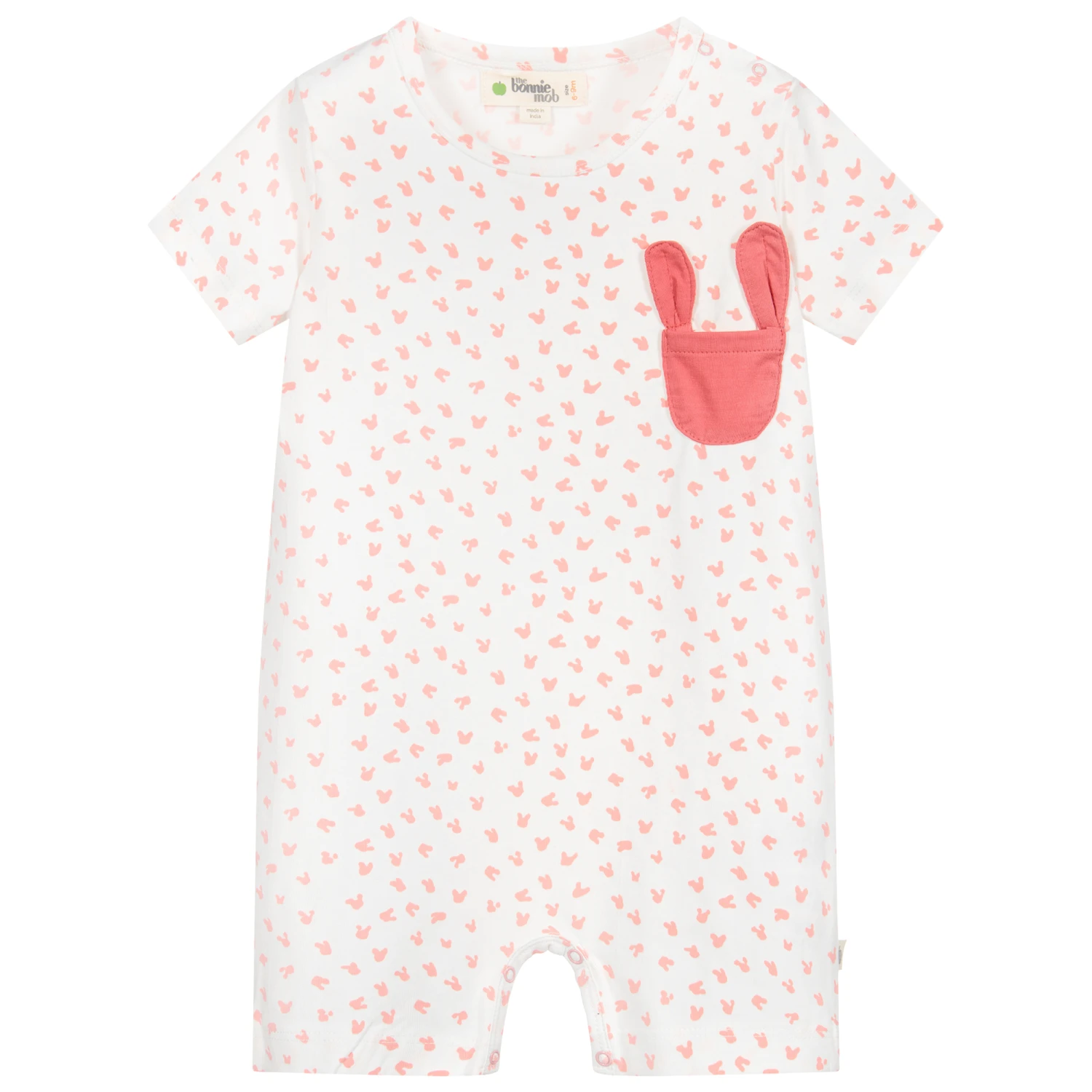 Girls white shortie by The Bonnie Mob, with a pink bunny graphic print. Made from soft organic cotton jersey, this lightweight babysuit has a sweet bunny motif pocket and useful popper fastenings.