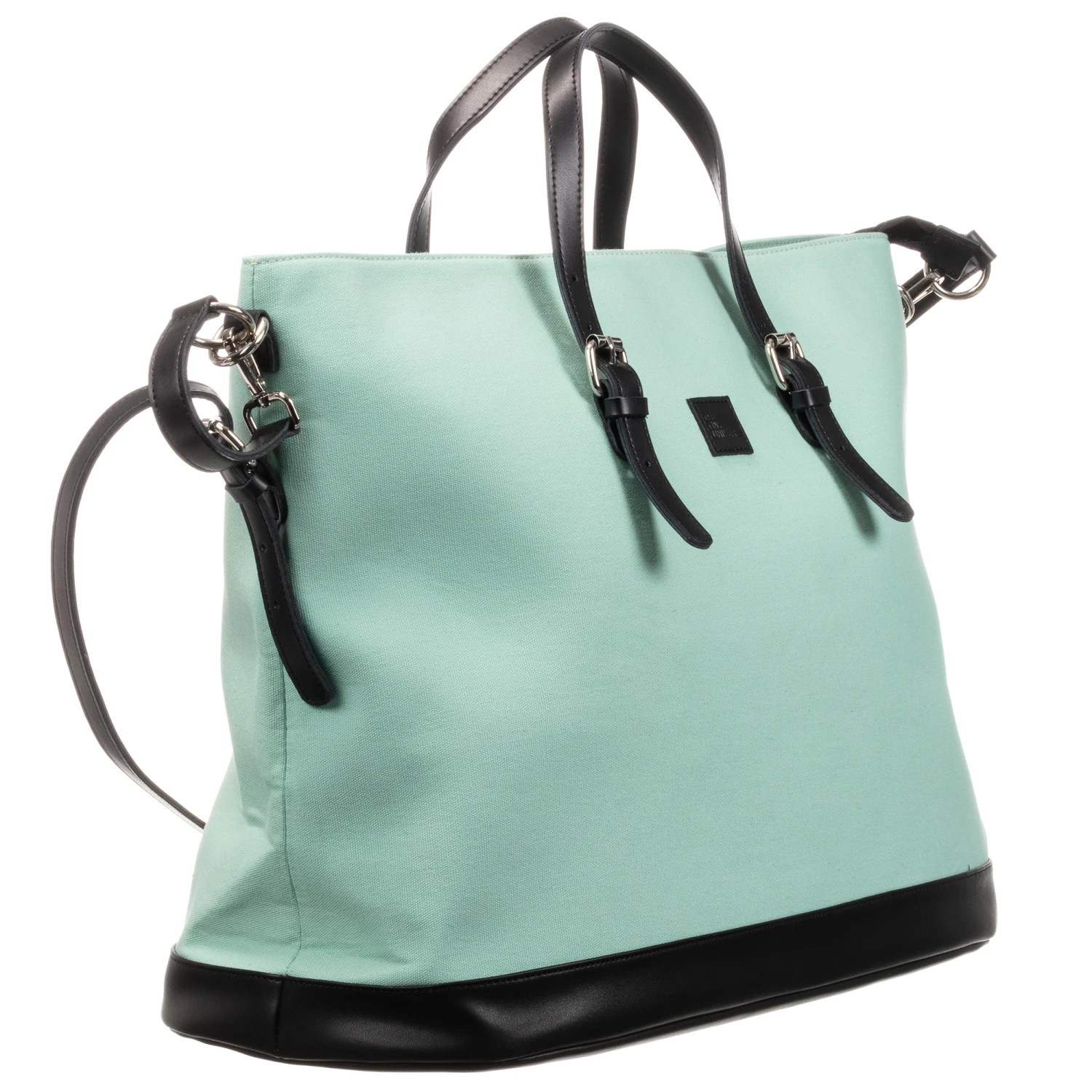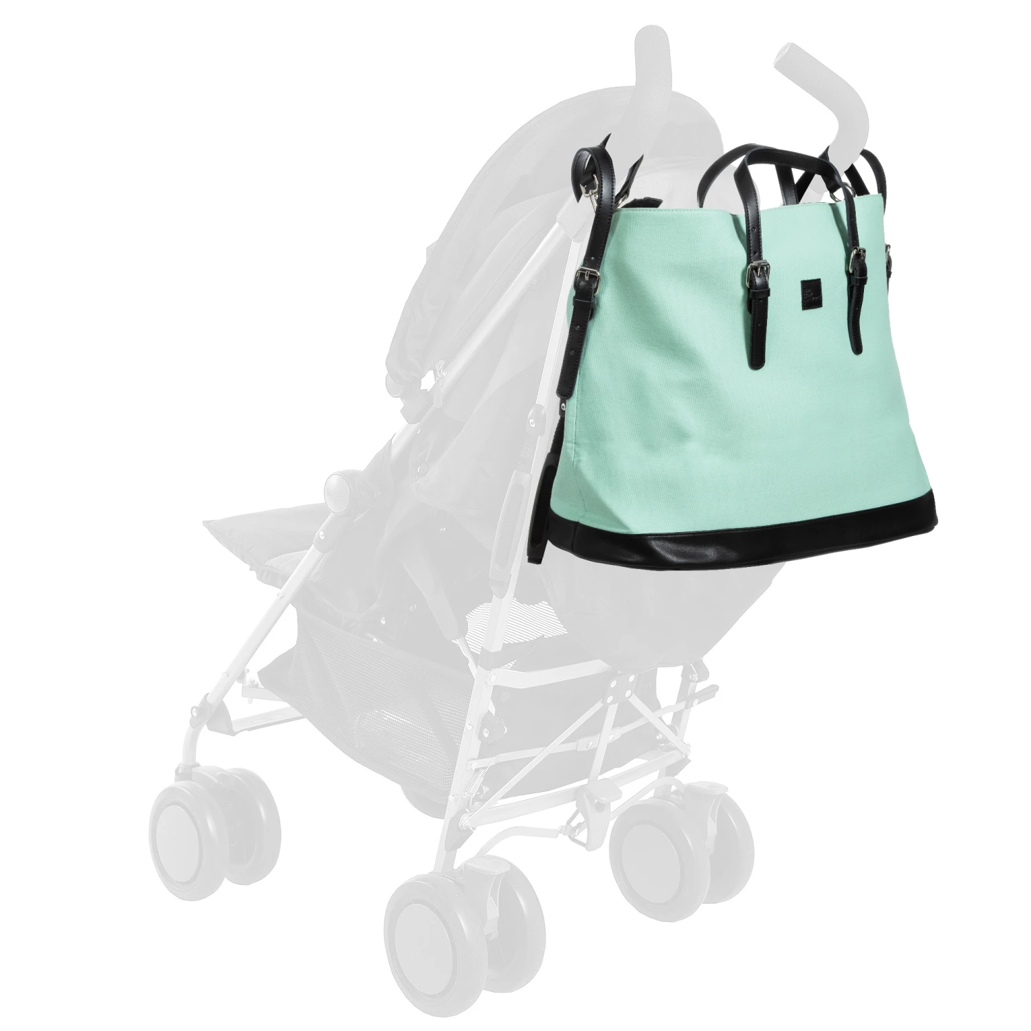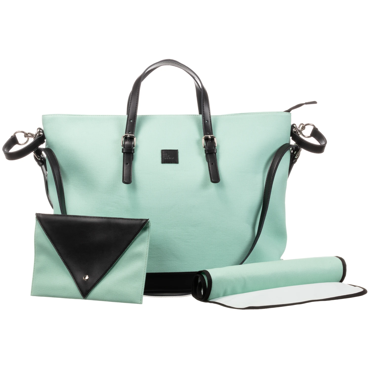 A light green twill baby changing bag by The Tiny Universe. It has black leather trims, adjustable carry handles and loops that may be attached to a buggy or pram with a removable shoulder strap. The bag has a large main body with an inside zip pocket, elasticated internal pockets. It has a matching changing mat and a useful small popper fastening bag.