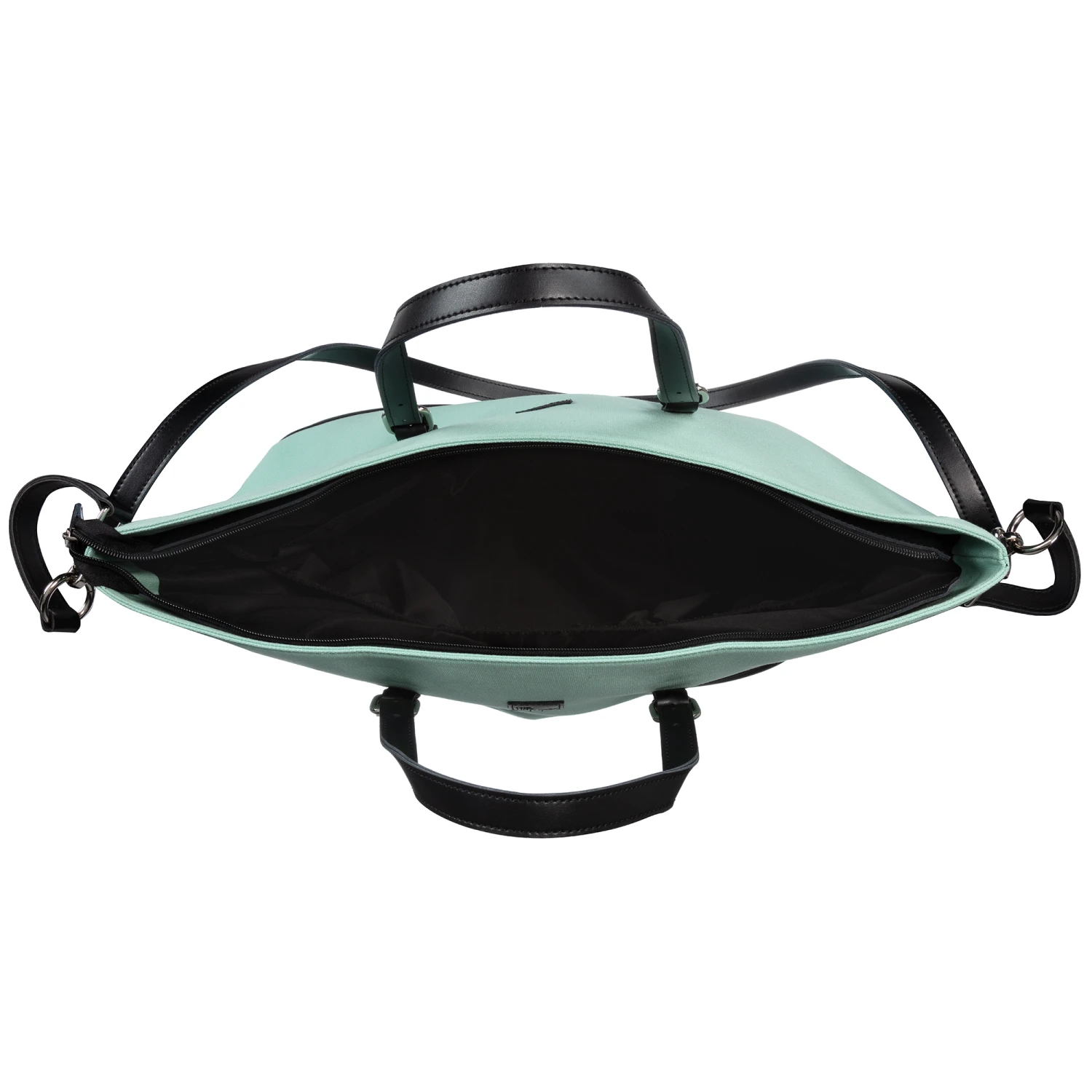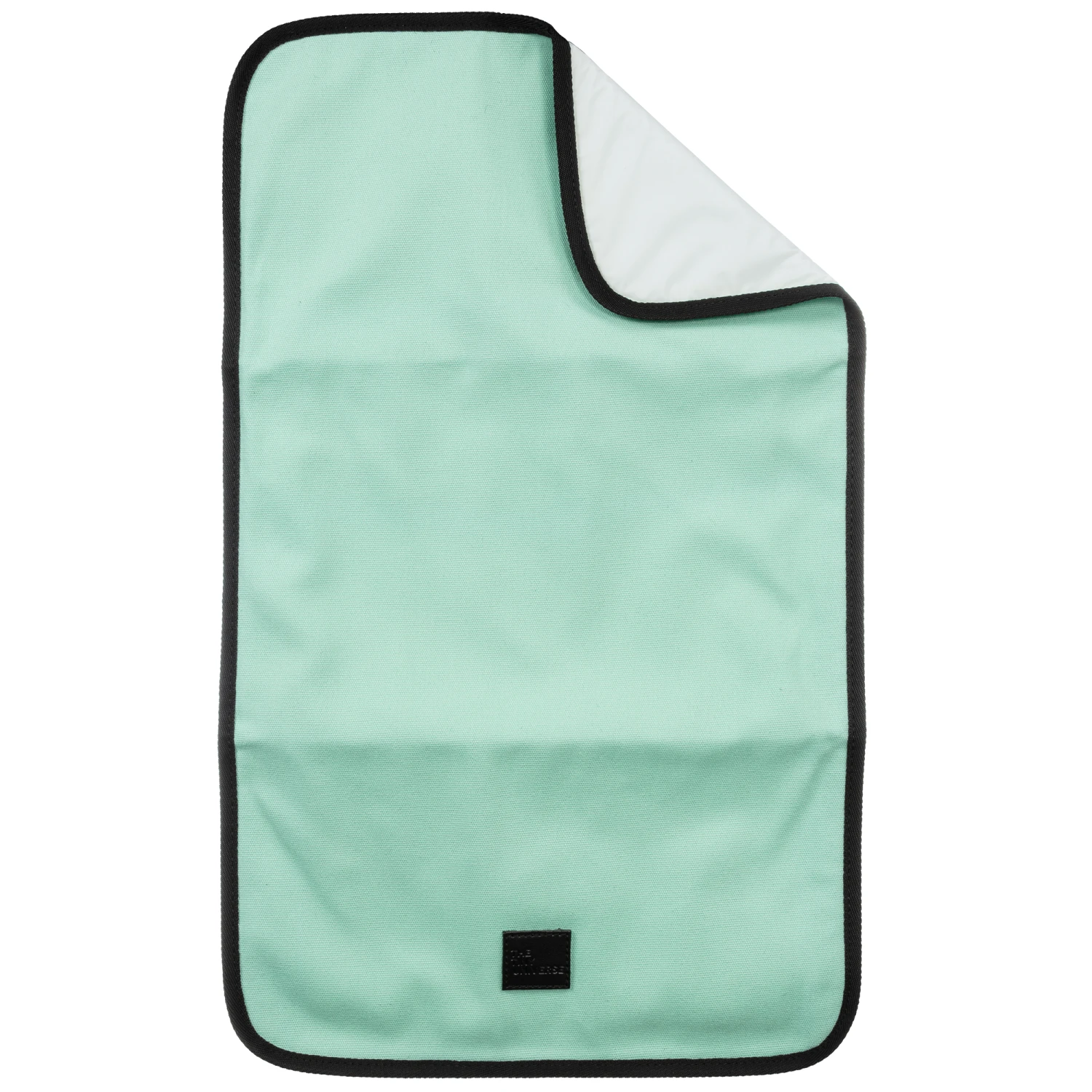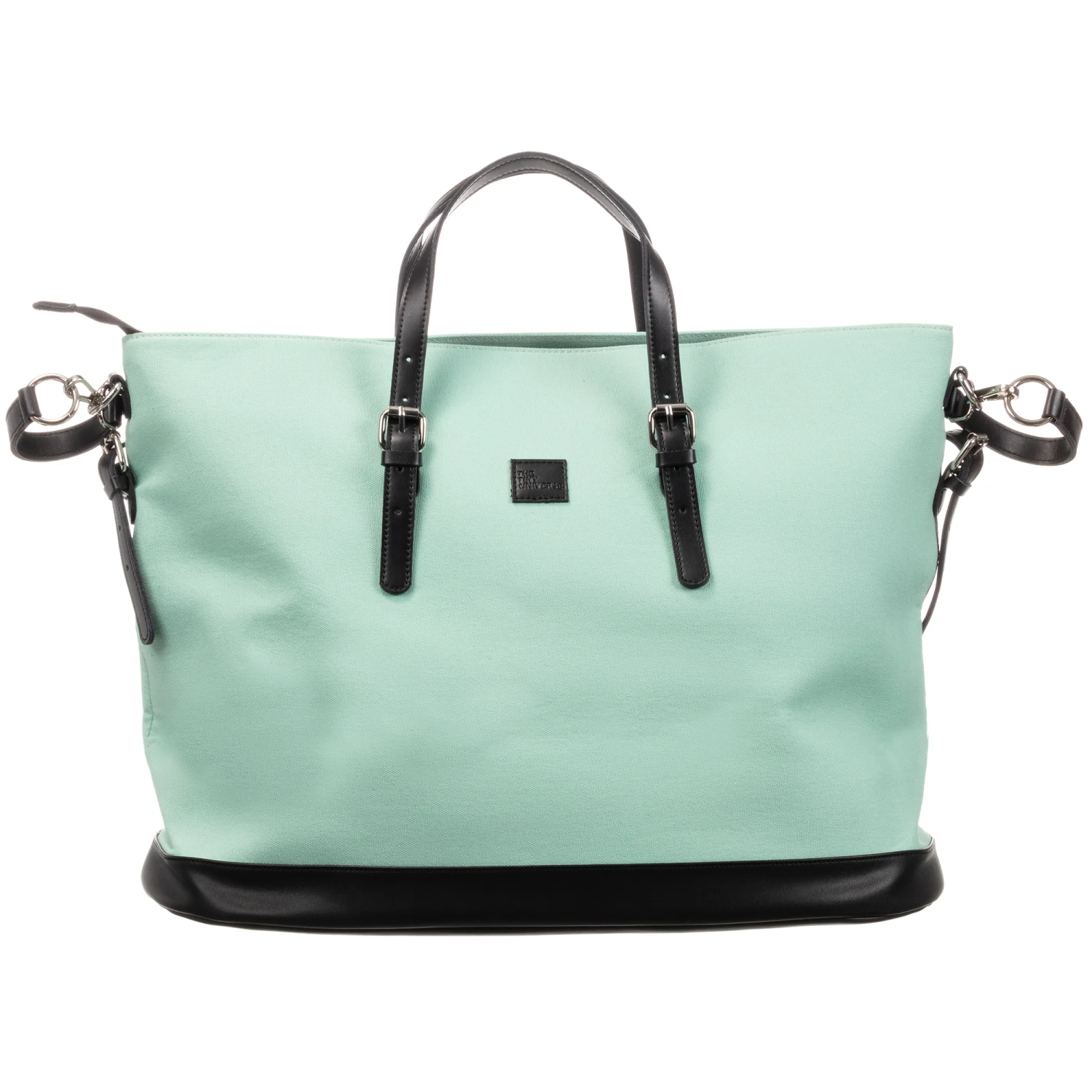 A light green twill baby changing bag by The Tiny Universe. It has black leather trims, adjustable carry handles and loops that may be attached to a buggy or pram with a removable shoulder strap. The bag has a large main body with an inside zip pocket, elasticated internal pockets. It has a matching changing mat and a useful small popper fastening bag.
