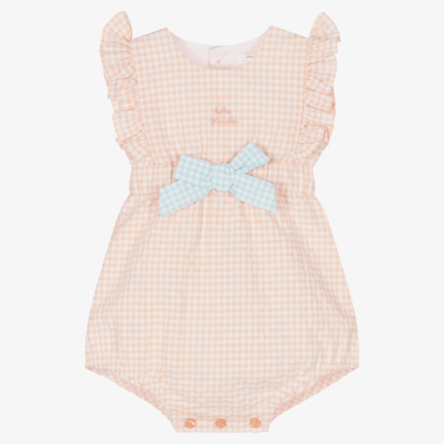 Orange gingham shortie for baby girls by Spanish brand Tutto Piccolo, made in soft cotton seersucker with a partial voile lining. It has an embroidered logo, ruffled trims and a blue bow appliqué for a touch of heritage charm. There is an elasticated waistband, with button fastenings on the back and between the legs.