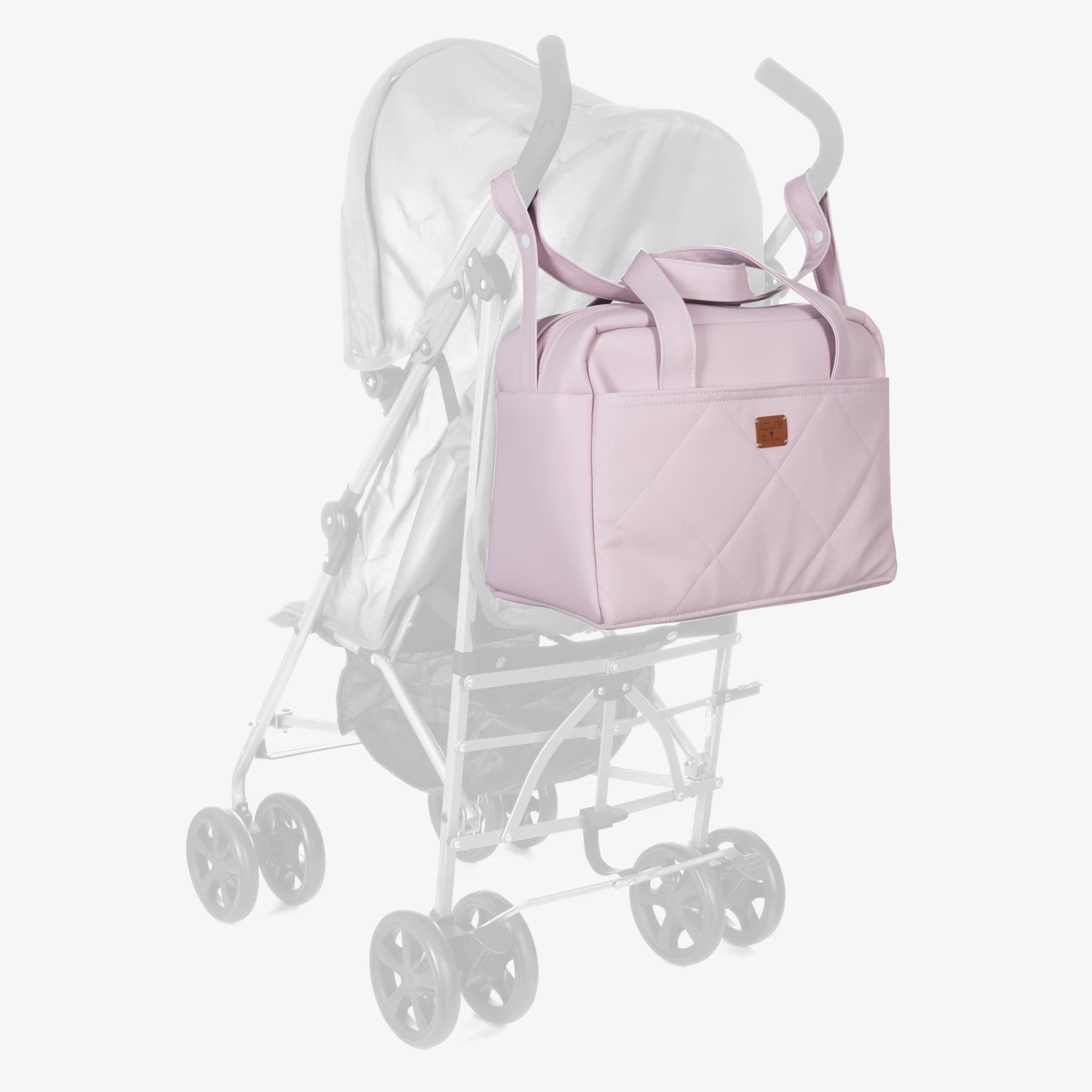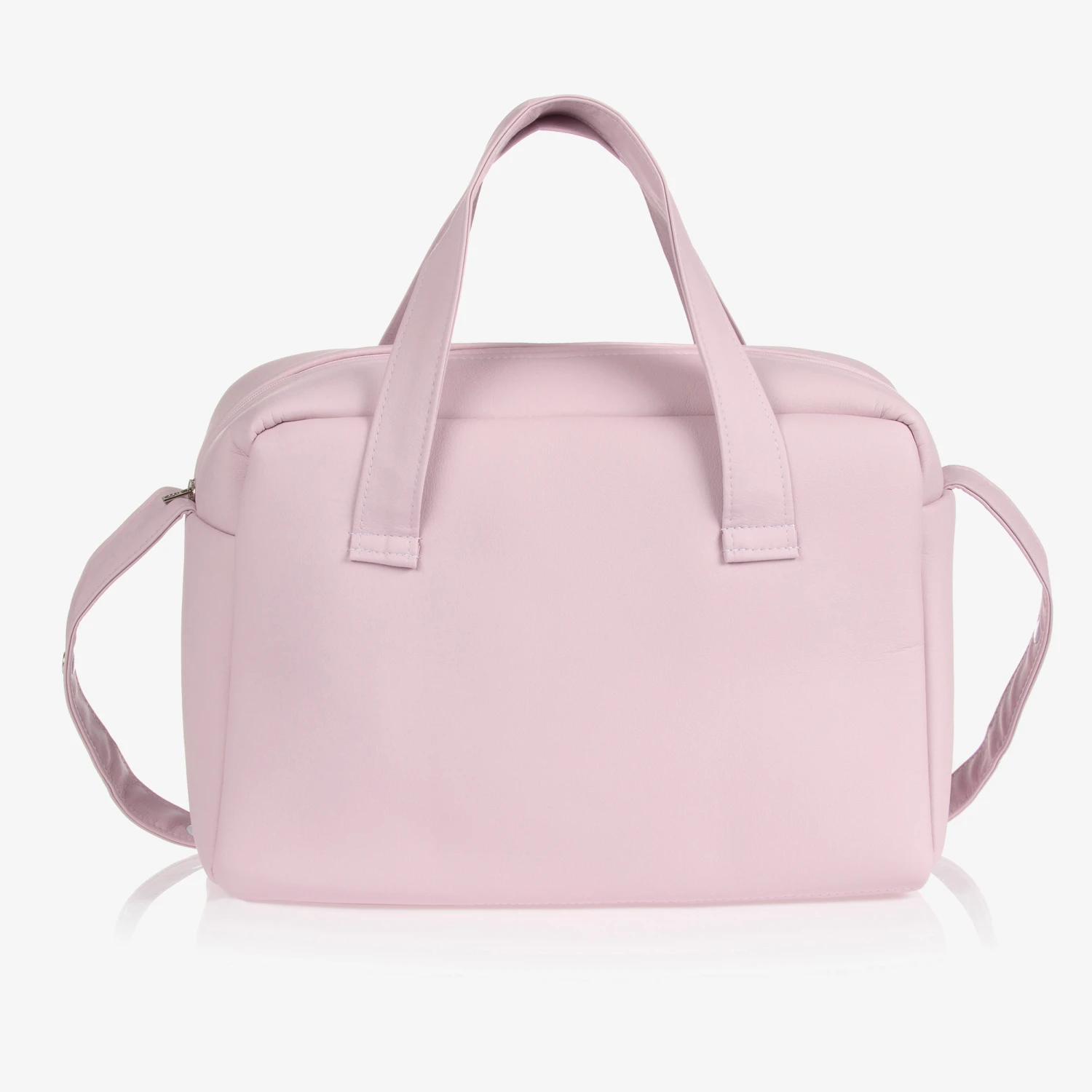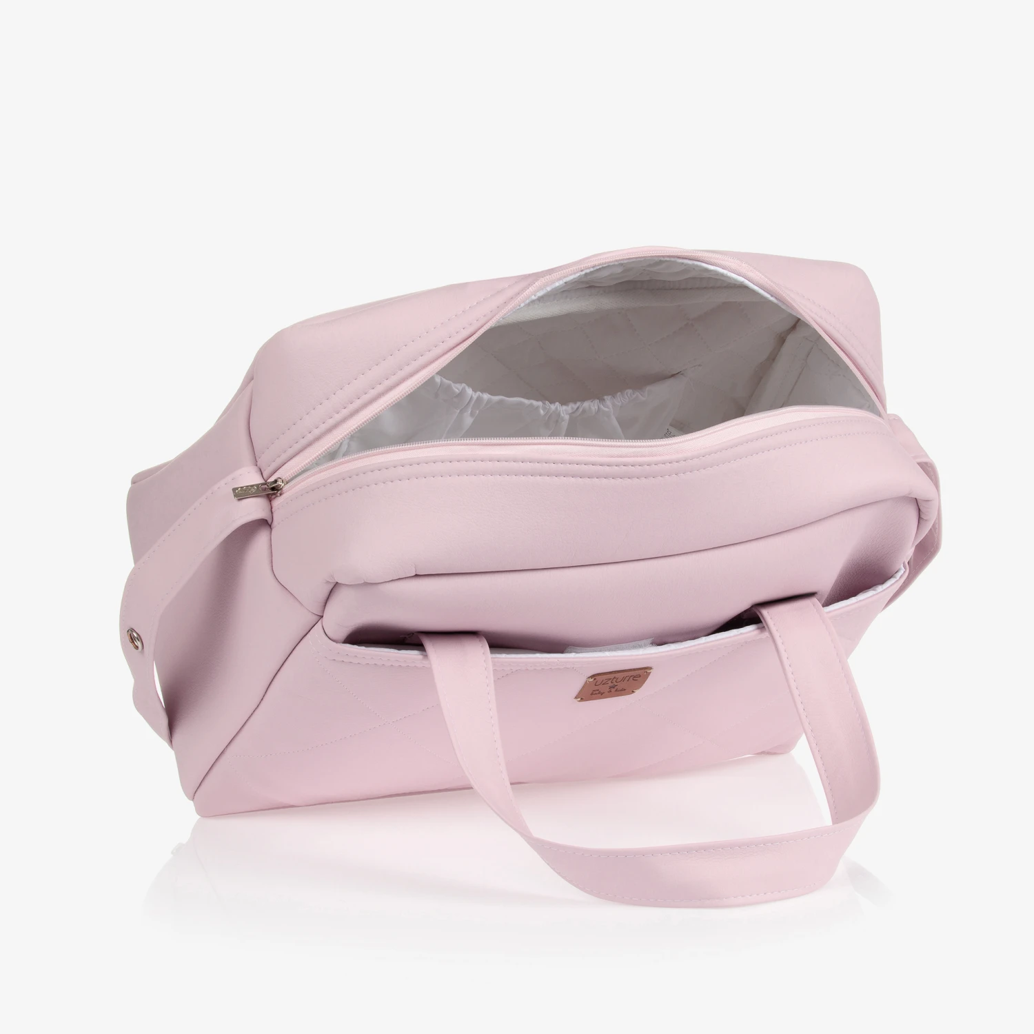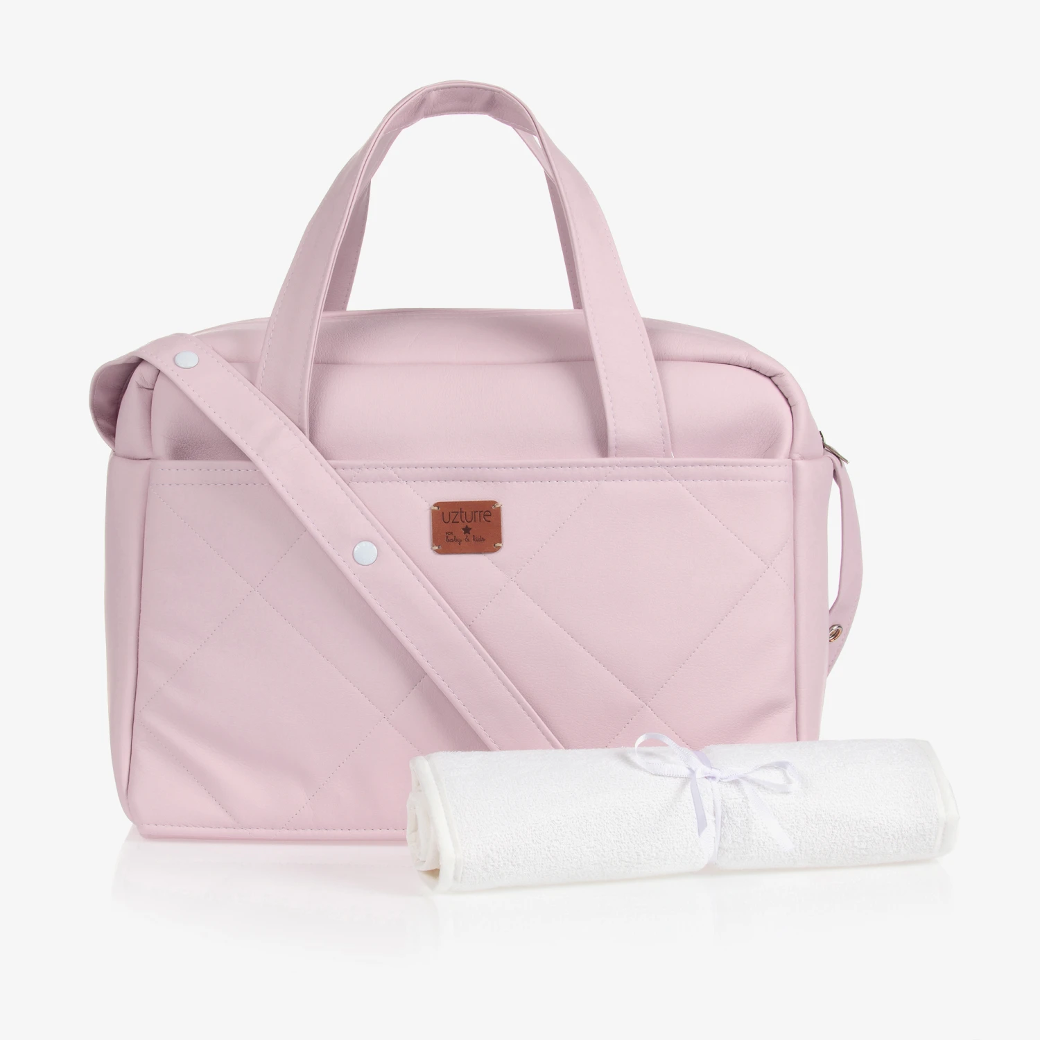 Pink changing bag by Spanish brand Uzturre, made in soft faux leather. The main zipped compartment has an internal pocket and elasticated straps. There is a large external pocket with a quilted pattern and brown logo patch. It has carry handles, an adjustable shoulder strap and comes with a changing mat.