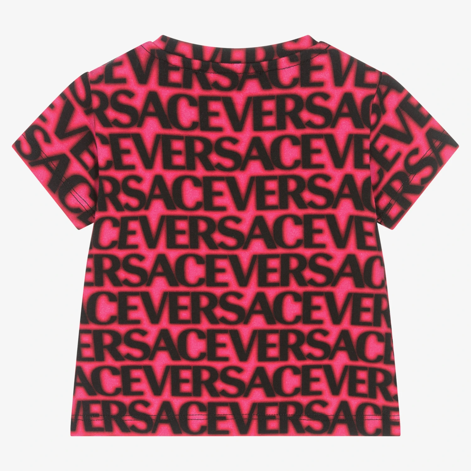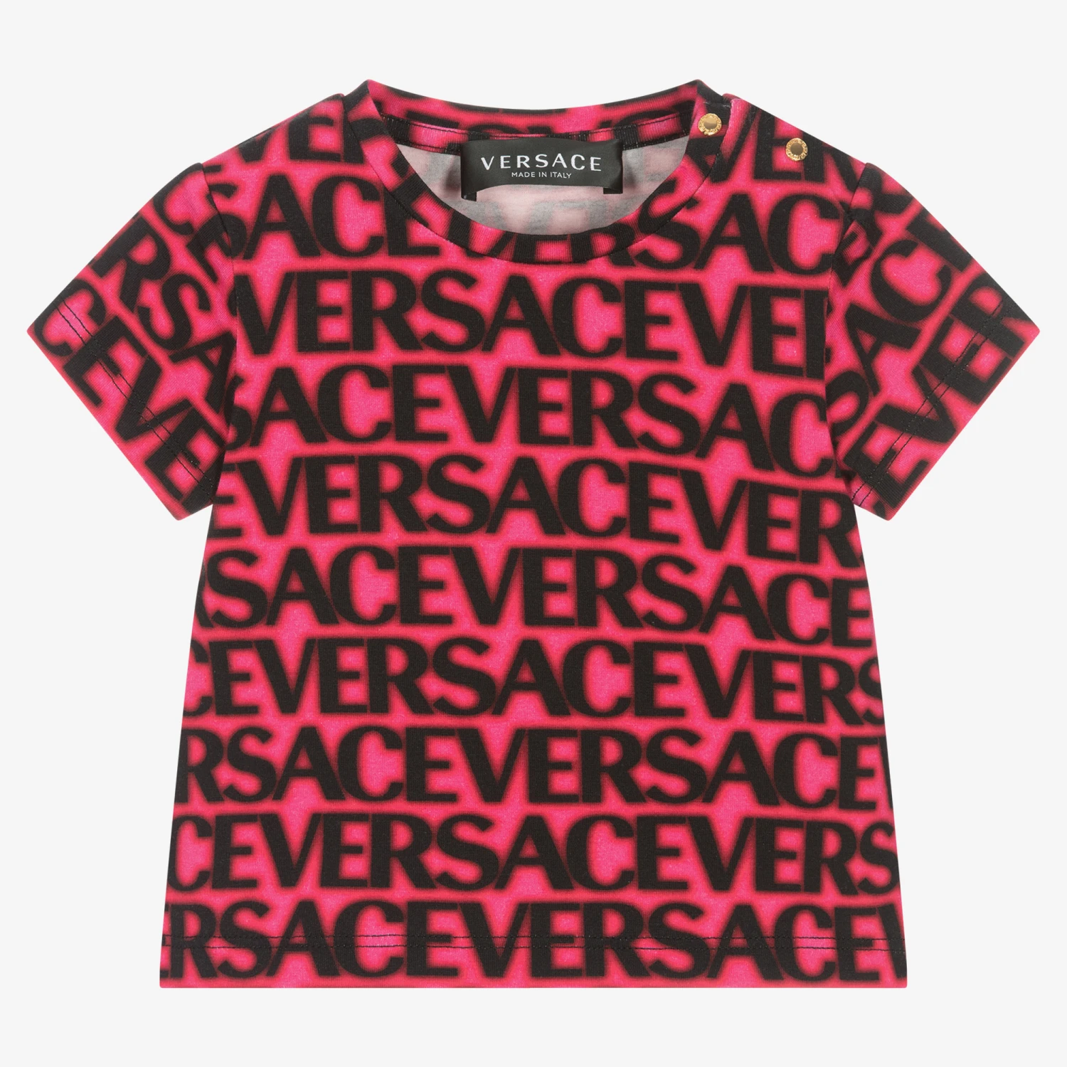 Fuchsia pink T-shirt for baby girls by luxury Italian brand Versace. Made in soft and comfortable cotton jersey, this statement top features a black blurred-effect Versace logo all over. There are Greca embossed gold poppers on the shoulder to assist with dressing.
