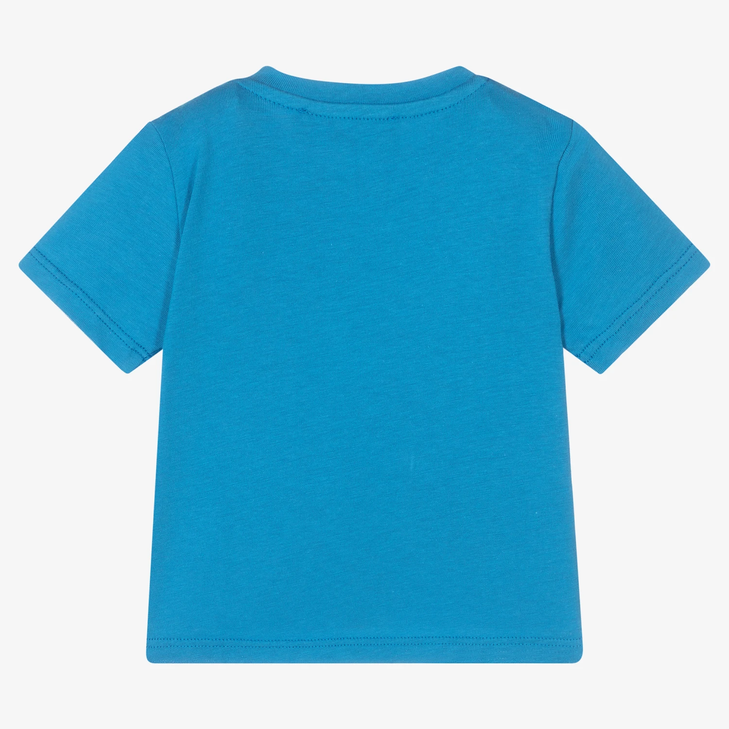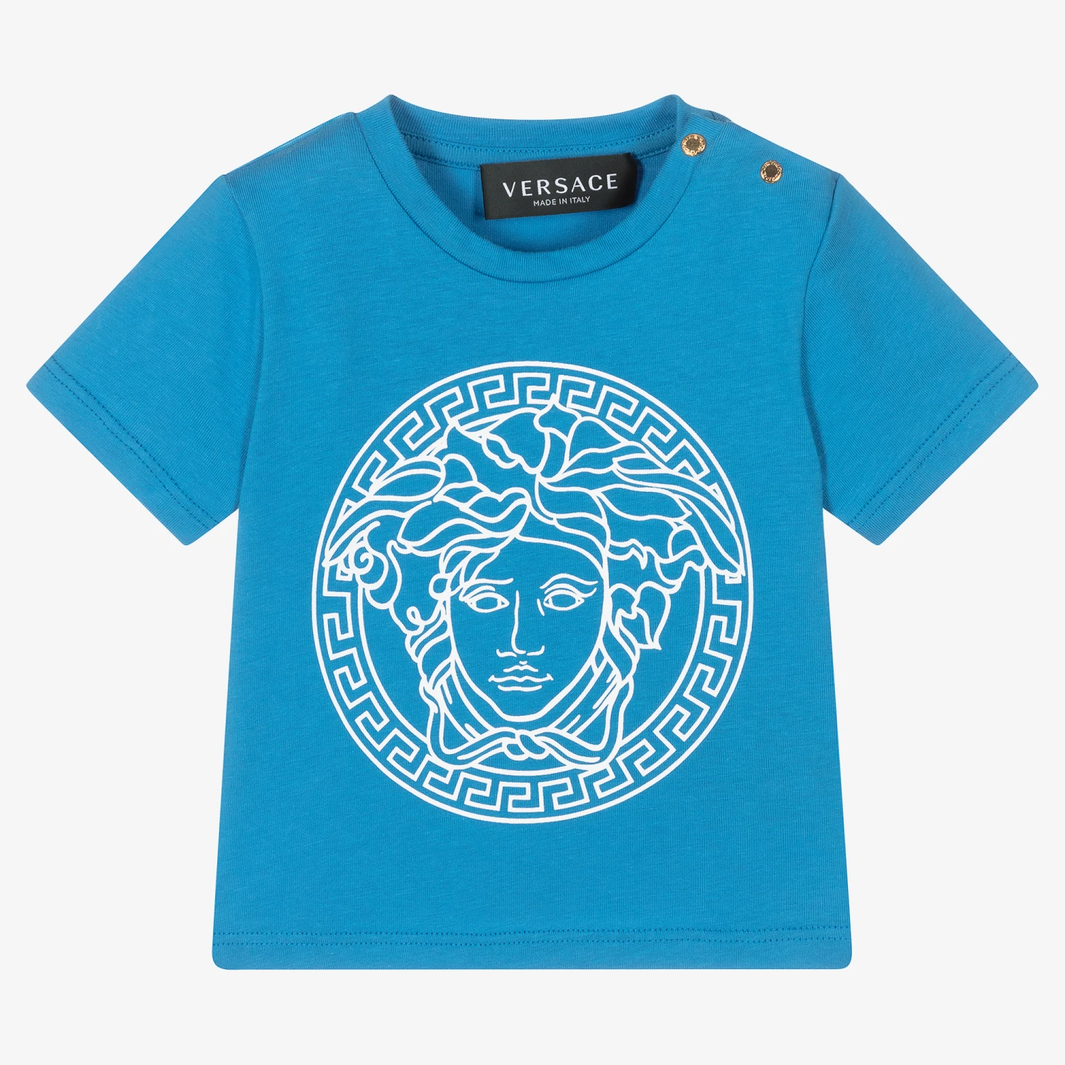 Mid-blue cotton T-shirt for baby boys and girls, unmistakably by luxury Italian designer Versace with the brand’s iconic Medusa and Greca logos printed on the front in white. It is made in stretchy jersey, just right for all-day comfort, and has golden logo poppers on one shoulder for easy dressing.