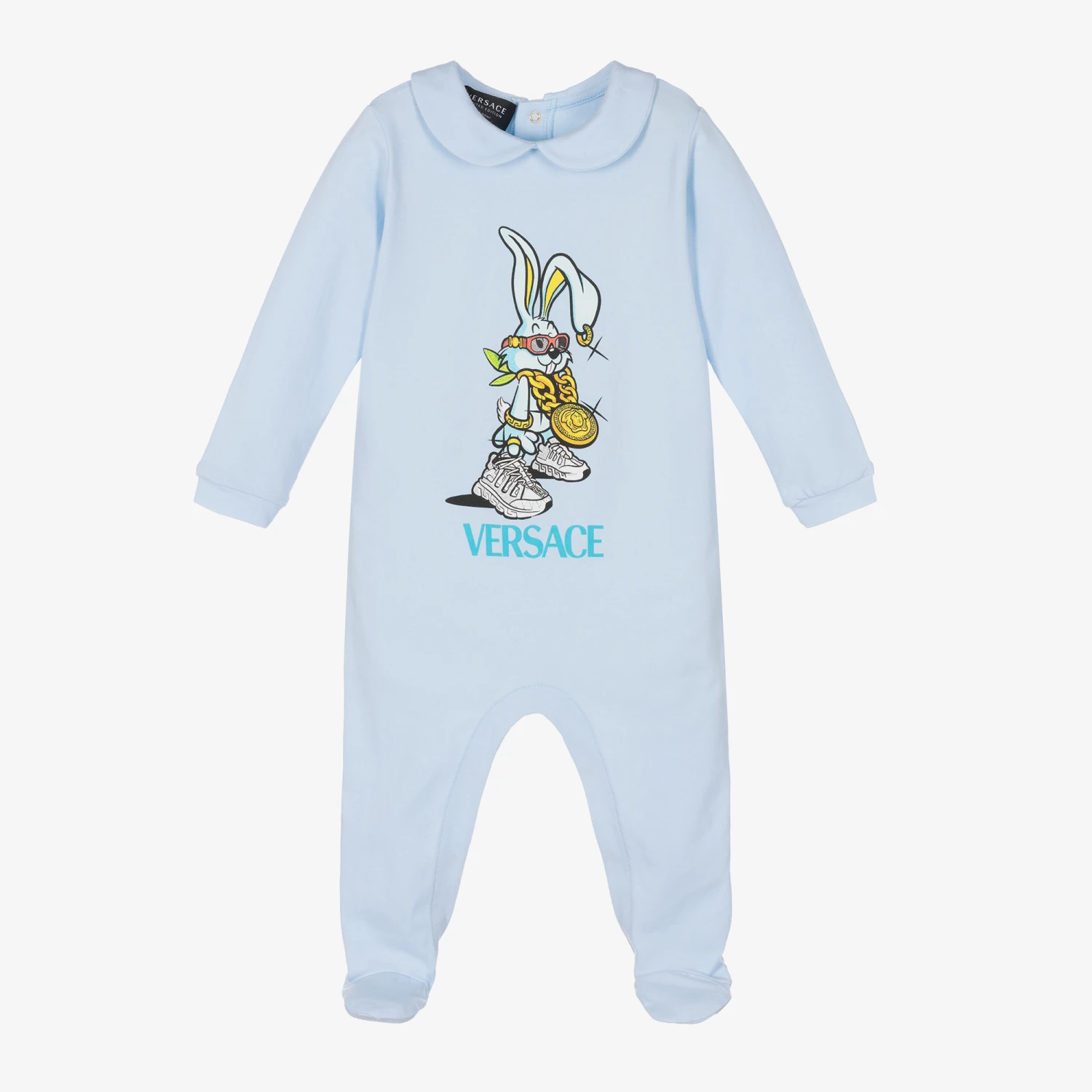 Pale blue babygrow for boys by luxury Italian brand Versace, made in an exquisitely soft cotton jersey. This babygrow is printed with the iconic Biggie Bunny logo. It has a Peter Pan collar, gold logo-embossed popper fastenings on the back, and concealed popper fastenings between the legs.