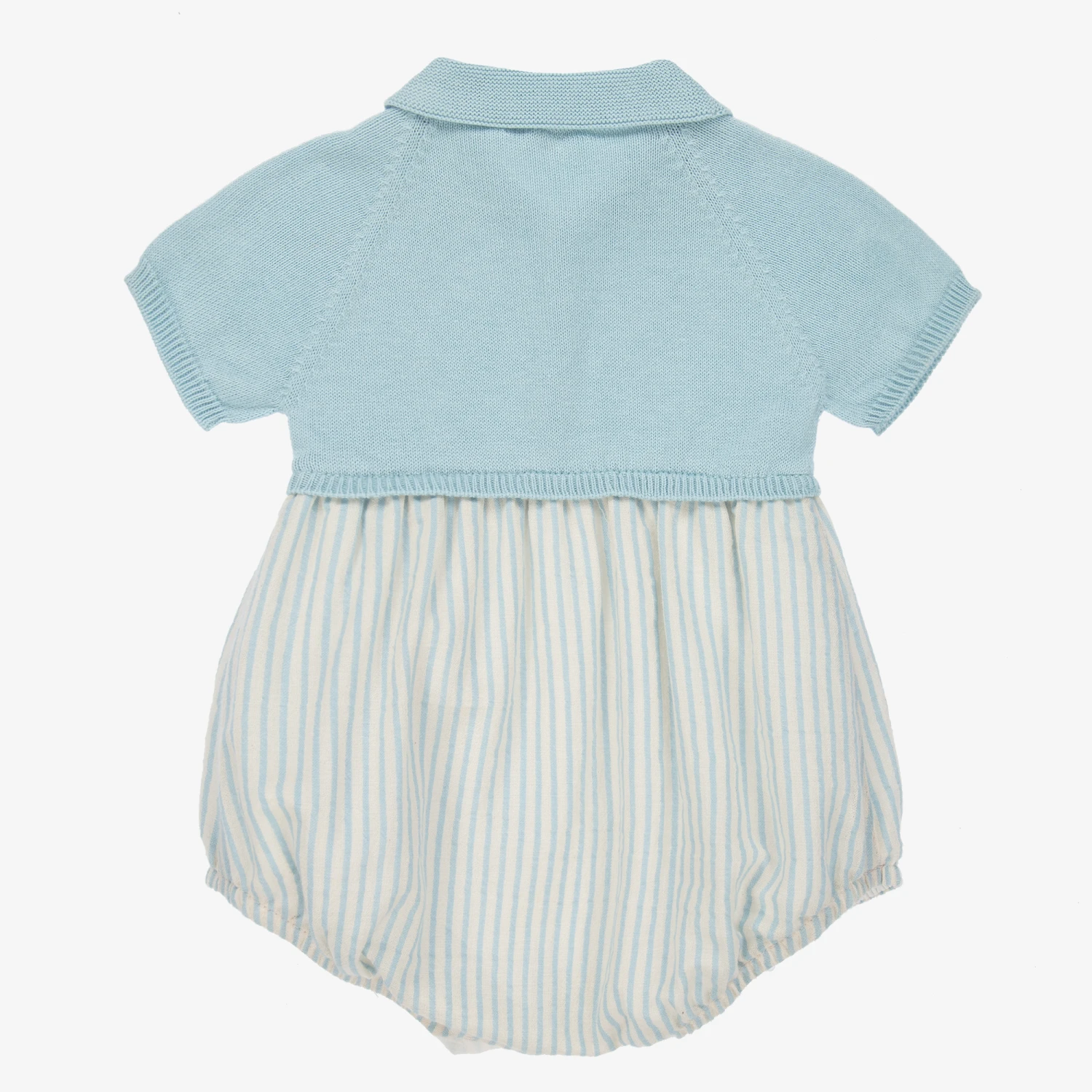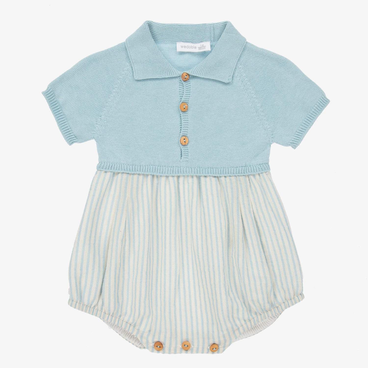 Adorable cotton shortie for baby boys by Wedoble. The pale blue top is softly knitted, with a sweet collar and wooded button fastenings on the front. The blue and ivory striped bottom part is made with organic cotton. It has a lightweight lining and button fastenings between the legs.